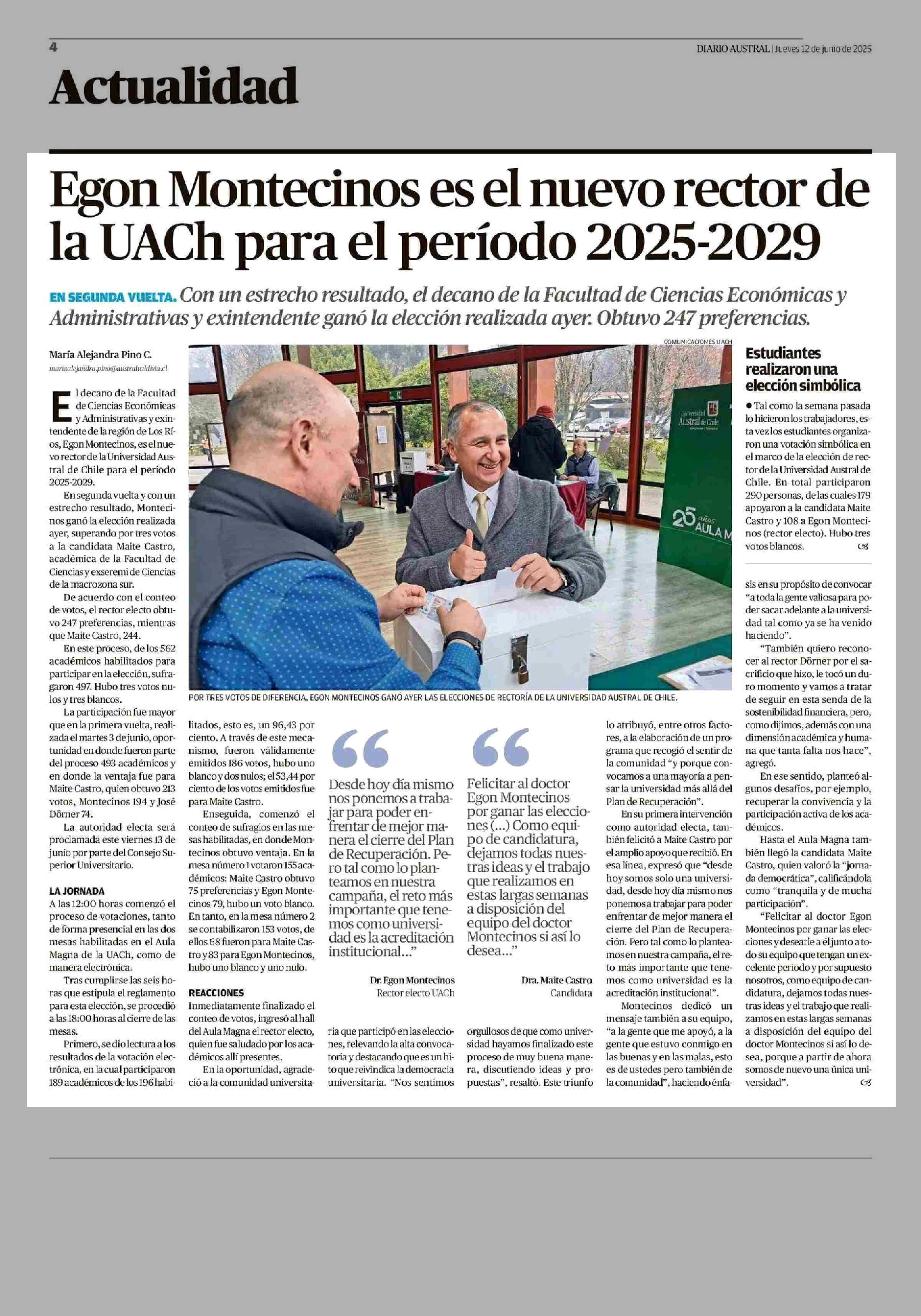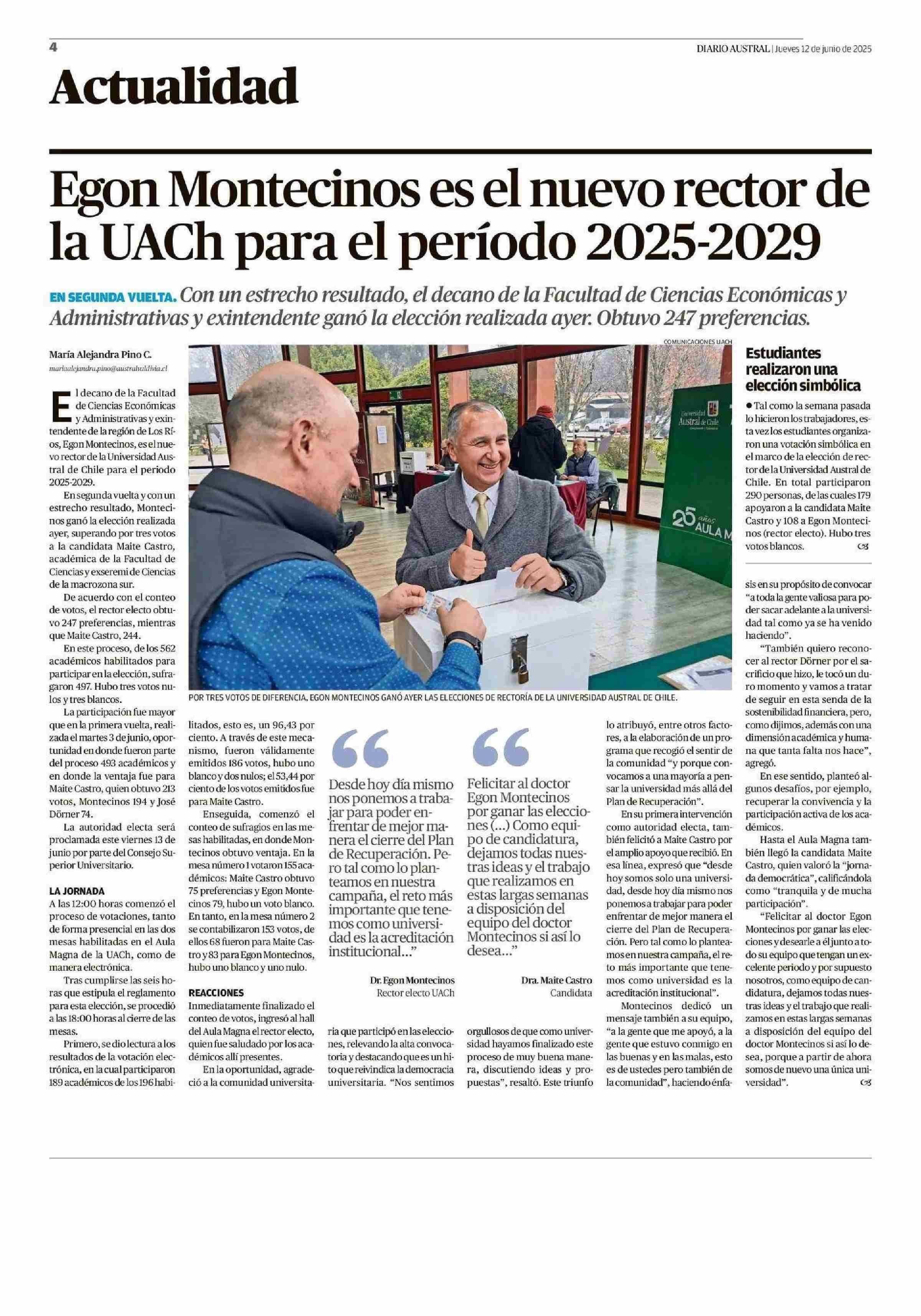 Egon Montecinos es el nuevo rector de la UACh para el período 2025-2029 12-06-2025 Diario Austral Región de Los Ríos |