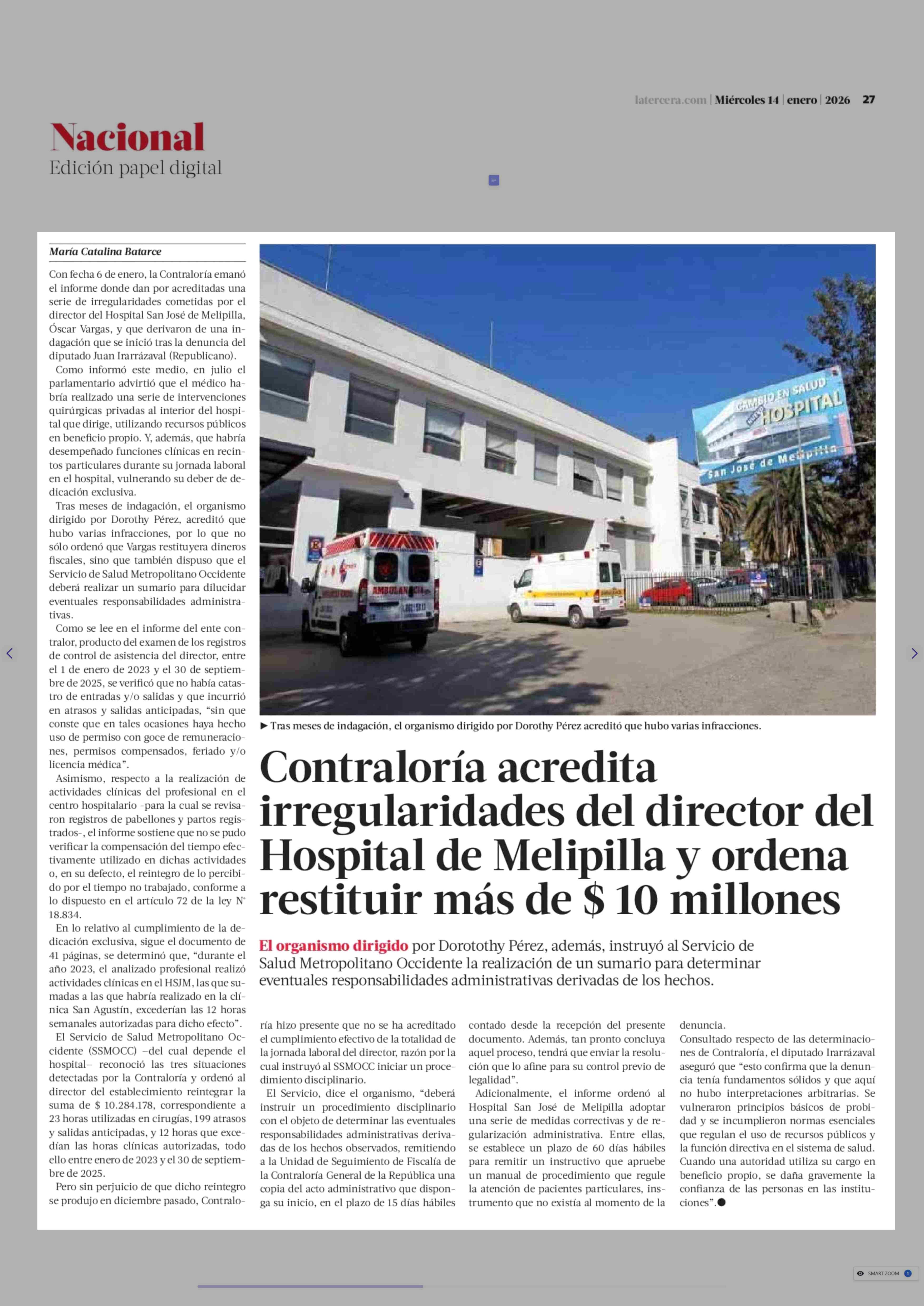 Contraloría acredita irregularidades del director del Hospital de Melipilla y ordena restituir más de $ 10 millones 14-01-2026 La Tercera |