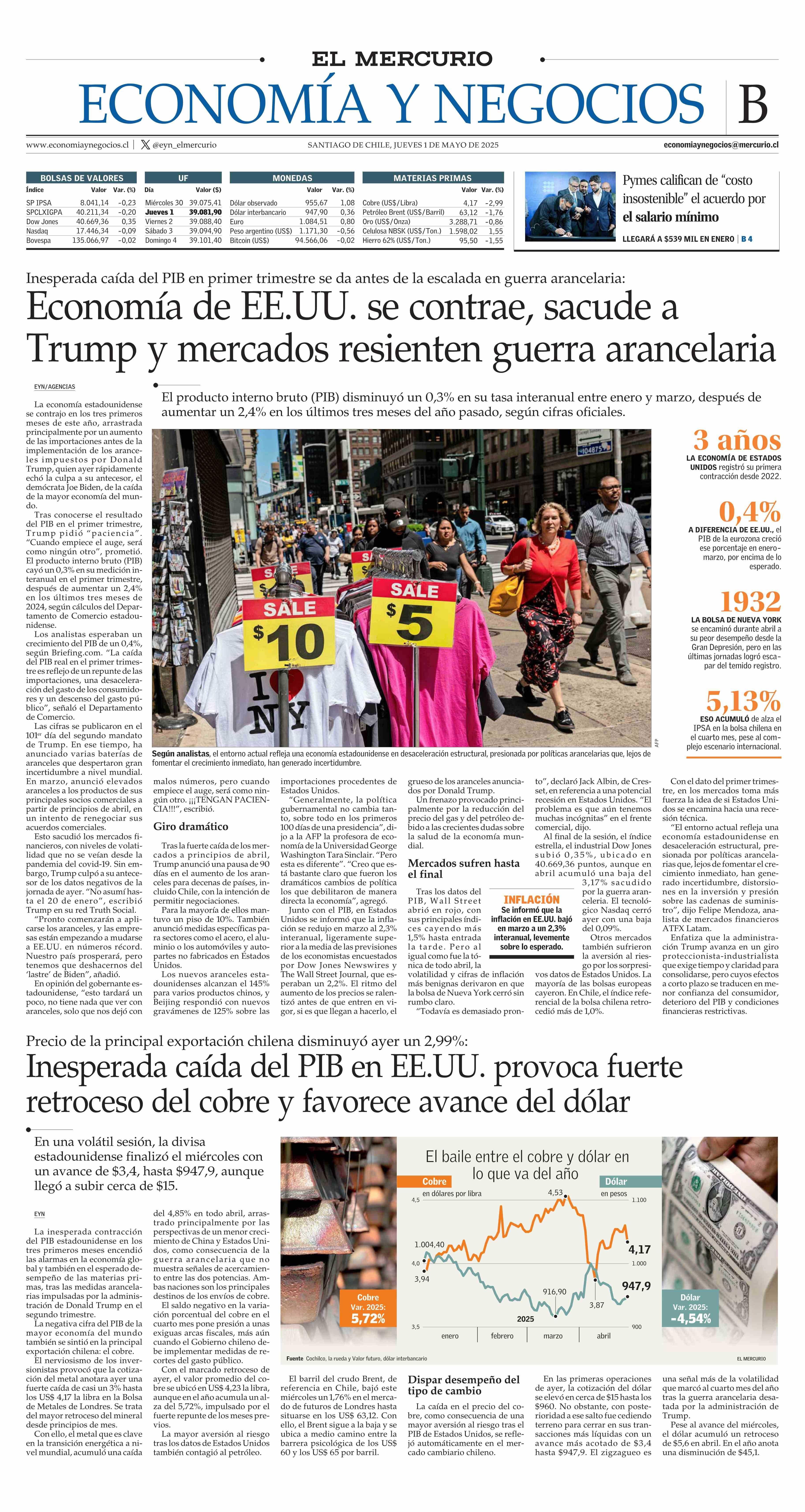 Economía de EE.UU. Se contrae, sacude a Trump y mercados resienten guerra arancelaria 01-05-2025 El Mercurio |
