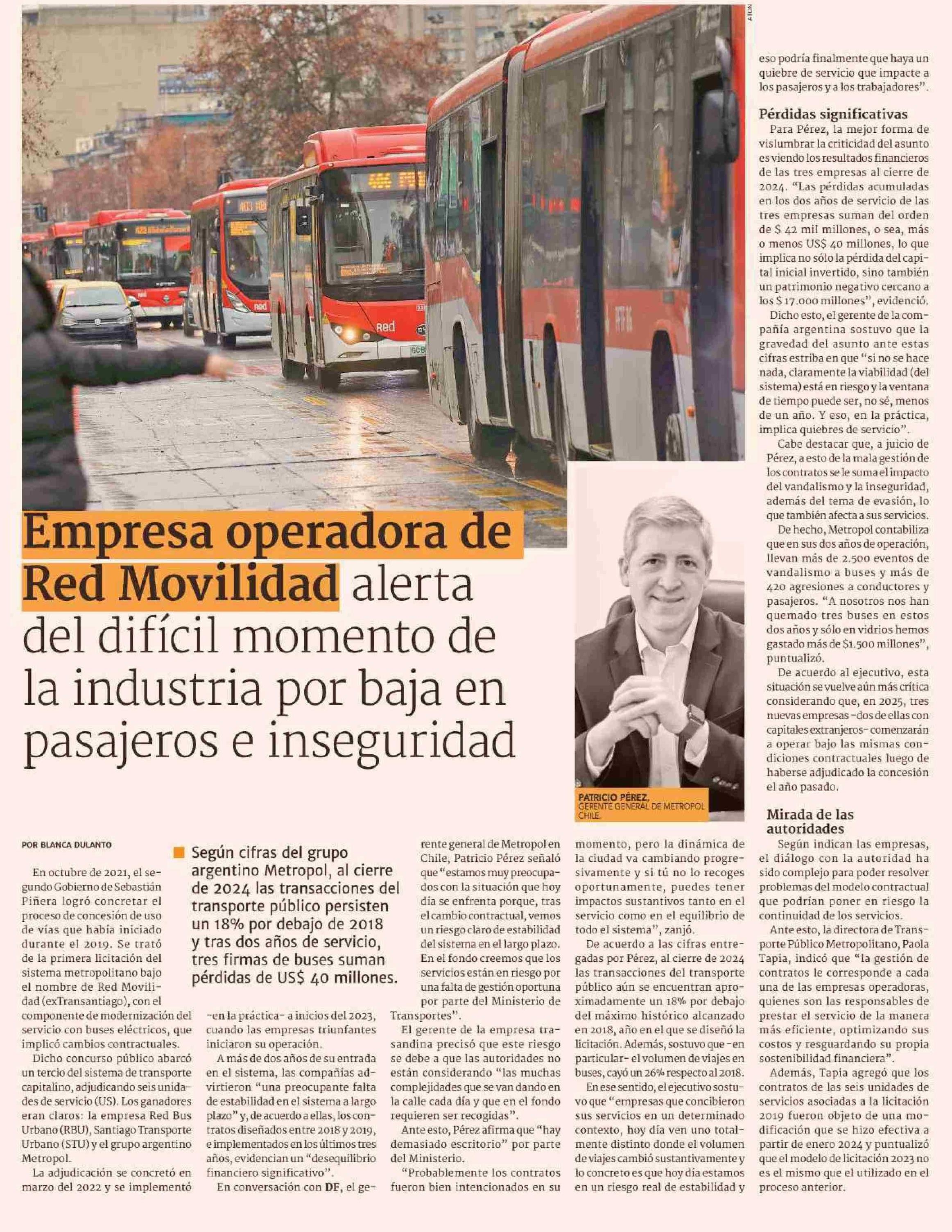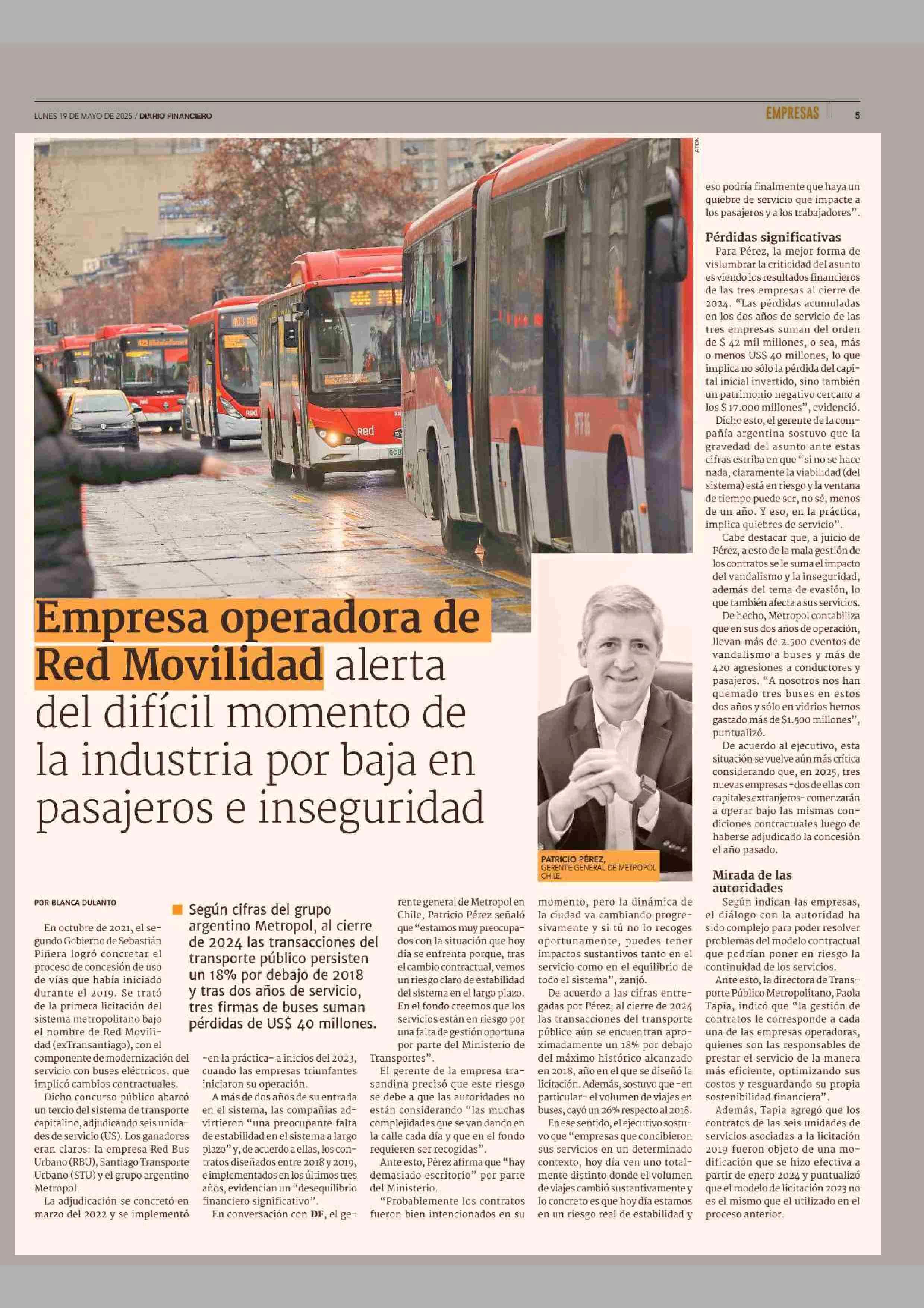 Empresa operadora de Red Movilidad alerta del difícil momento de la industria por baja en pasajeros e inseguridad 19-05-2025 Diario Financiero |