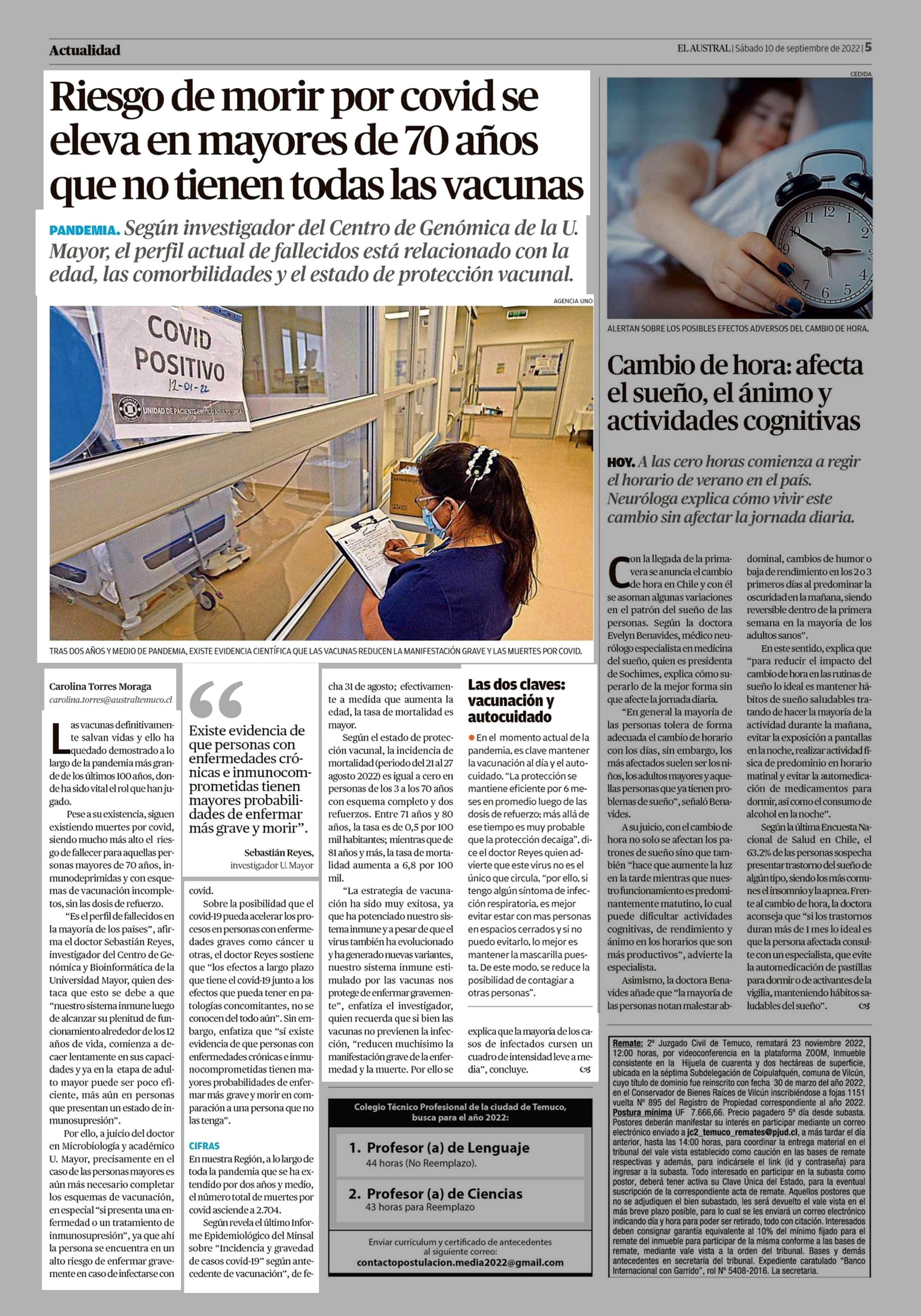 Riesgo de morir por covid se eleva en mayores de 70 años que no tienen todas las vacunas 10-09-2022 El Austral de la Araucanía |