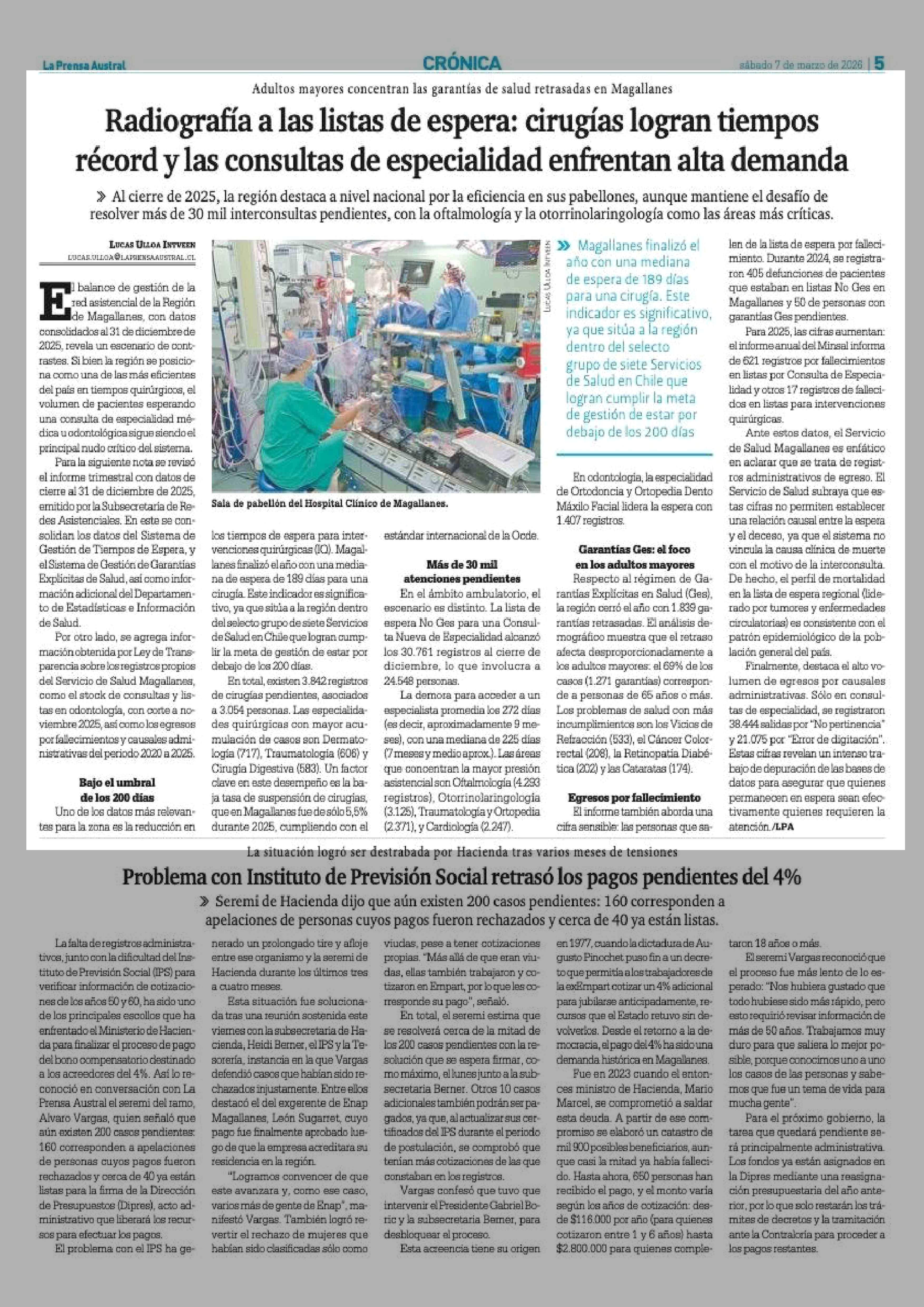Radiografía a las listas de espera: cirugías logran tiempos récord y las consultas de especialidad enfrentan alta demanda 07-03-2026 La Prensa Austral |
