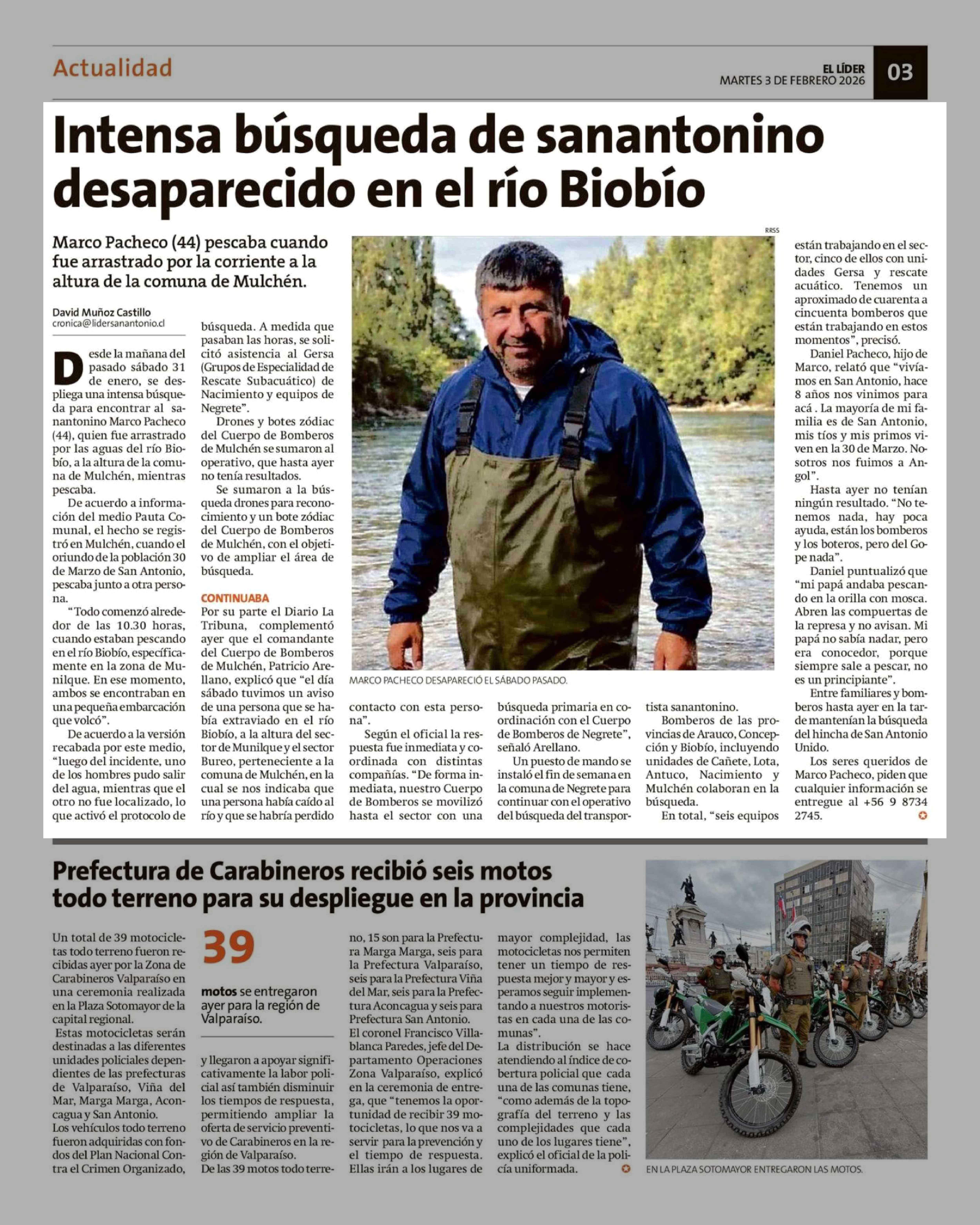 Intensa búsqueda de sanantonino desaparecido en el río Biobio 03-02-2026 El Líder |