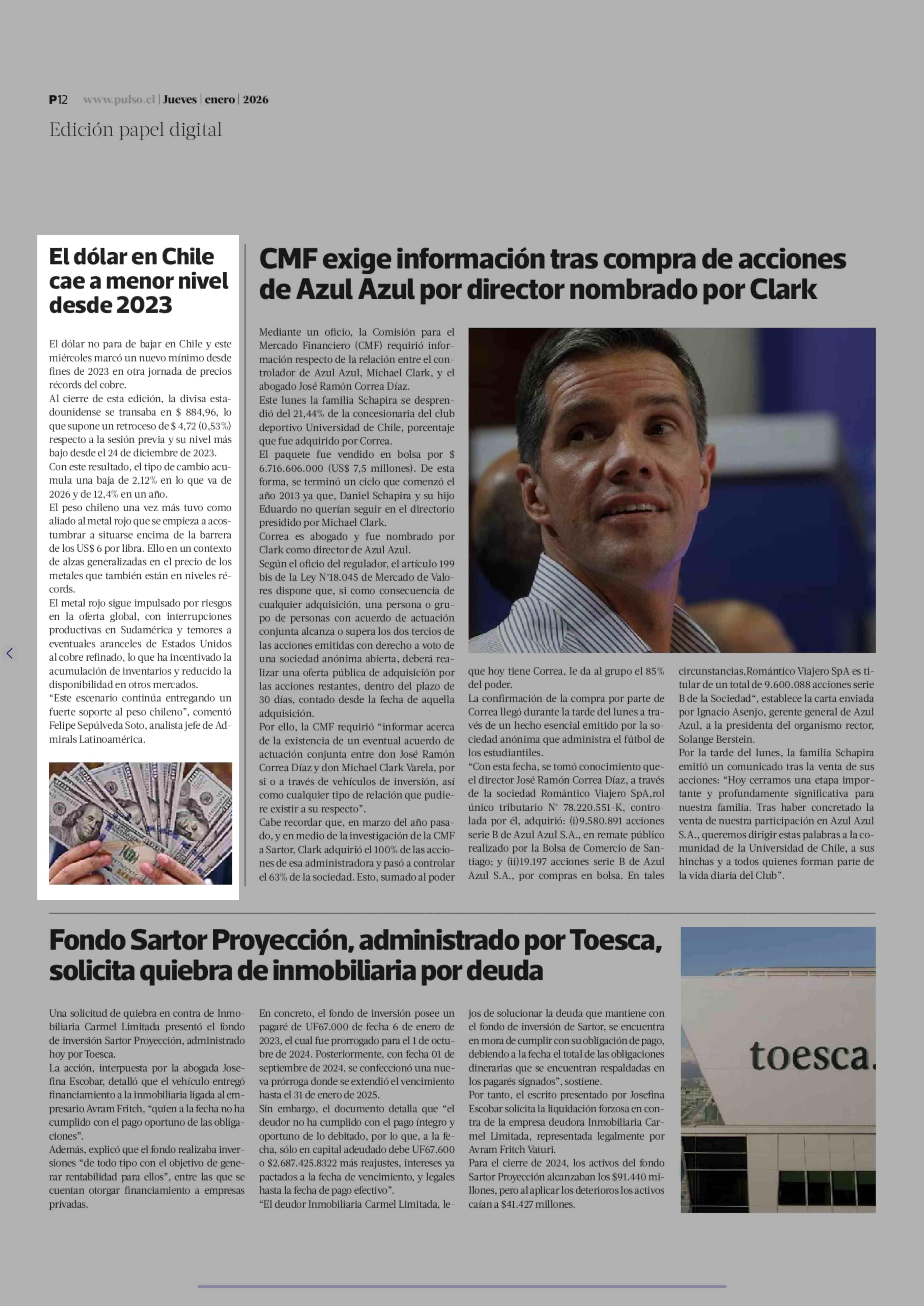 El dólar en Chile cae a menor nivel desde 2023 15-01-2026 La Tercera |