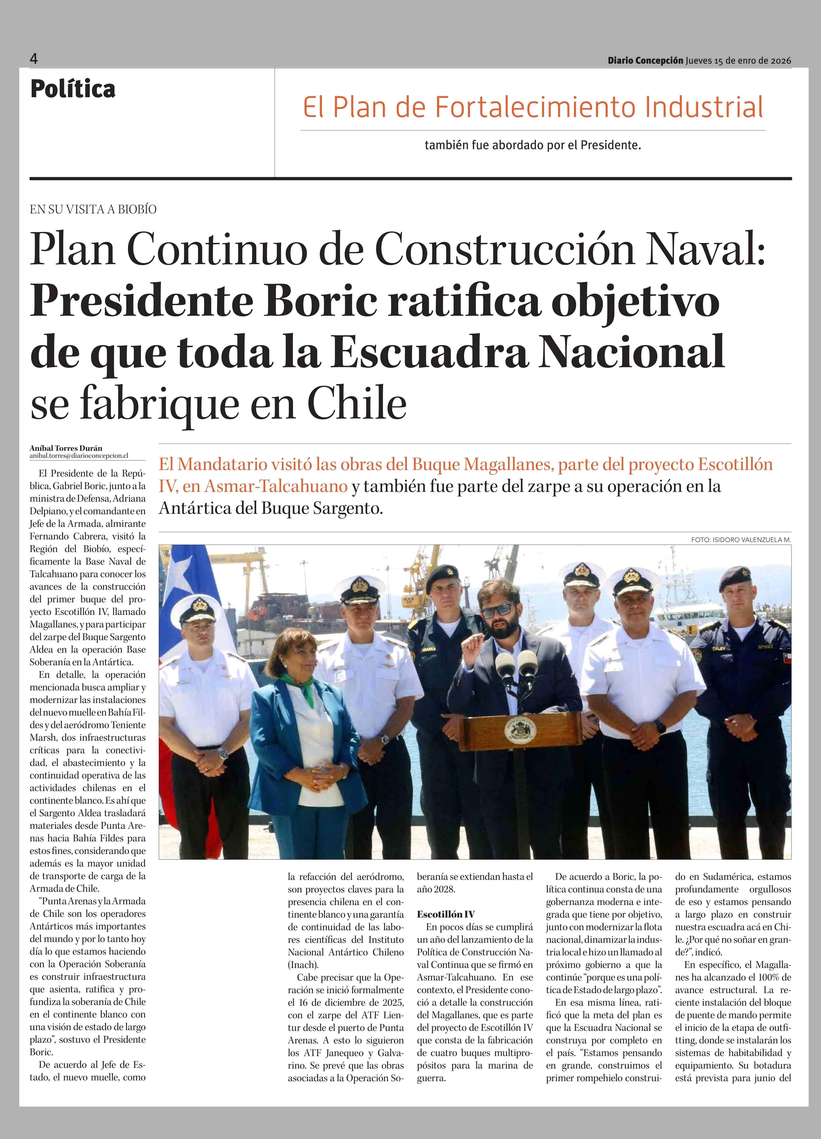 Plan Continuo de Construcción Naval: Presidente Boric ratifica objetivo de que toda la Escuadra Nacional se fabrique en Chile 15-01-2026 Diario Concepción |