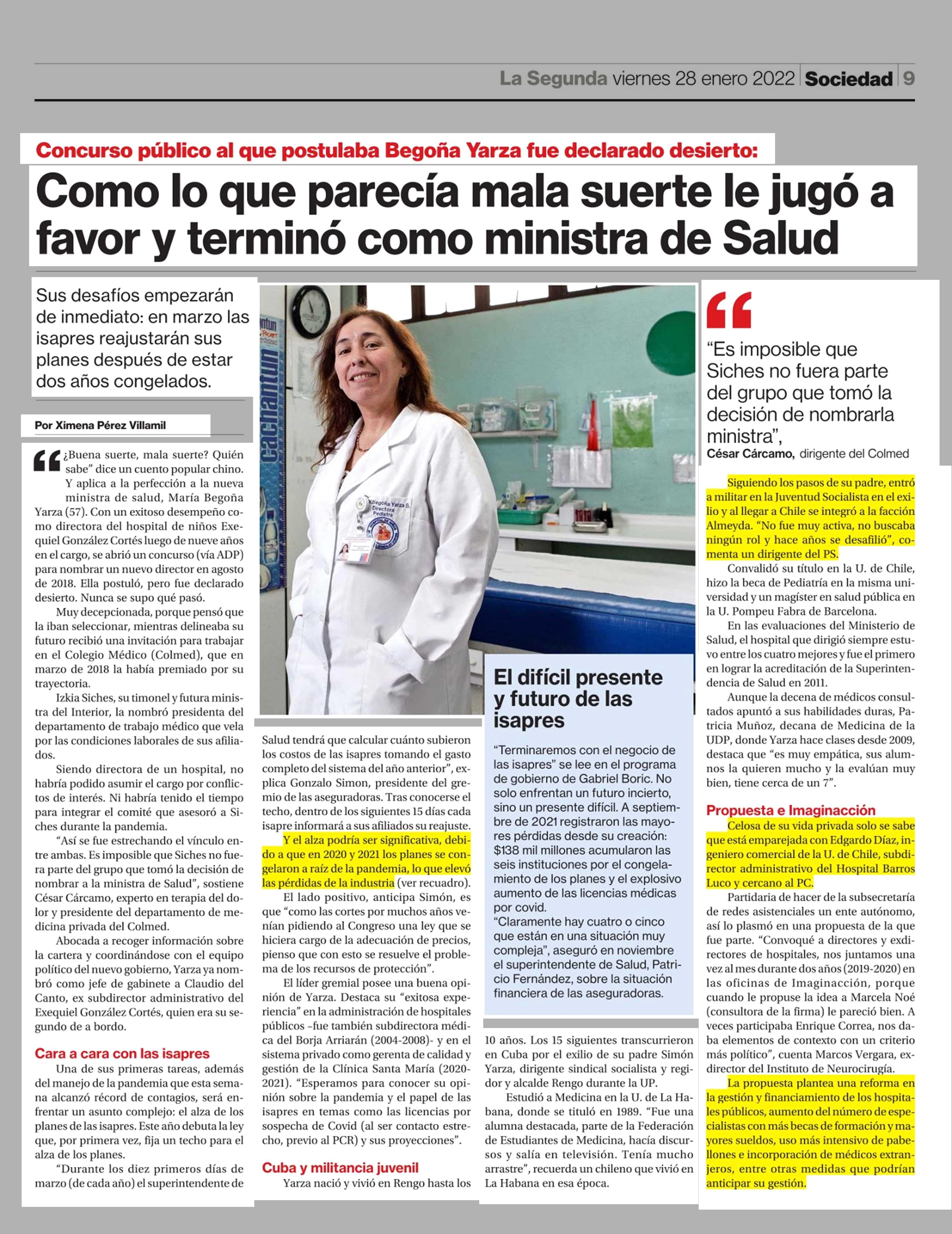Como lo que parecía mala suerte le jugó a favor y terminó como ministra de Salud 28-01-2022 La Segunda |