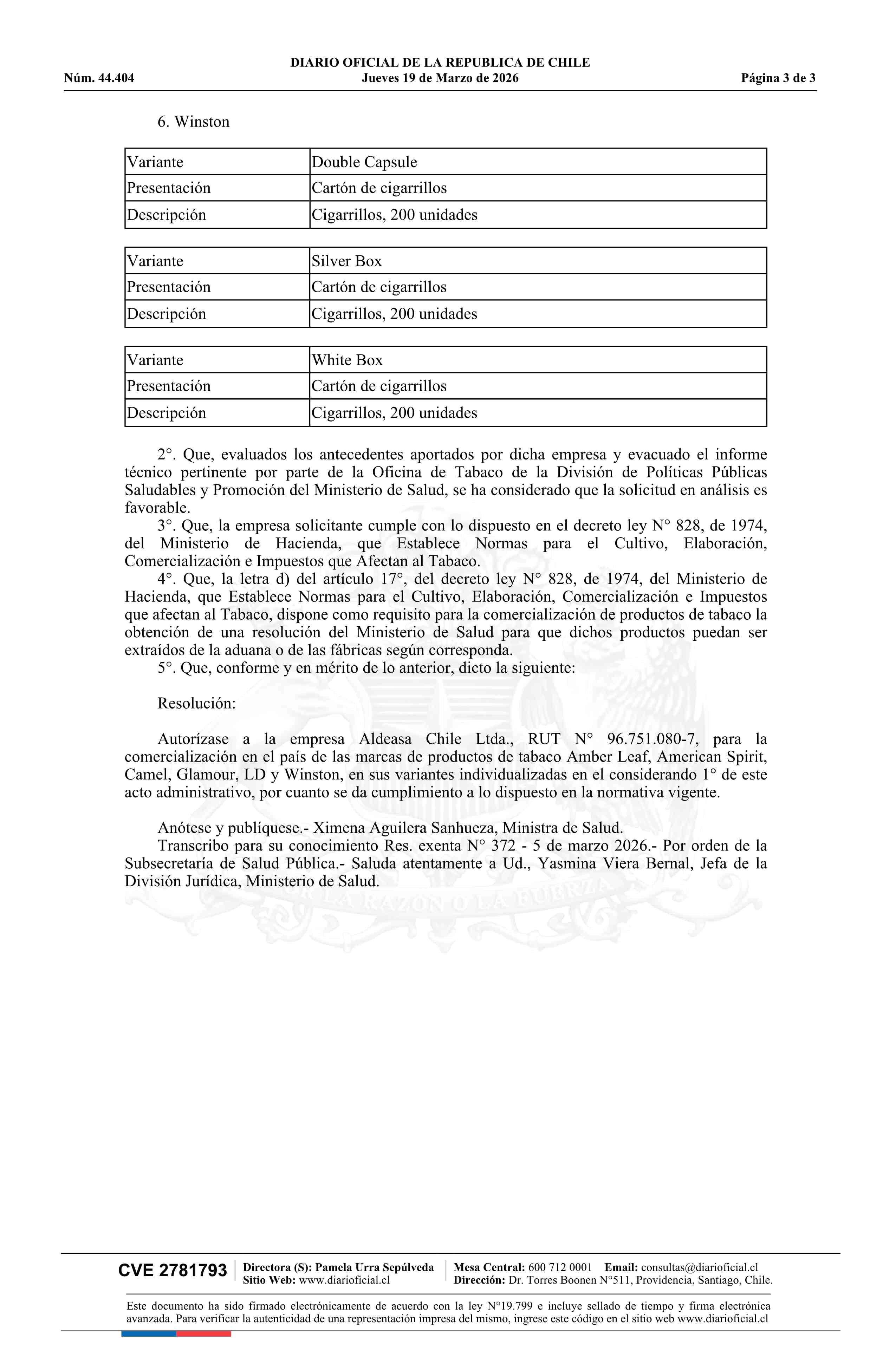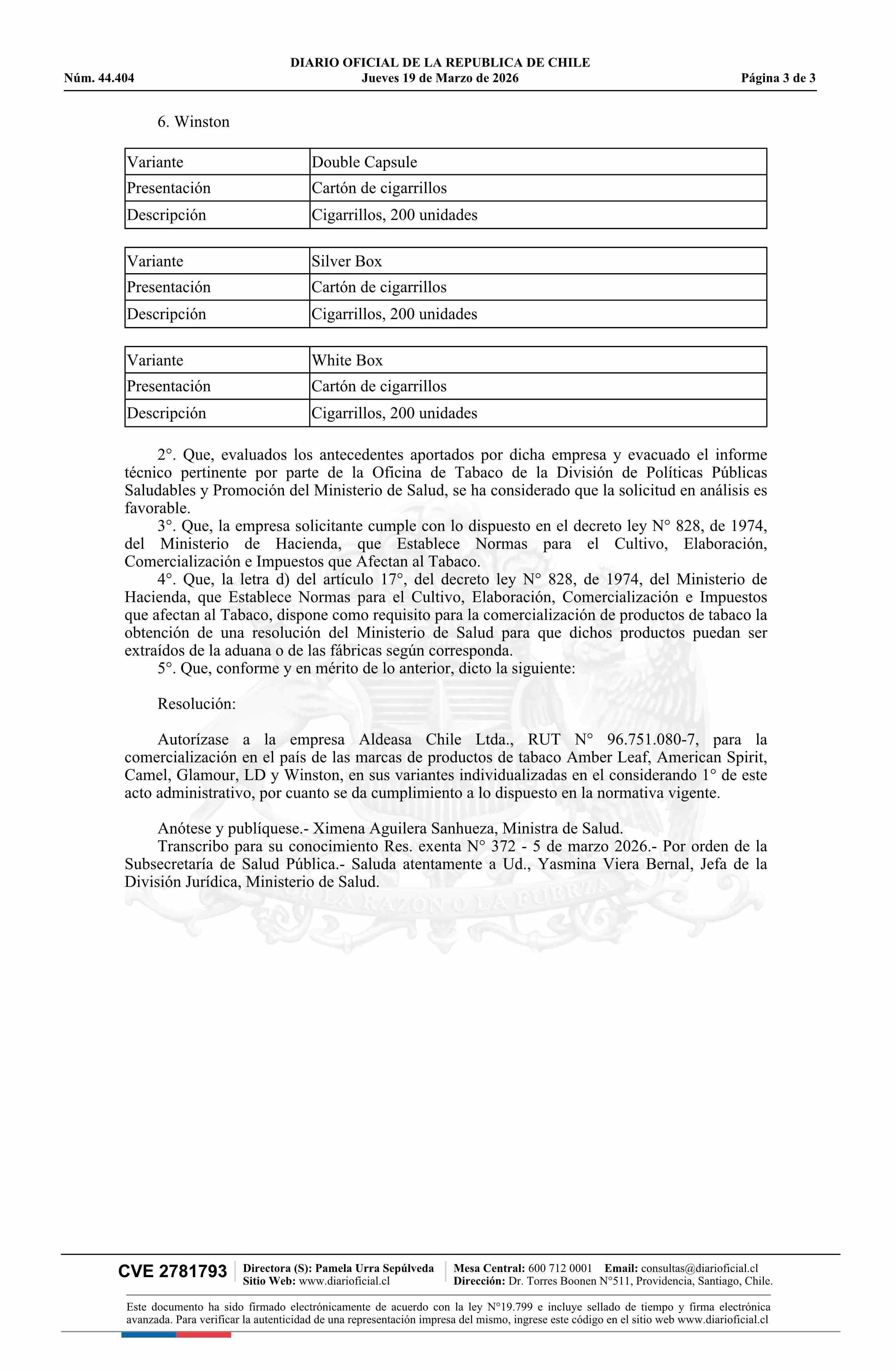 Resolución exenta número 372, de 2026.- Autoriza comercialización de productos de tabaco que indica, comercializados por la empresa Aldeasa Chile Ltda.