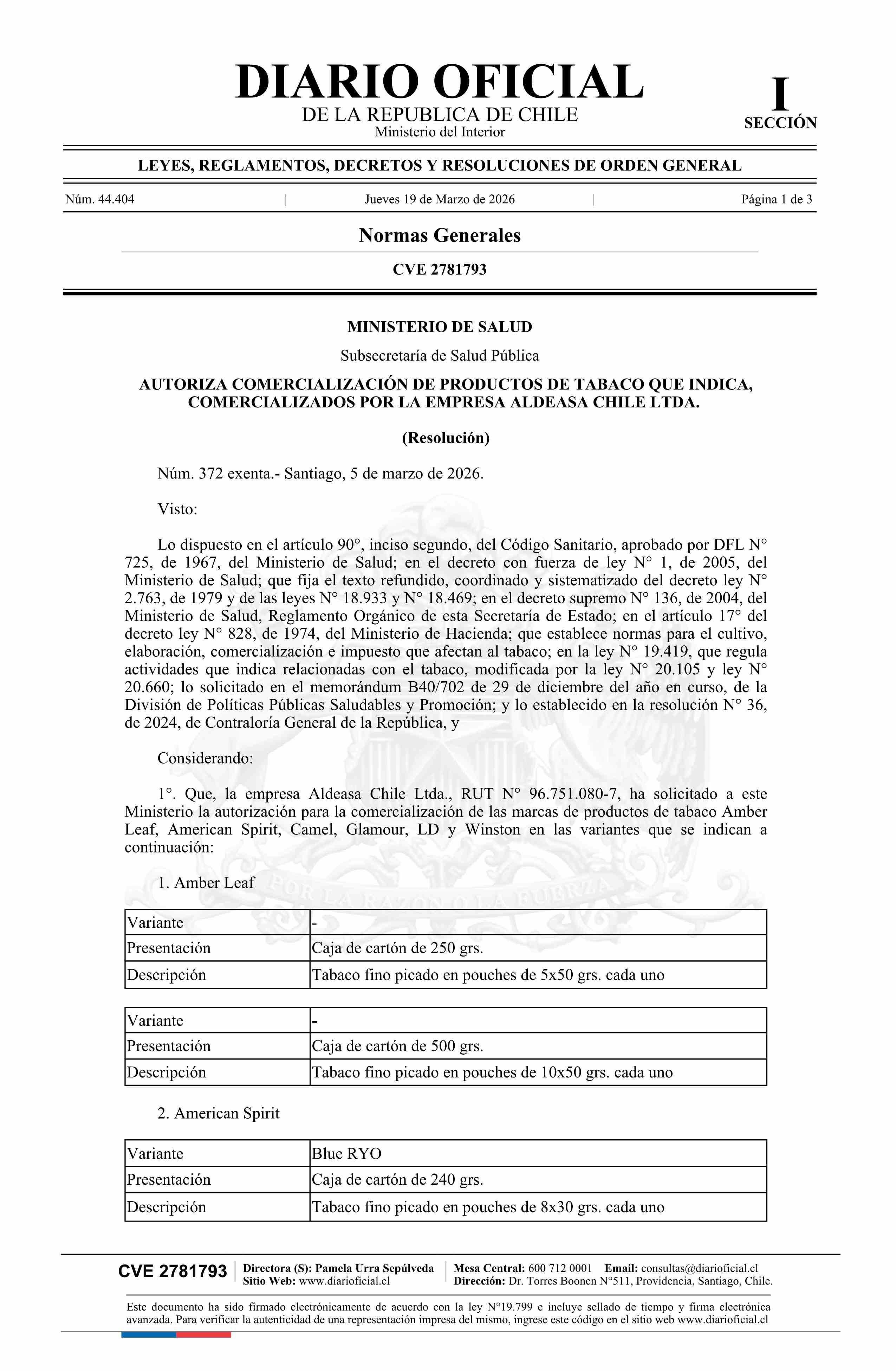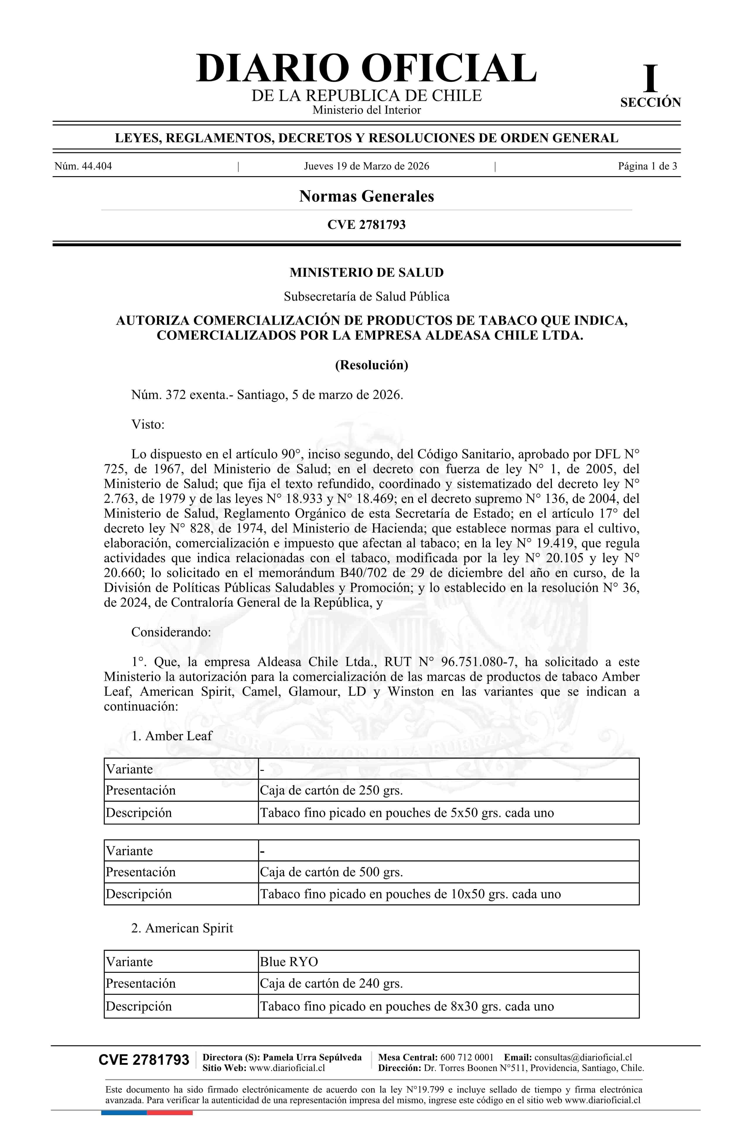 Título: Resolución exenta número 372, de 2026.- Autoriza comercialización de productos de tabaco que indica, comercializados por la empresa Aldeasa Chile Ltda.