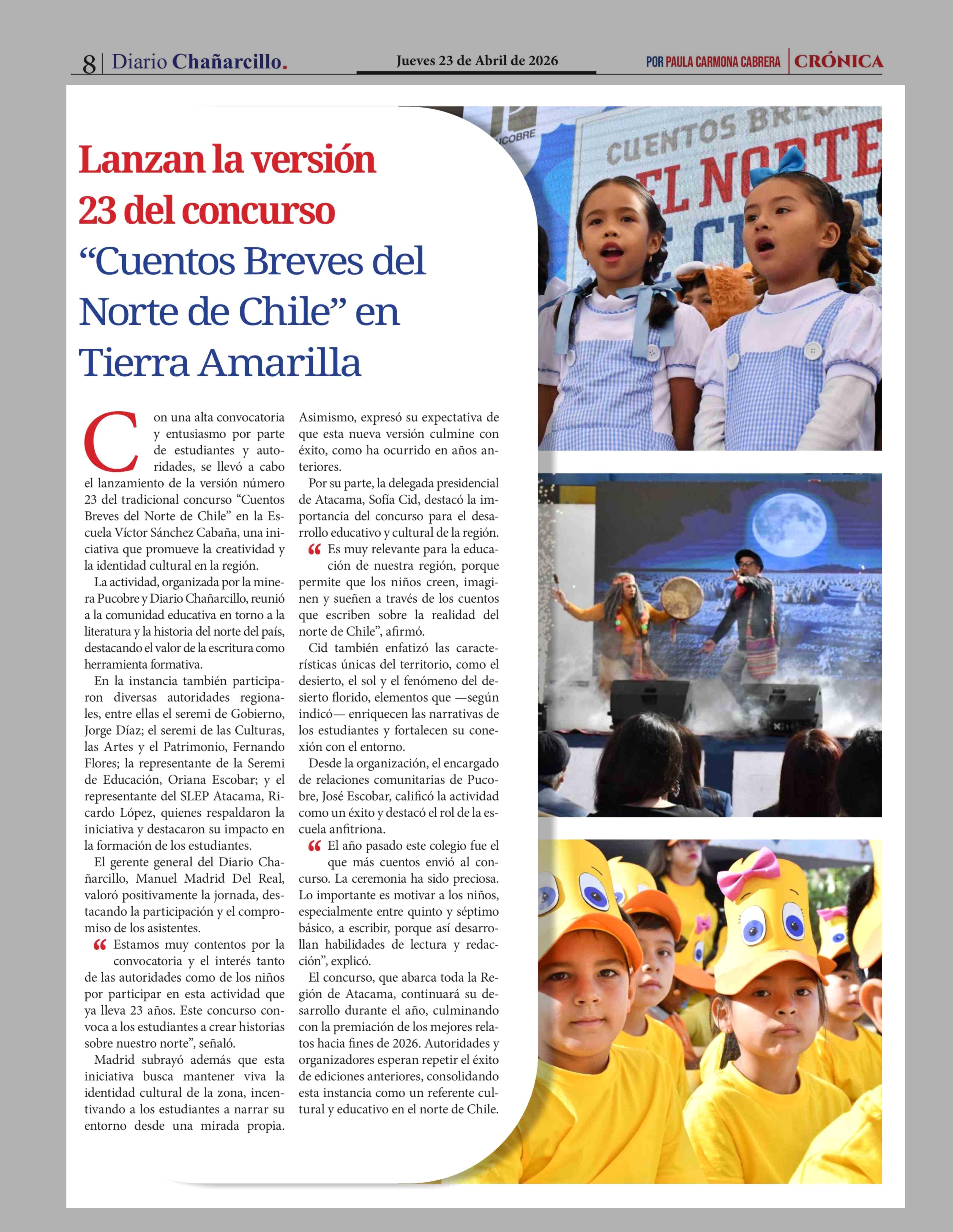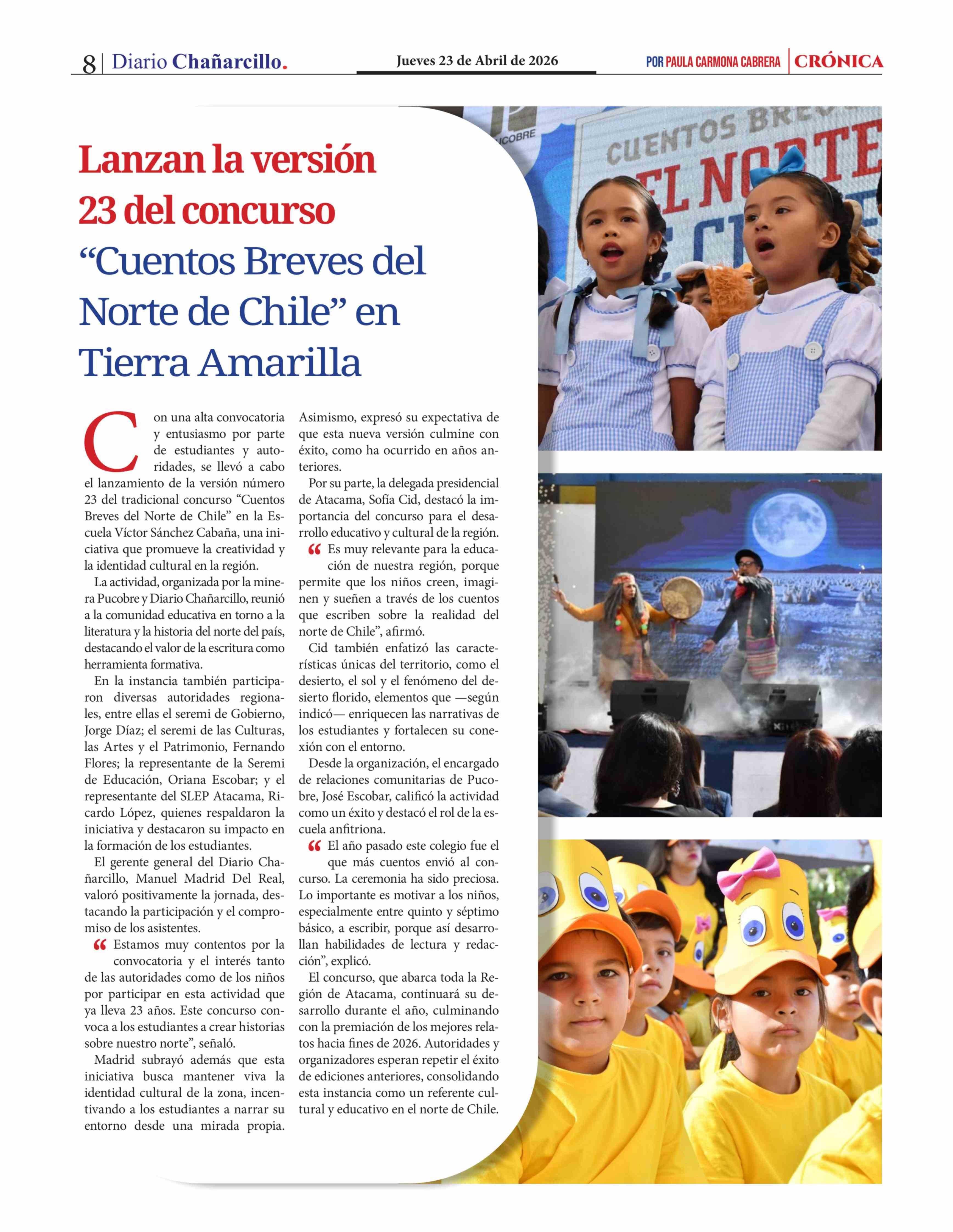 Lanzan la versión 23 del concurso "Cuentos Breves del Norte de Chile" en Tierra Amarilla 23-04-2026 Diario Chañarcillo |