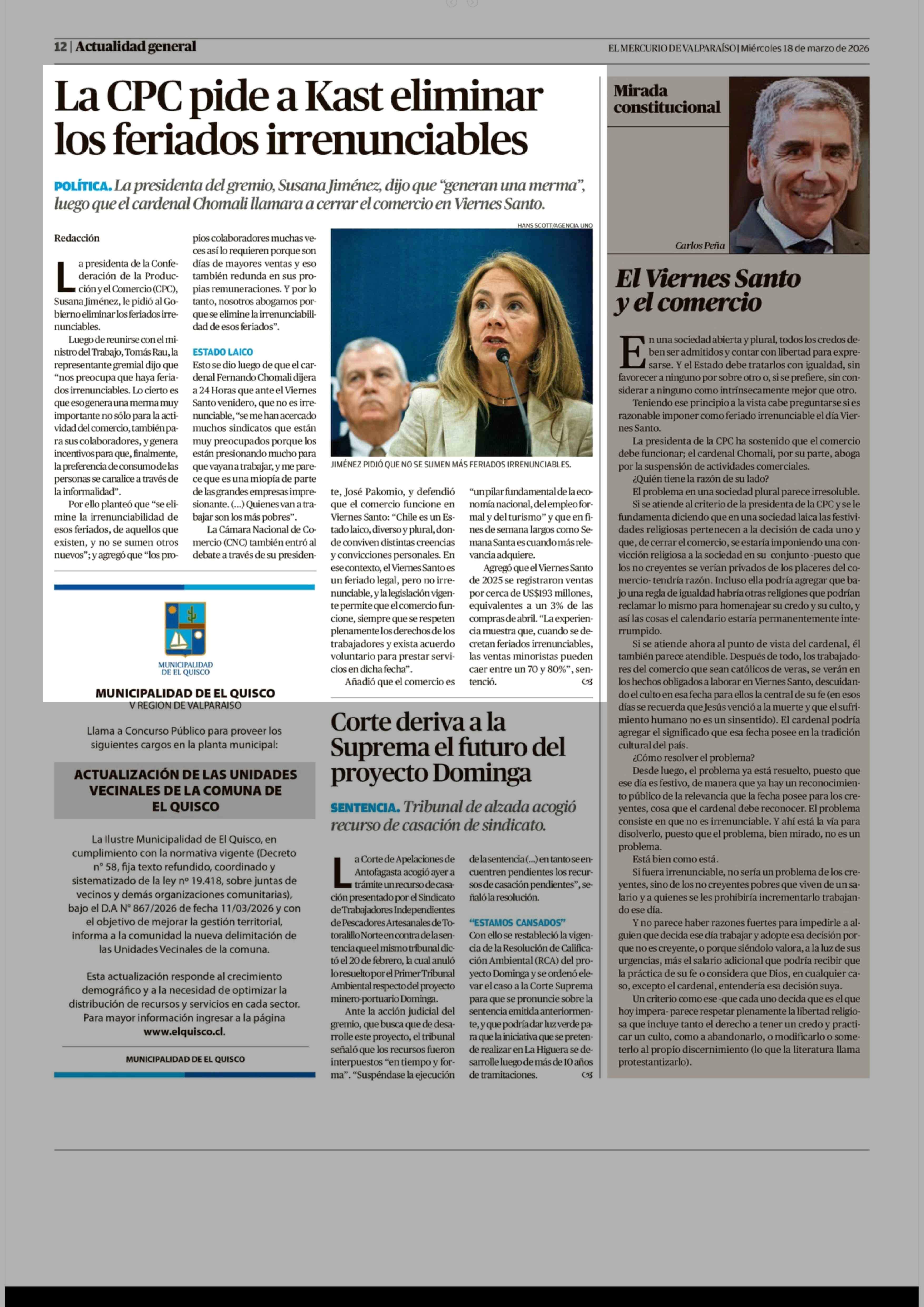 Título: La CPC pide a Kast eliminar los feriados irrenunciables