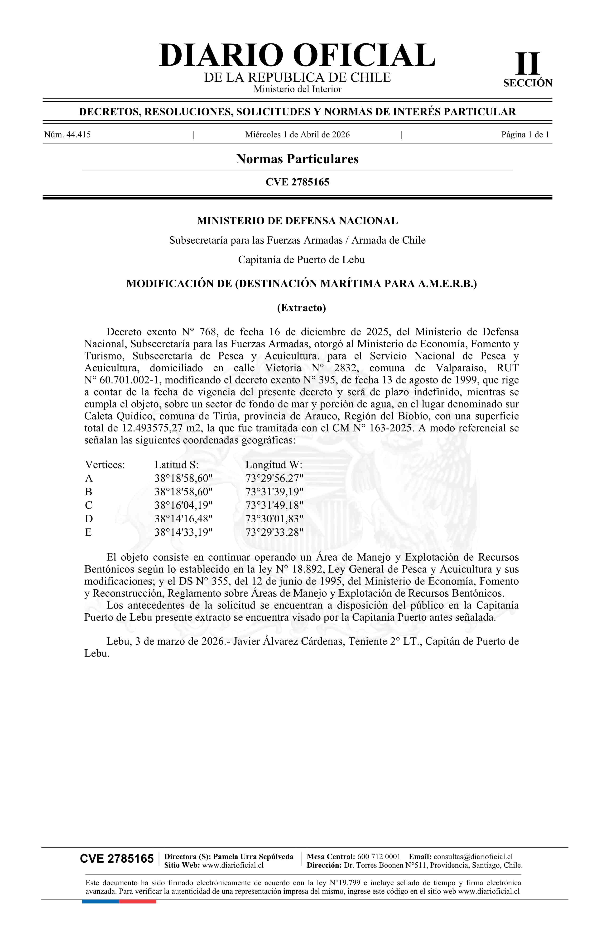 Título: Extracto de decreto exento número 768, de 2025.- Modificación de destinación marítima para A.M.E.R.B.