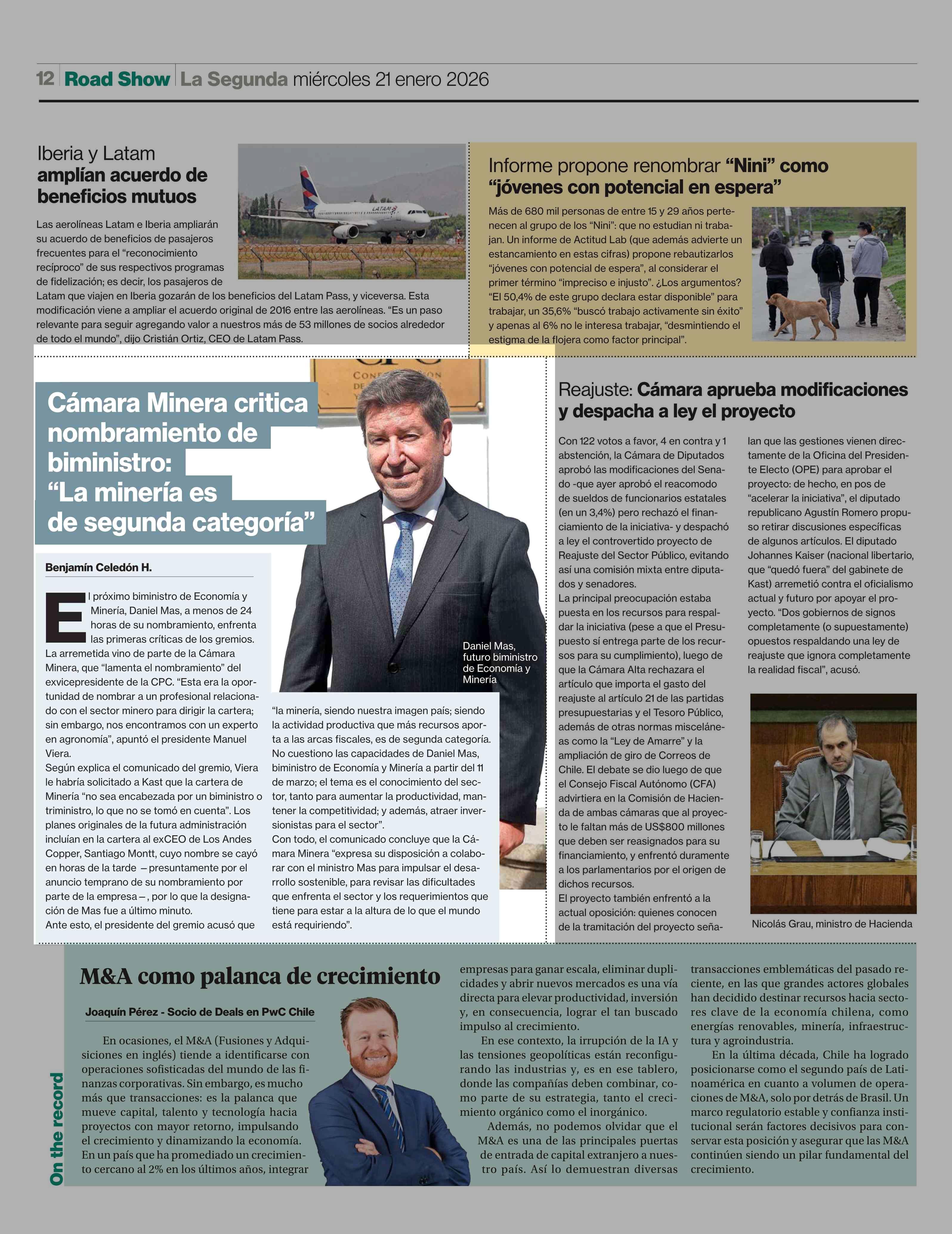 Cámara Minera critica nombramiento de biministro: "La minería es de segunda categoría" 21-01-2026 La Segunda |