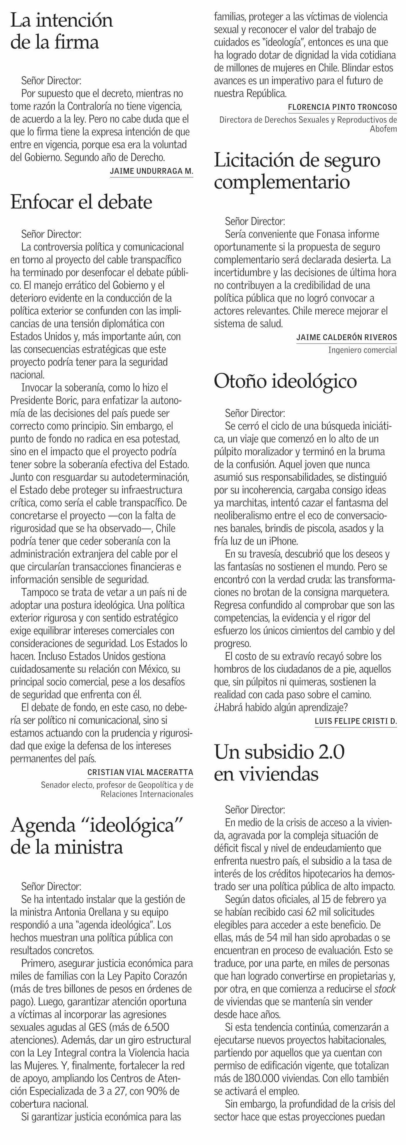 Cartas: Agenda “ideológica” de la ministra 07-03-2026 El Mercurio |