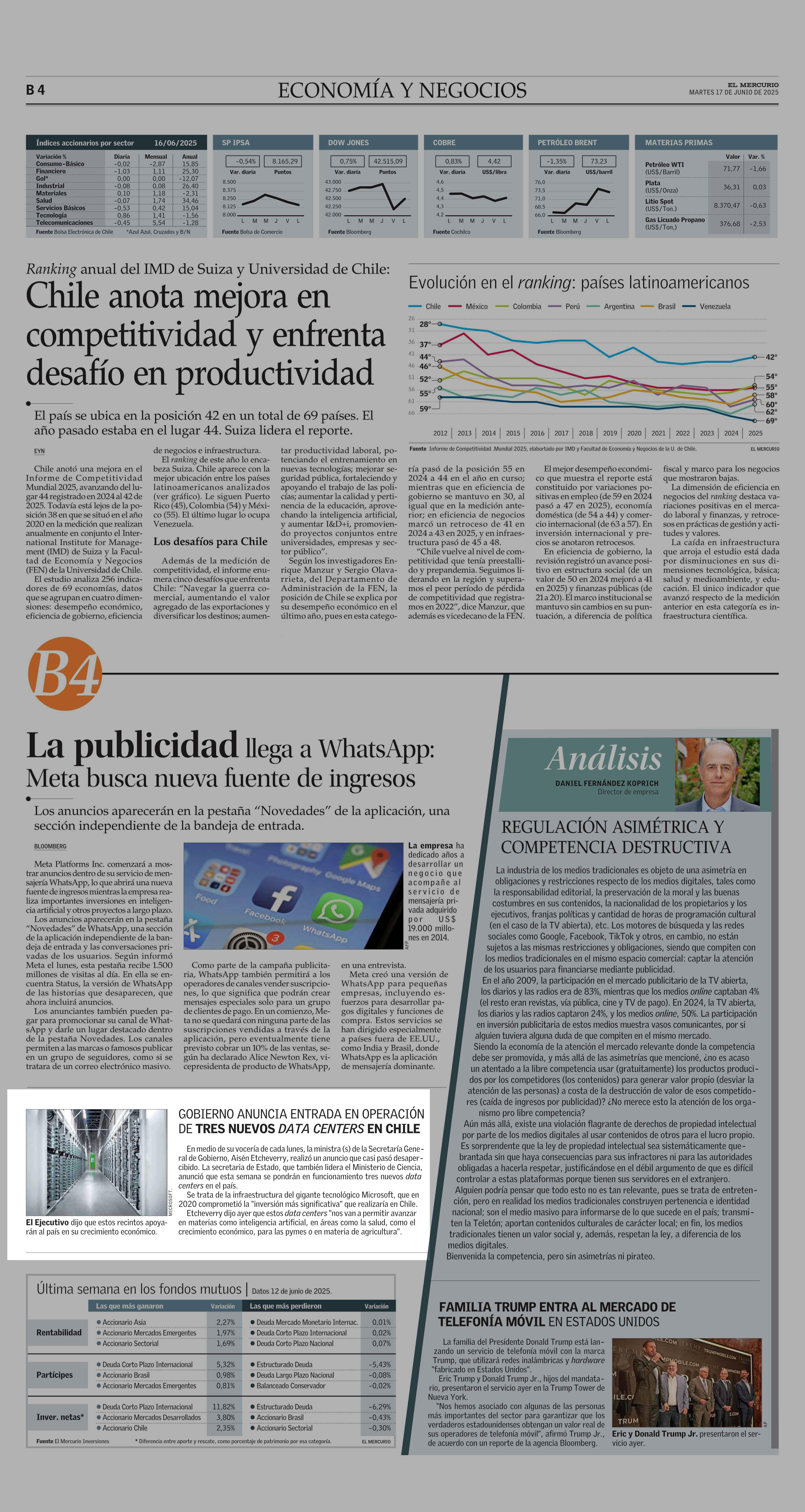 GOBIERNO ANUNCIA ENTRADA EN OPERACIÓN DE TRES NUEVOS DATA CENTERS EN CHILE 17-06-2025 El Mercurio |