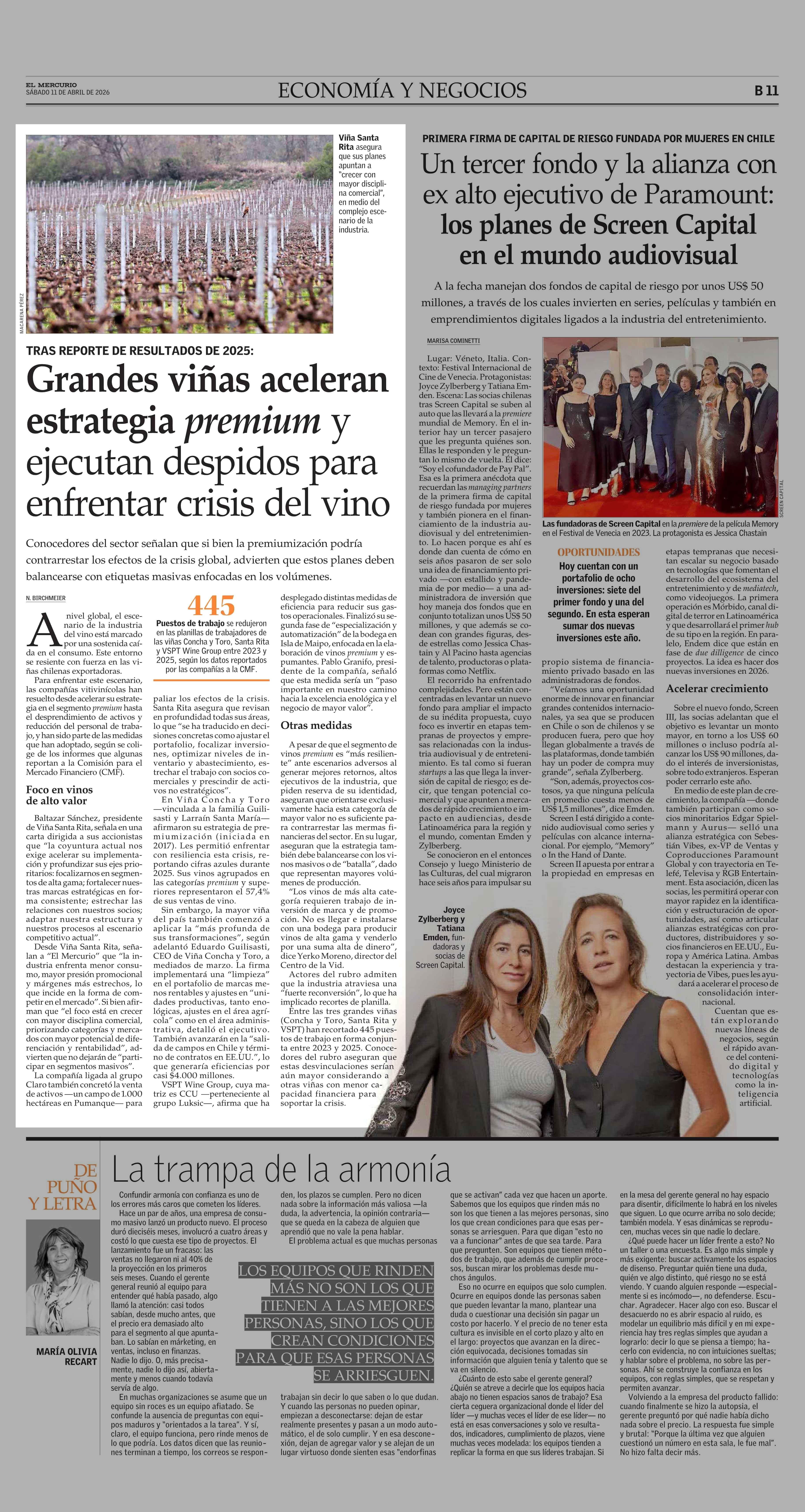 Grandes viñas aceleran estrategia premium y ejecutan despidos para enfrentar crisis del vino 11-04-2026 El Mercurio |
