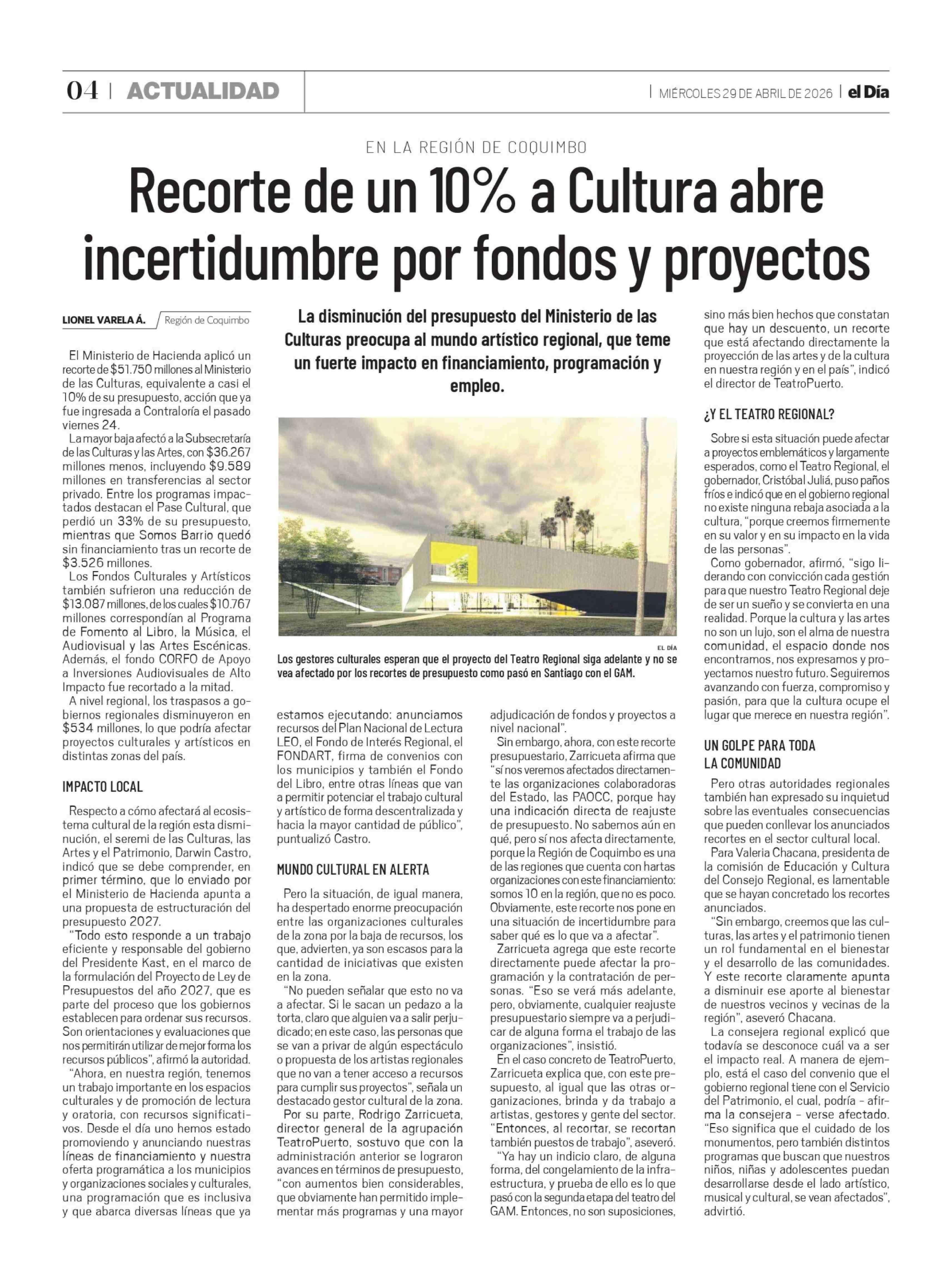 Título: Recorte de un 10% a Cultura abre incertidumbre por fondos y proyectos