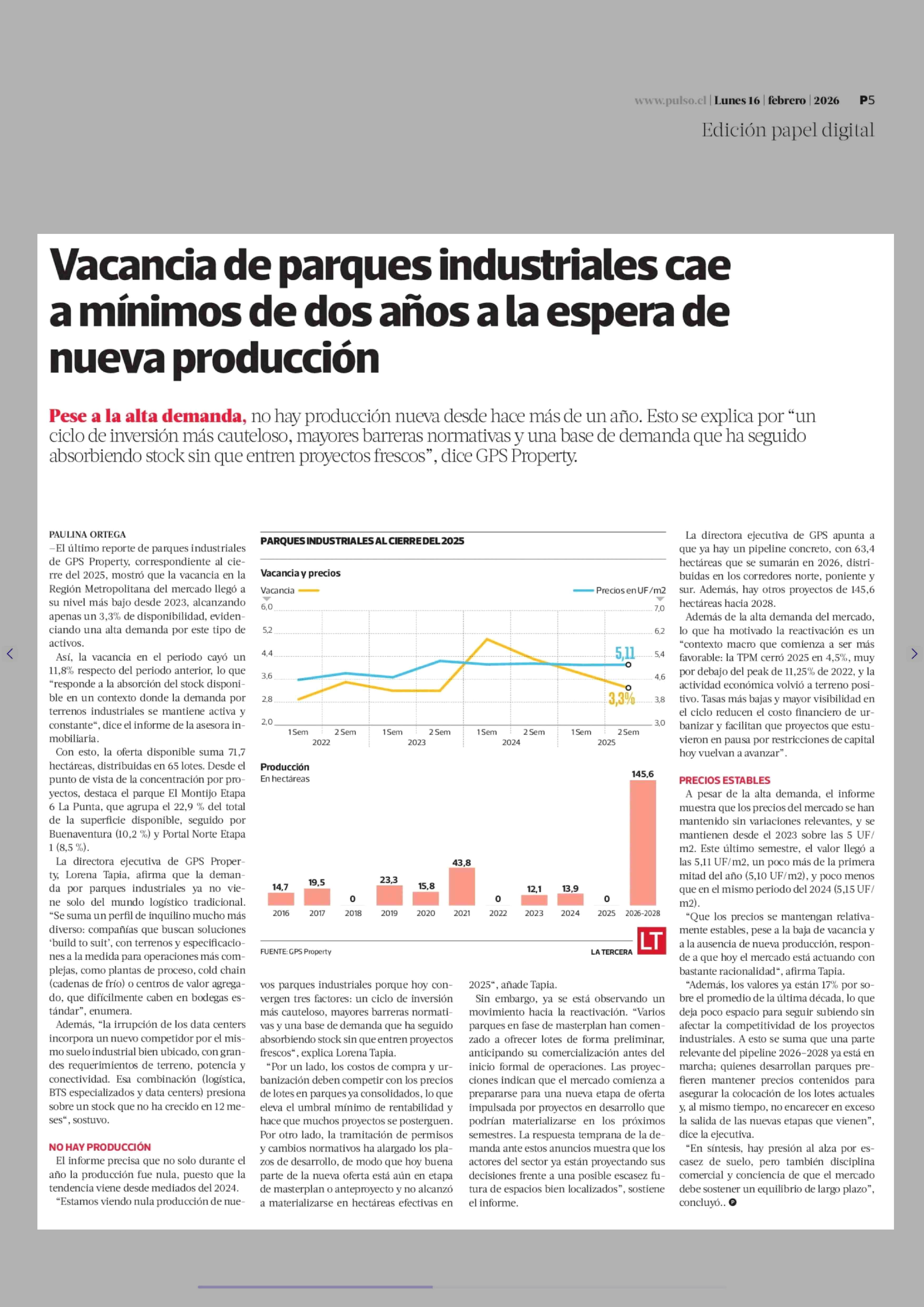 Título: Vacancia de parques industriales cae a mínimos de dos años a la espera de nueva producción