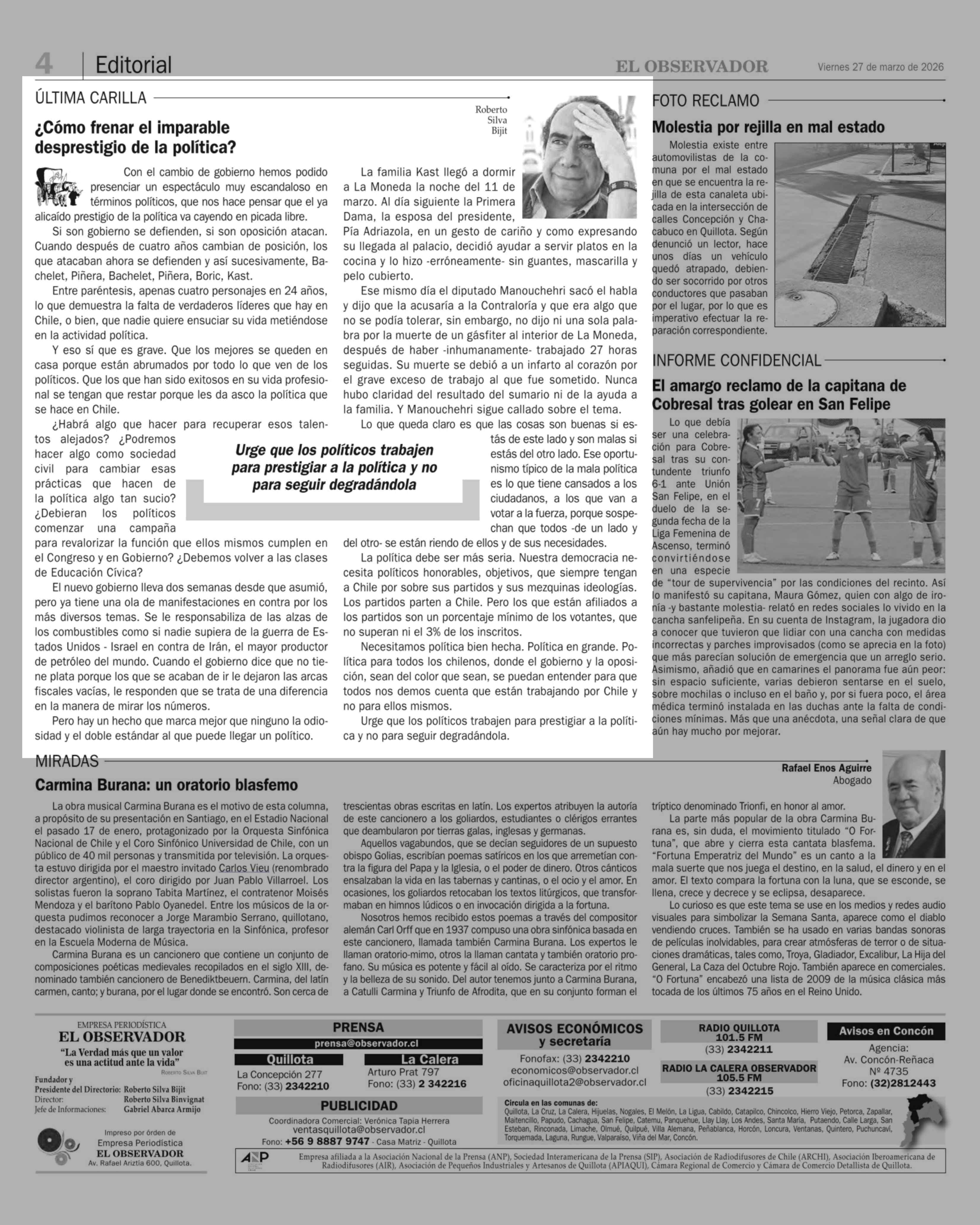 Editorial: ¿Cómo frenar el imparable desprestigio de la política? 27-03-2026 El Observador |