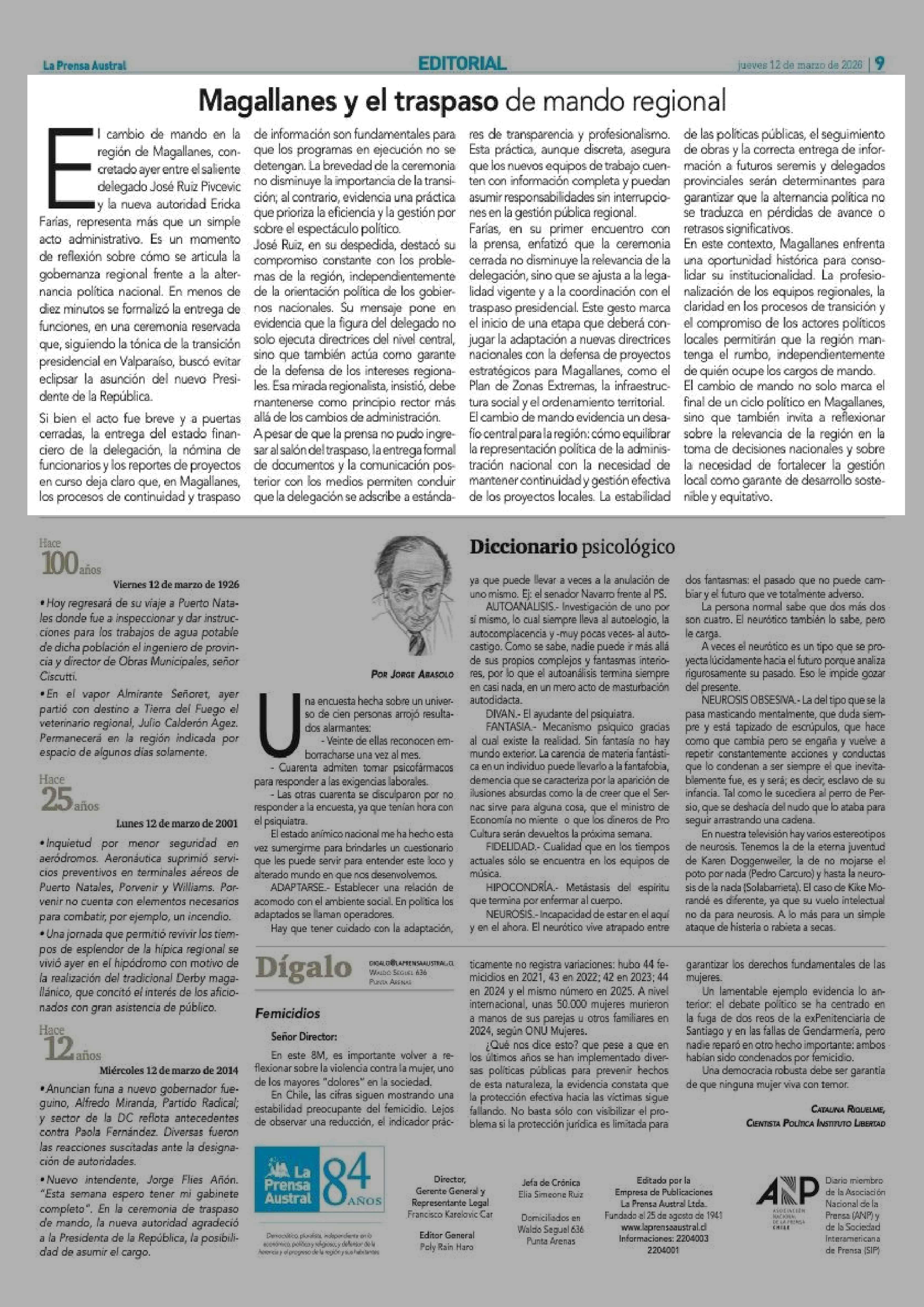 Editorial: Magallanes y el traspaso de mando regional 12-03-2026 La Prensa Austral |