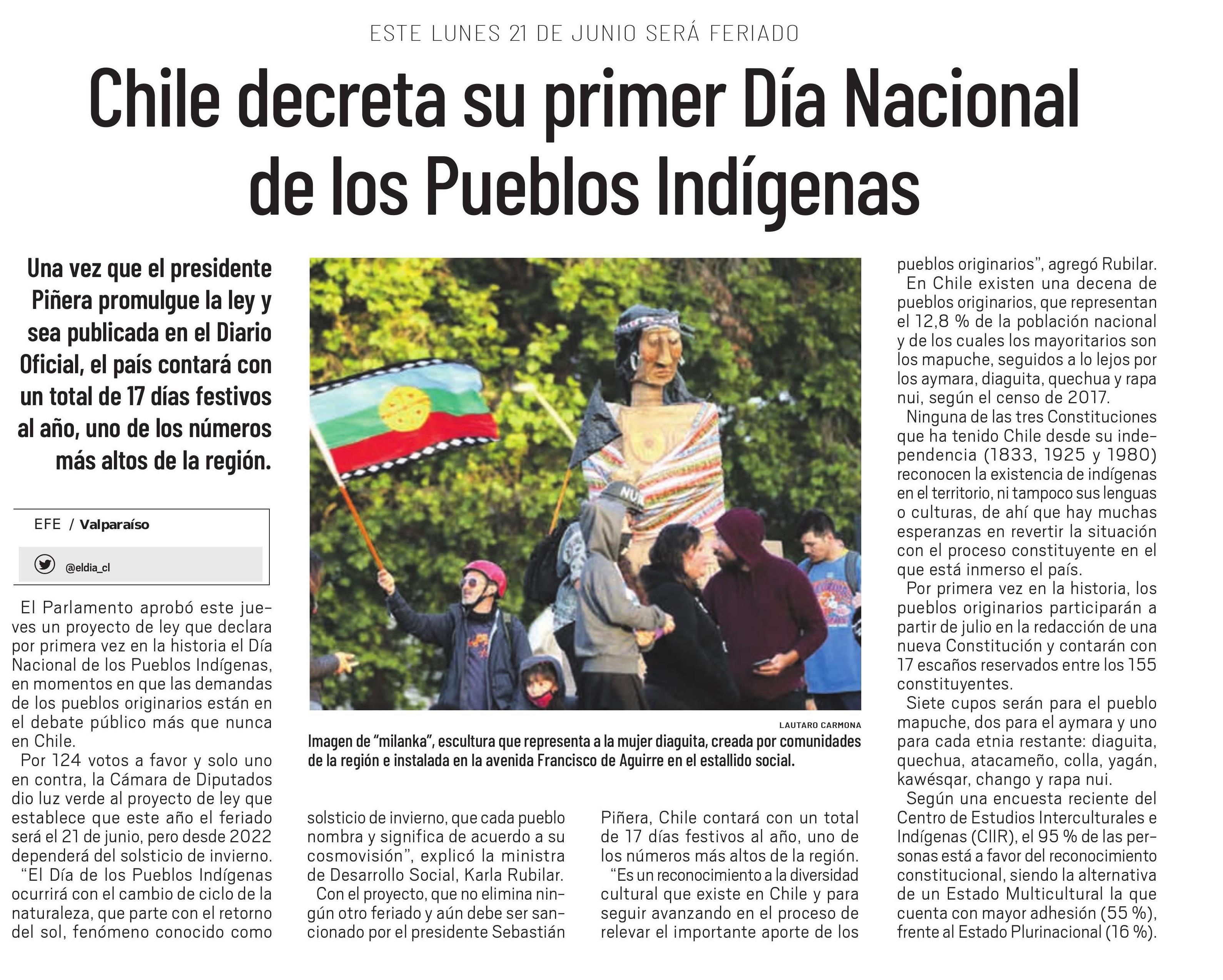 Chile decreta su primer Día Nacional de los Pueblos Indígenas 18-06-2021 El Día |