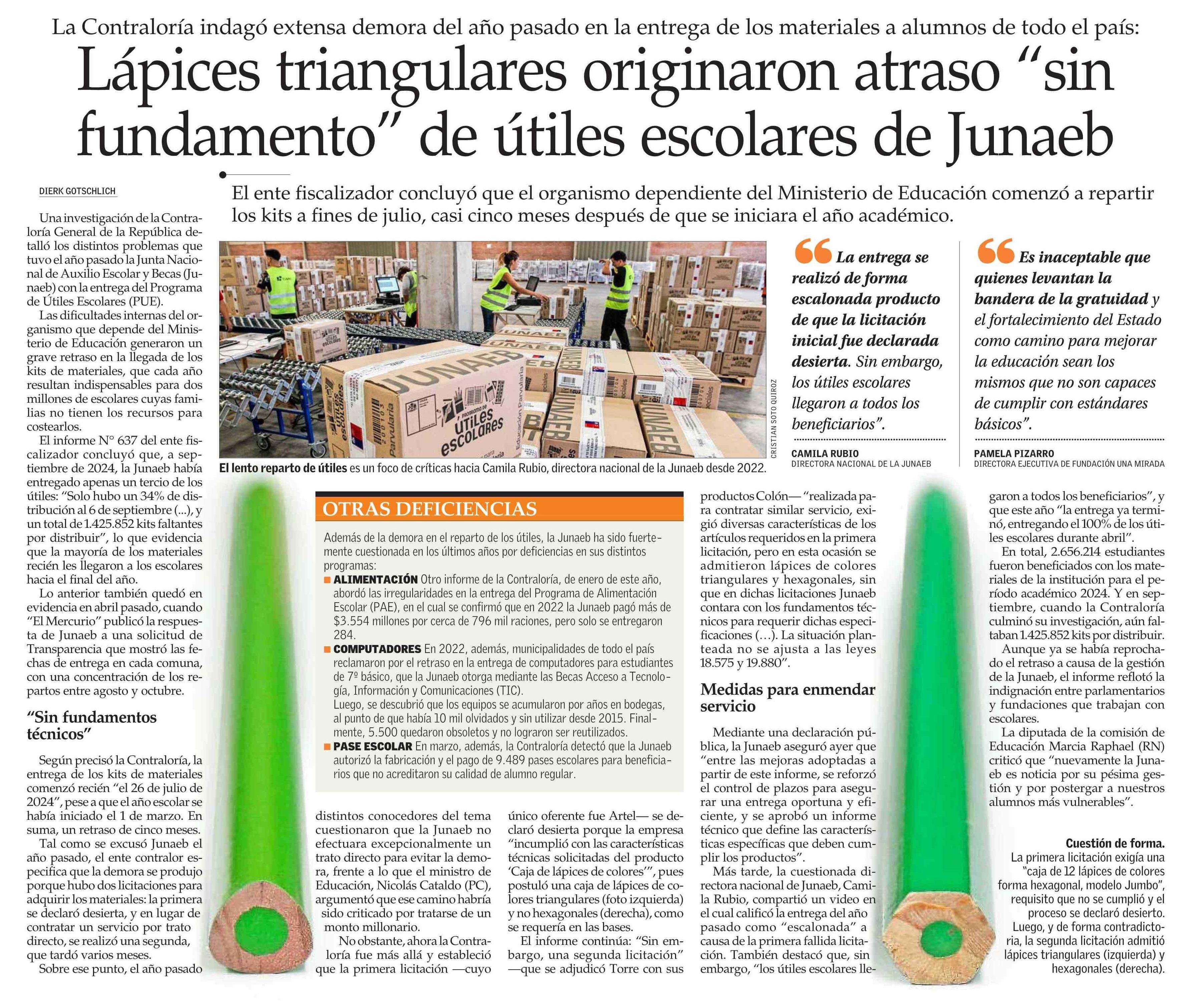 Lápices triangulares originaron atraso “sin fundamento” de útiles escolares de Junaeb 18-06-2025 El Mercurio |