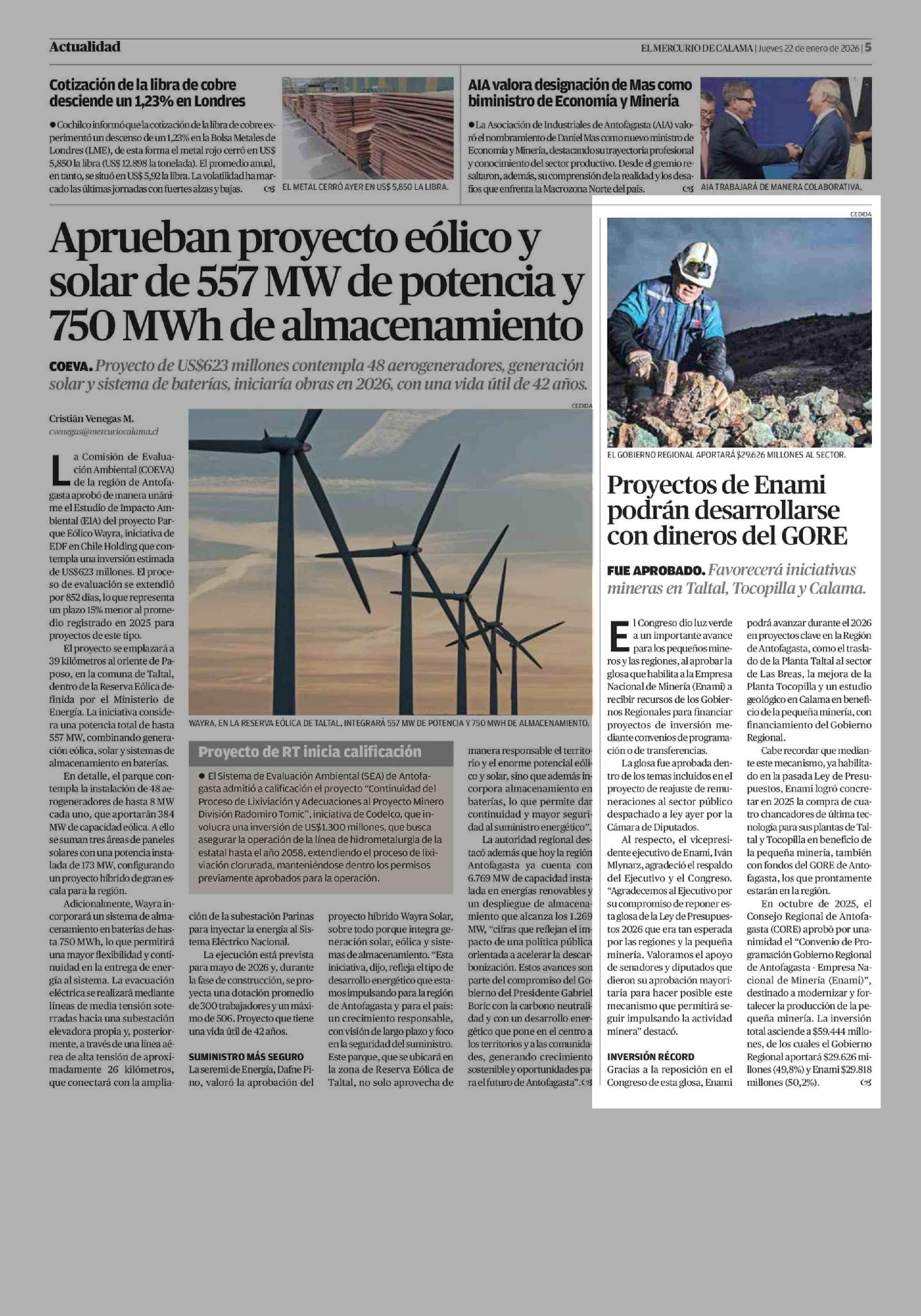 Proyectos de Enami podrán desarrollarse con dineros del GORE 22-01-2026 El Mercurio de Calama |