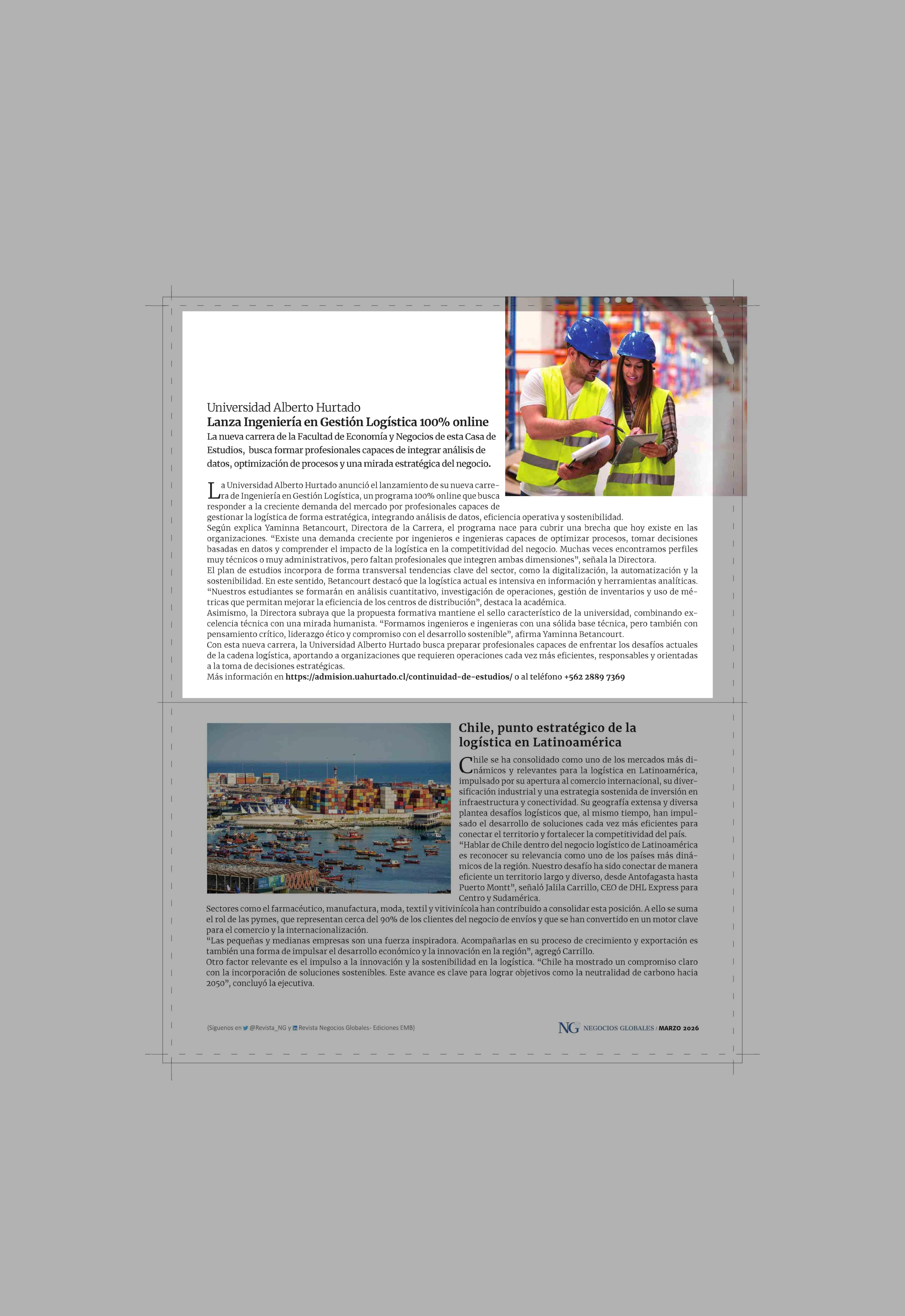 Universidad Alberto Hurtado Lanza Ingeniería en Gestión Logística online 24-03-2026 Revista NG |