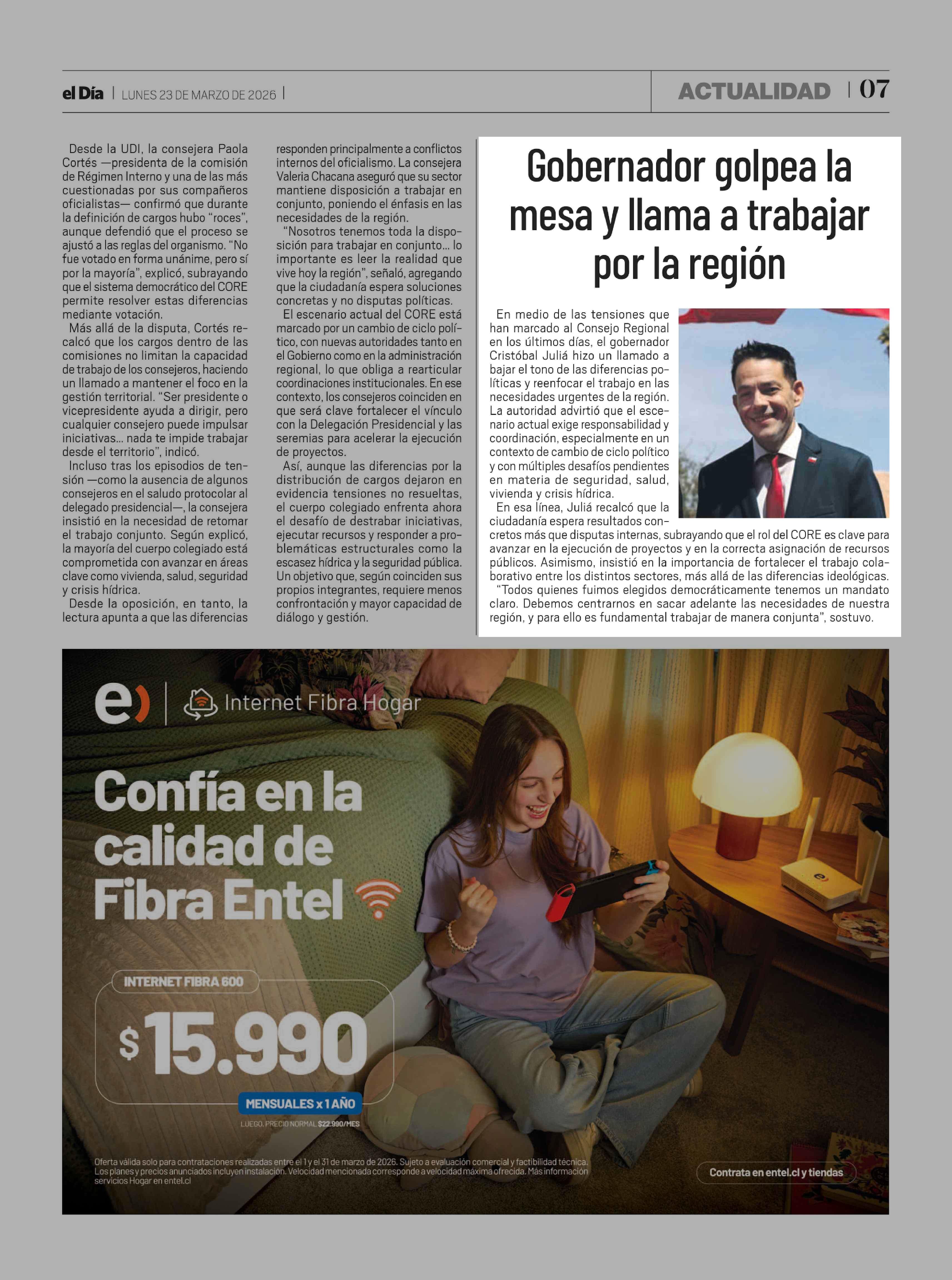 Gobernador golpea la mesa y llama a trabajar por la región 23-03-2026 El Día |