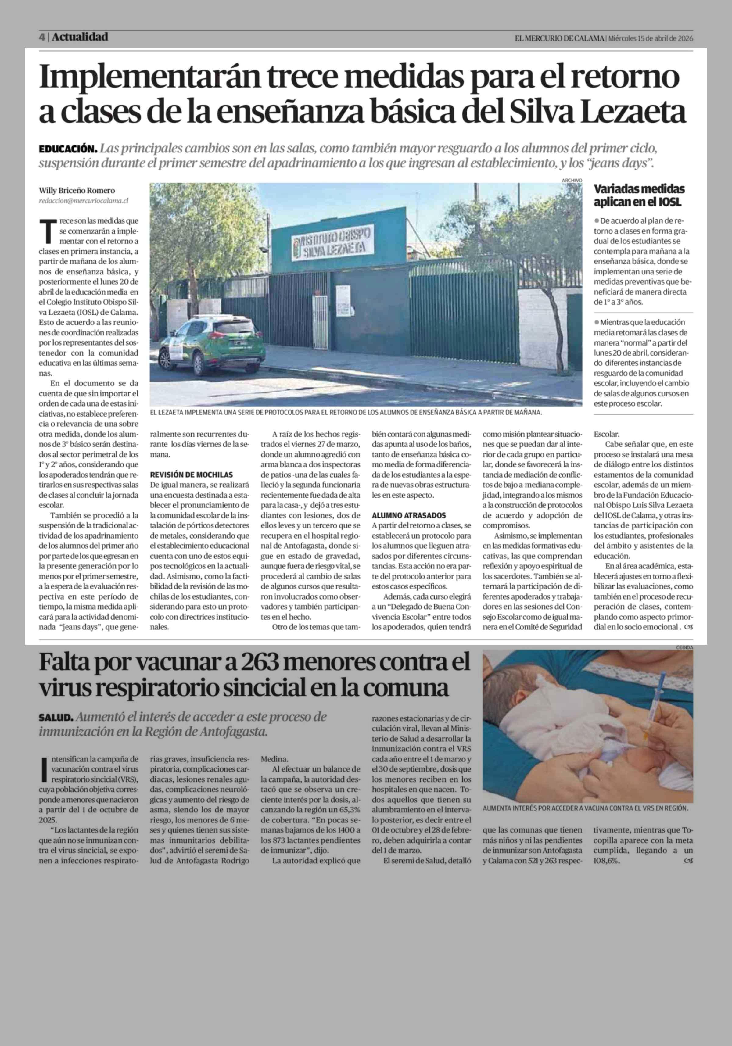 Implementarán trece medidas para el retorno a clases de la enseñanza básica del Silva Lezaeta 15-04-2026 El Mercurio de Calama |