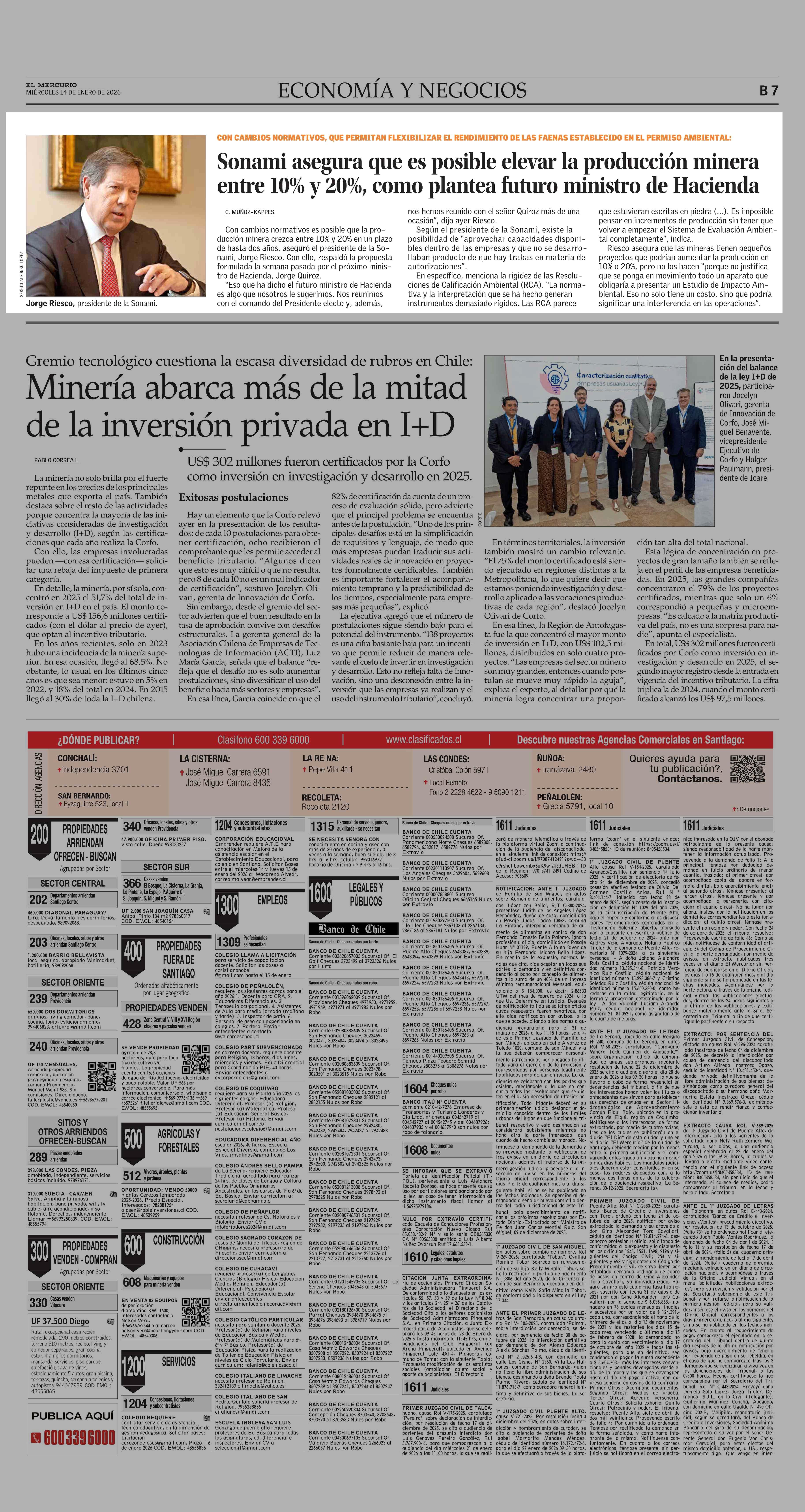 Sonami asegura que es posible elevar la producción minera entre 10% y 20%, como plantea futuro ministro de Hacienda 14-01-2026 El Mercurio |