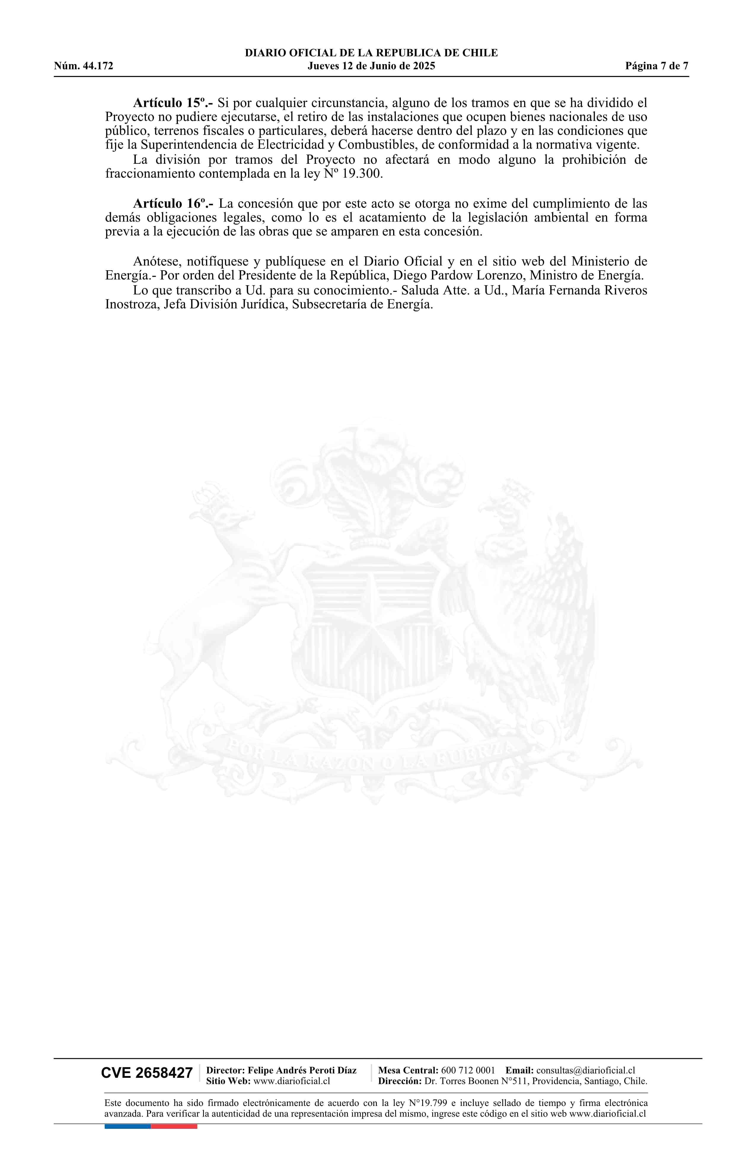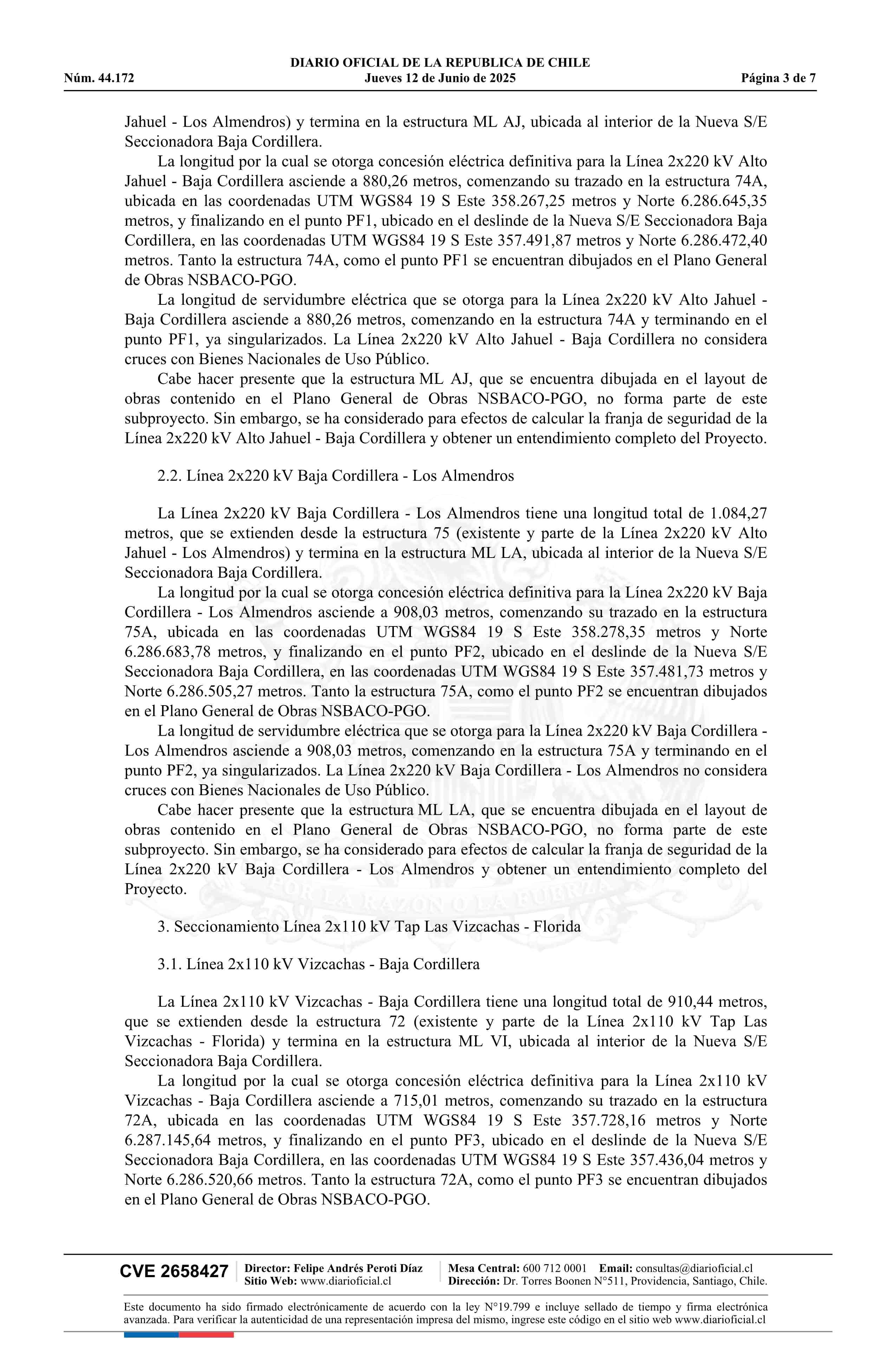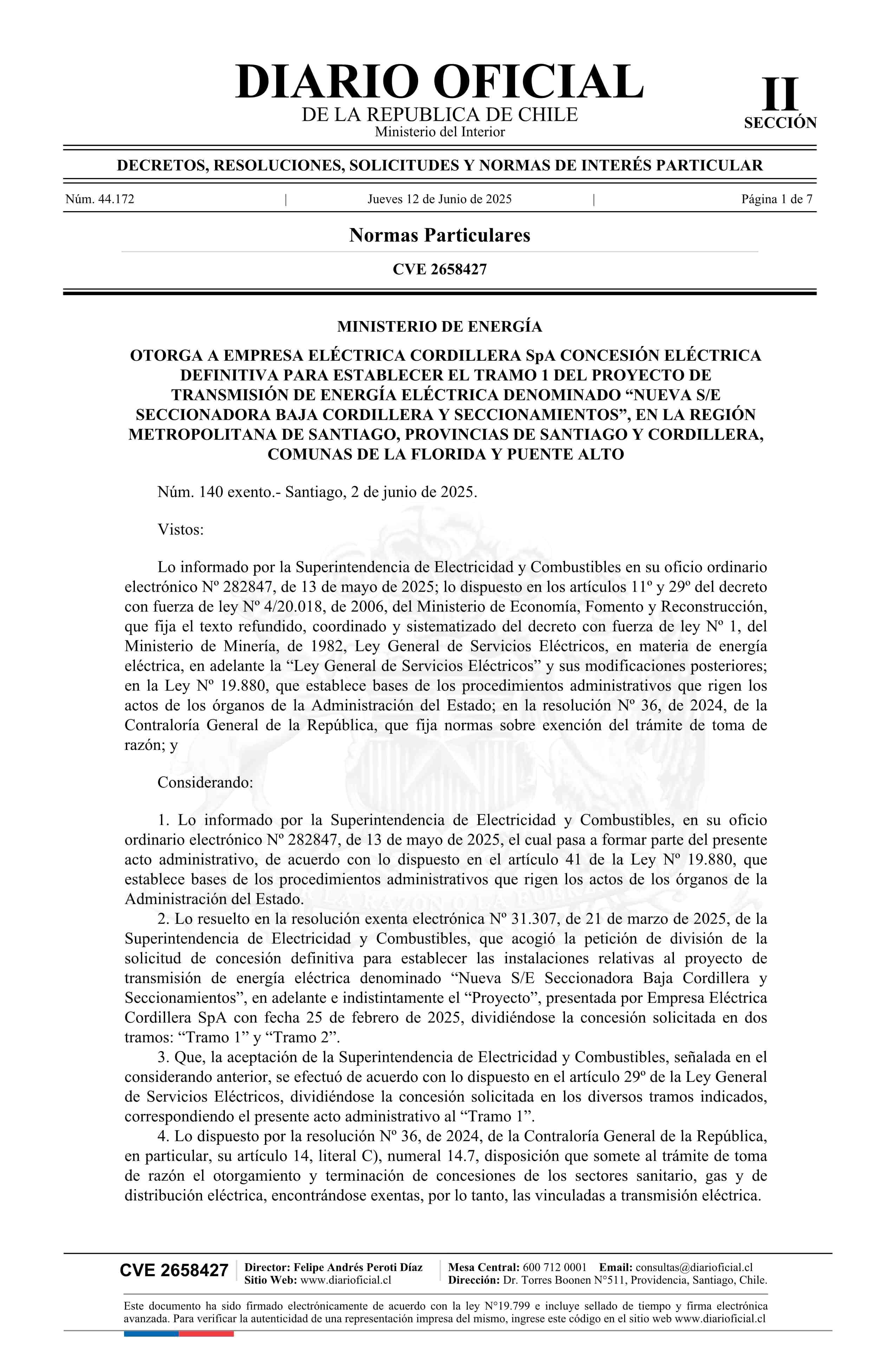 | Título: | Decreto exento número 140, de 2025.- Otorga a Empresa Eléctrica Cordillera SpA concesión eléctrica definitiva para establecer el Tramo 1 del proyecto de transmisión de energía eléctrica denominado Nueva S/E Seccionadora Baja Cordillera y Seccionamientos, en la Región Metropolitana de Santiago, provi |