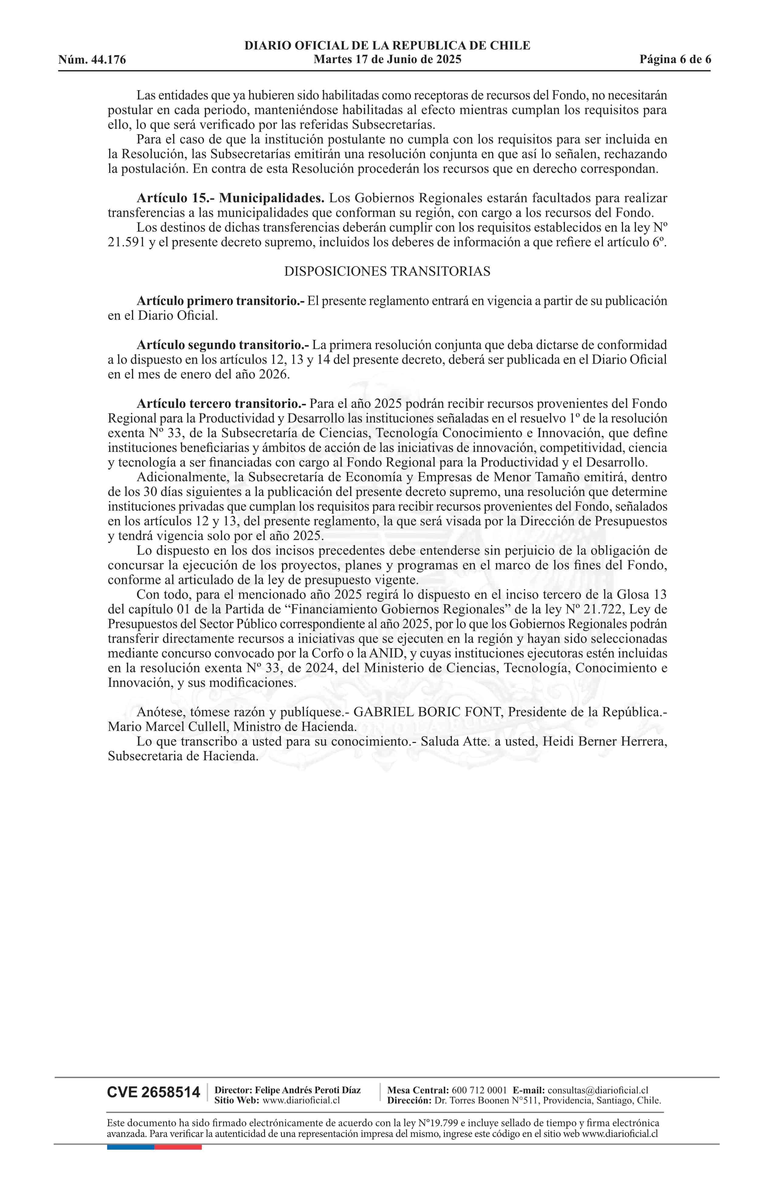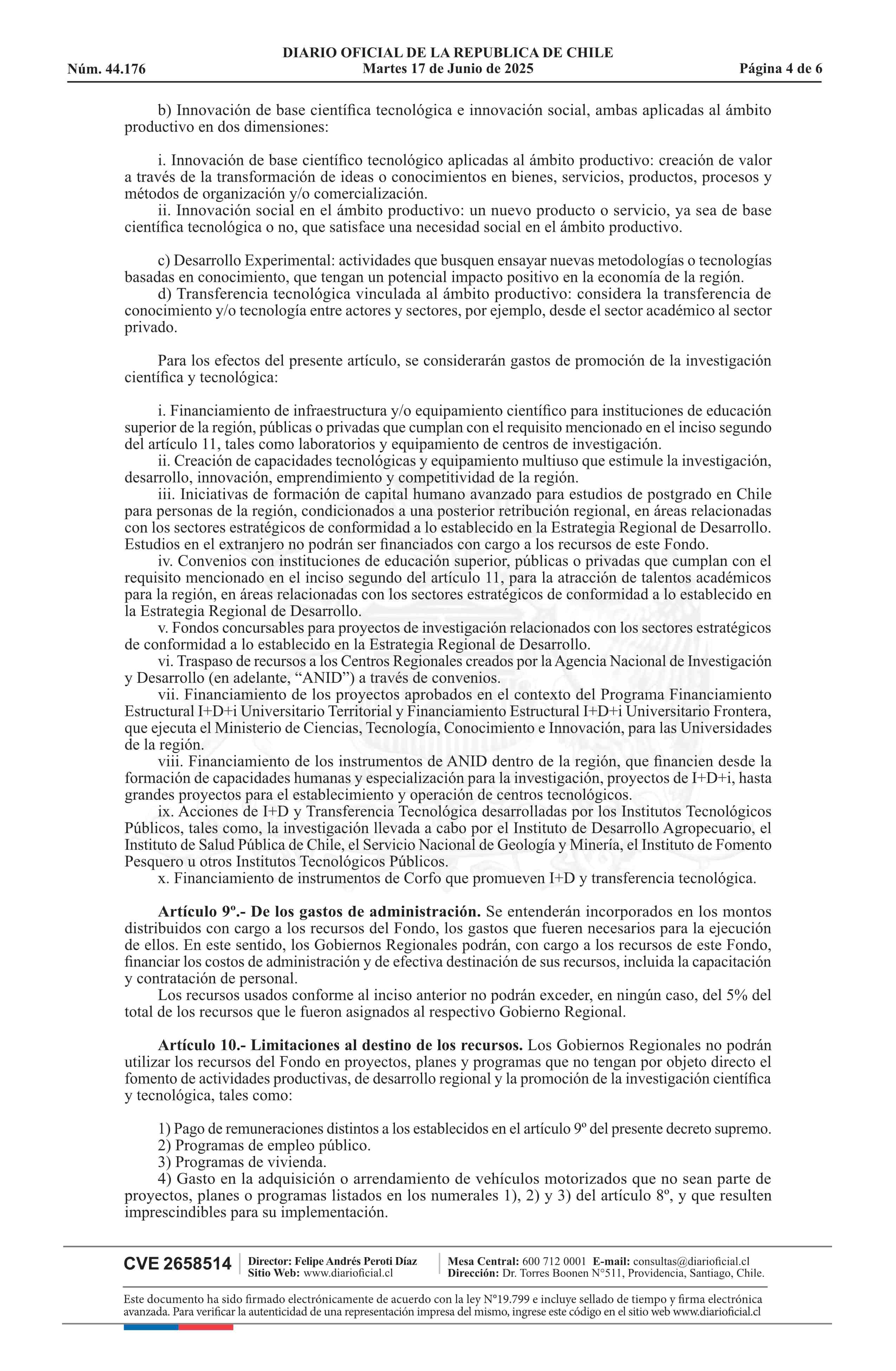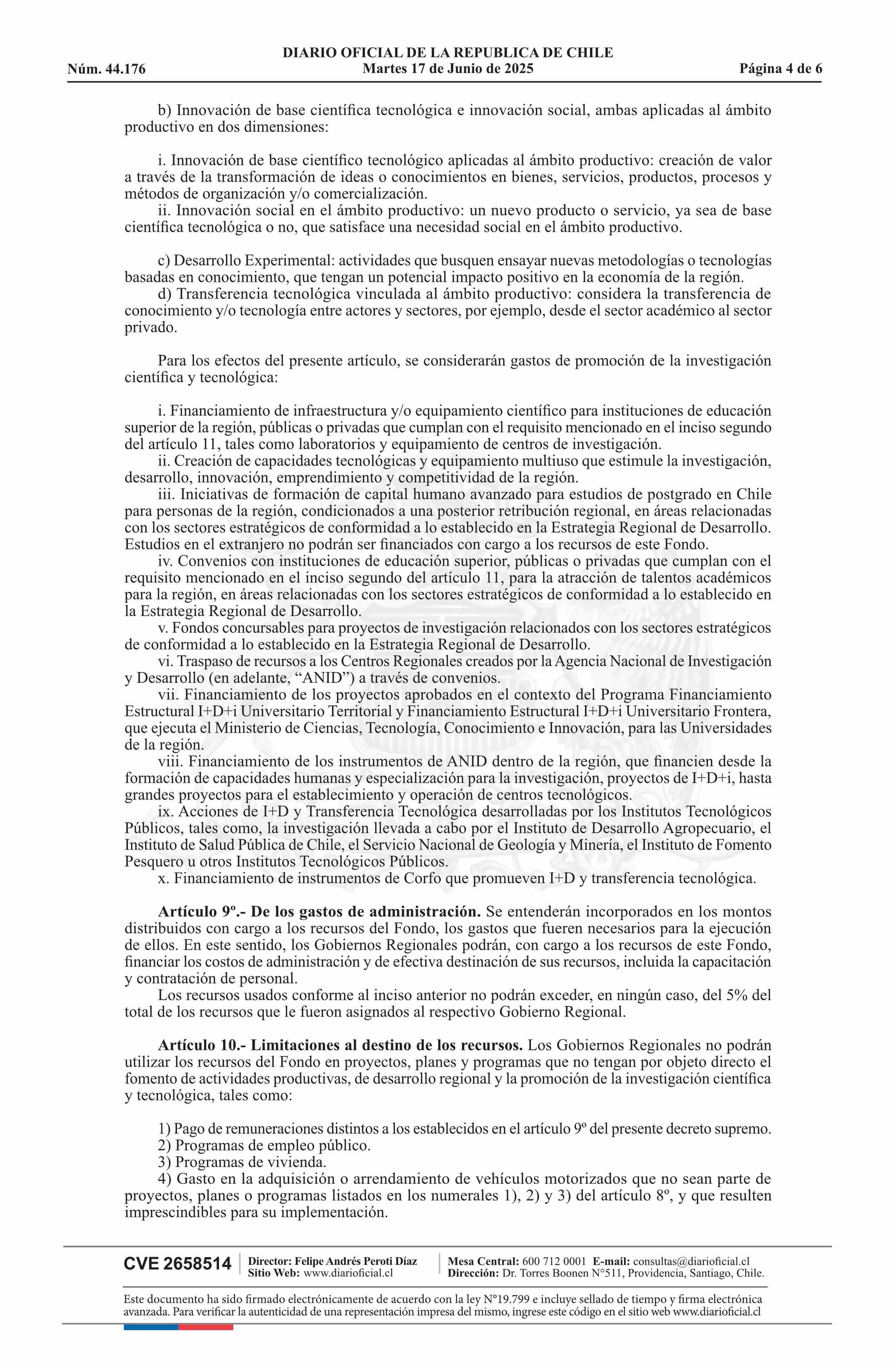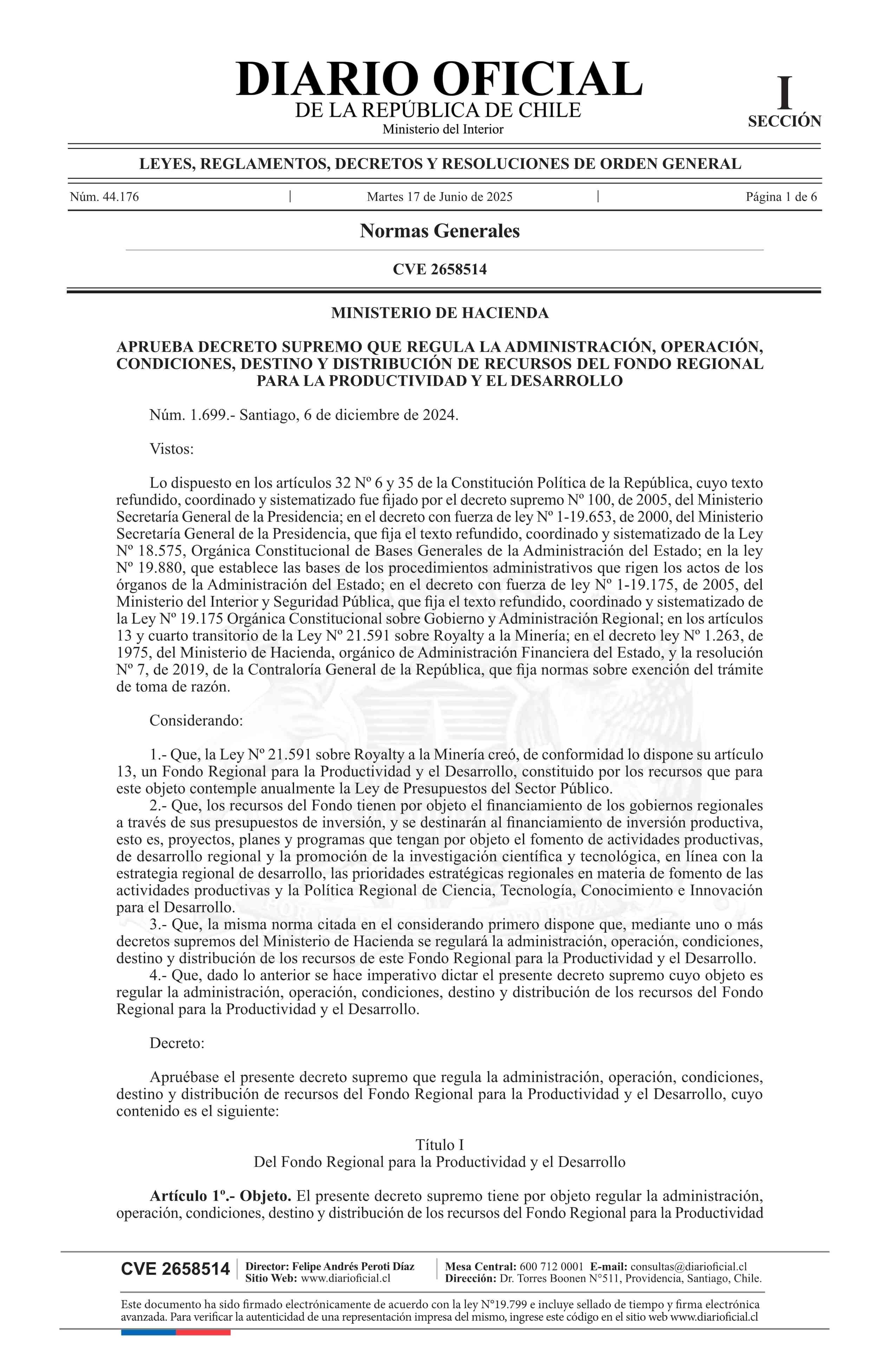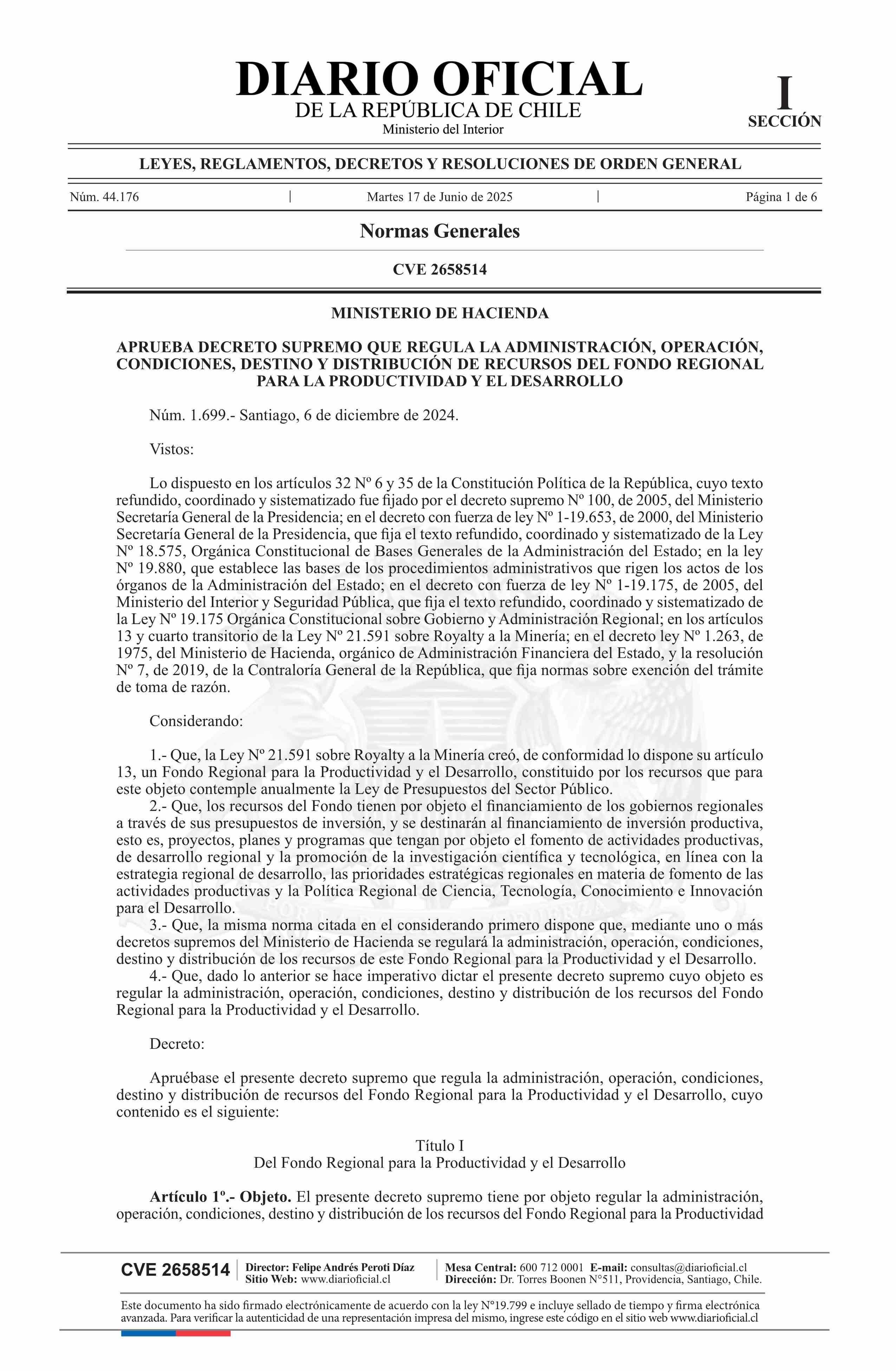 | Título: | Decreto número 1.699, de 2024.- Aprueba decreto supremo que regula la administración, operación, condiciones, destino y distribución de recursos del Fondo Regional para la Productividad y el Desarrollo |