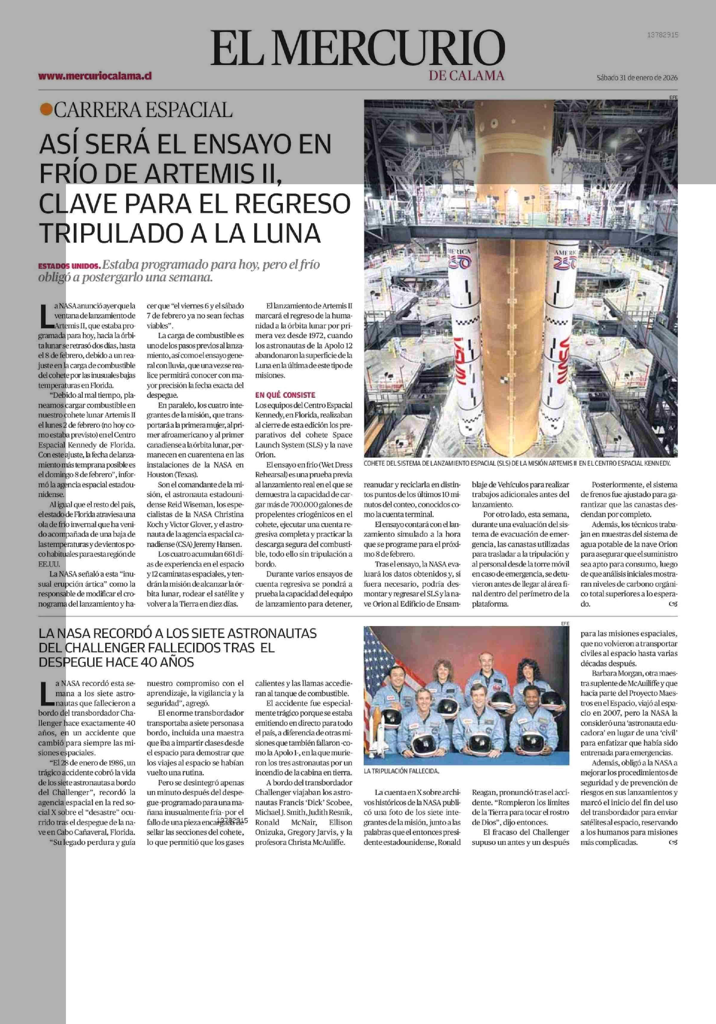ASÍ SERÁ EL ENSAYO EN FRÍO DE ARTEMIS II, CLAVE PARA EL REGRESO TRIPULADO ALA LUNA 31-01-2026 El Mercurio de Calama |
