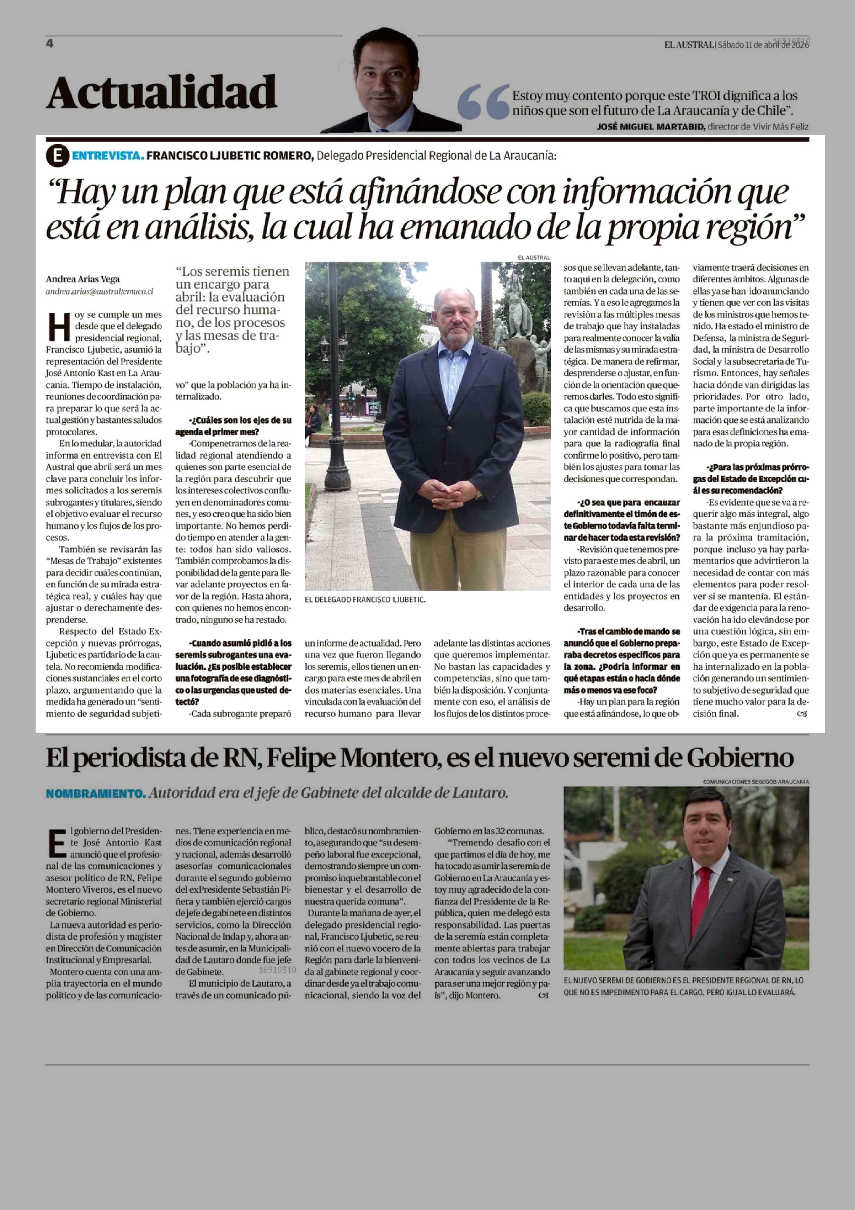 "Hay un plan que está afinándose con información que está en análisis, la cual ha emanado de la propia región" 11-04-2026 El Austral de la Araucanía |