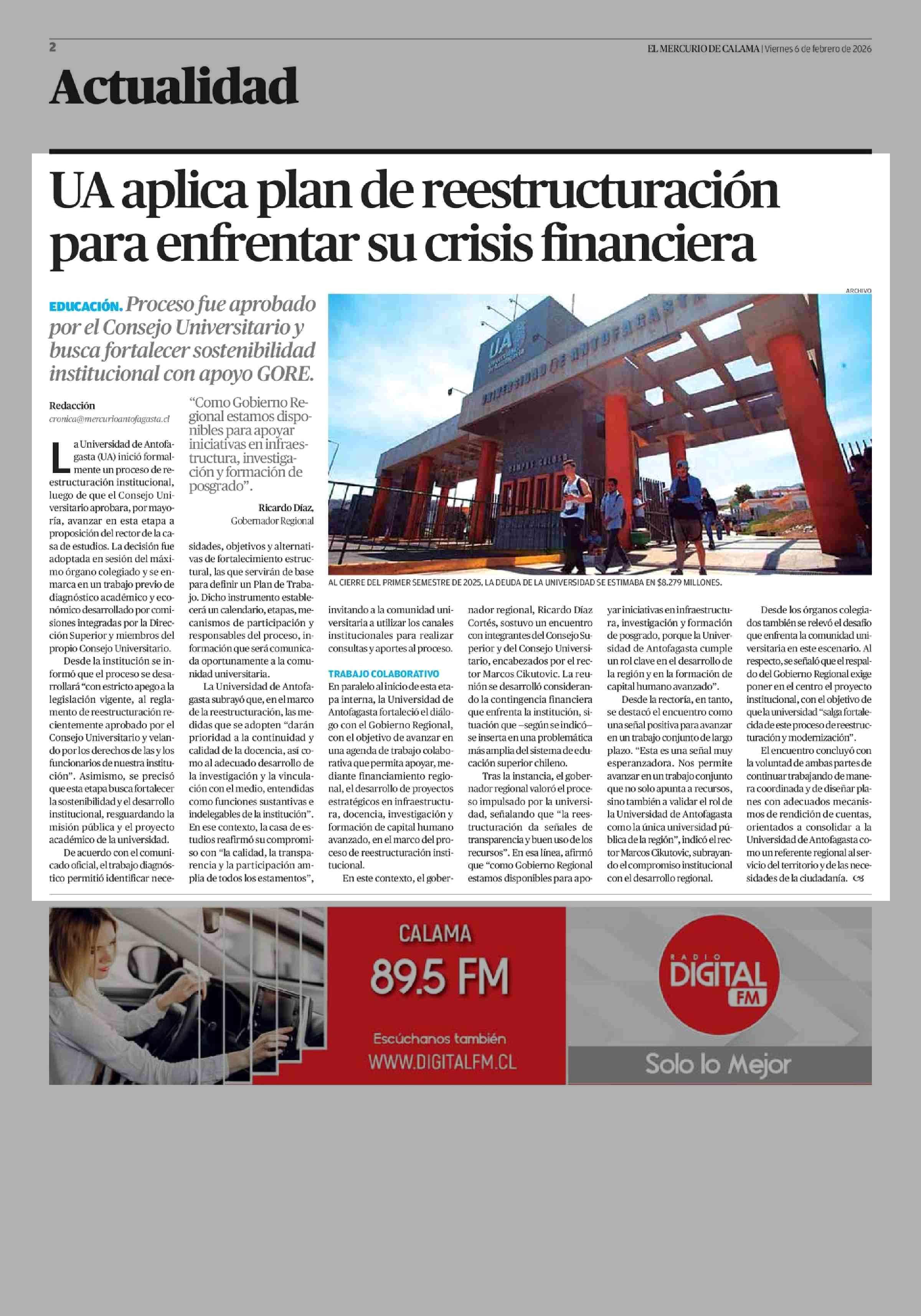 UA aplica plan de reestructuración para enfrentar su crisis financiera 06-02-2026 El Mercurio de Calama |