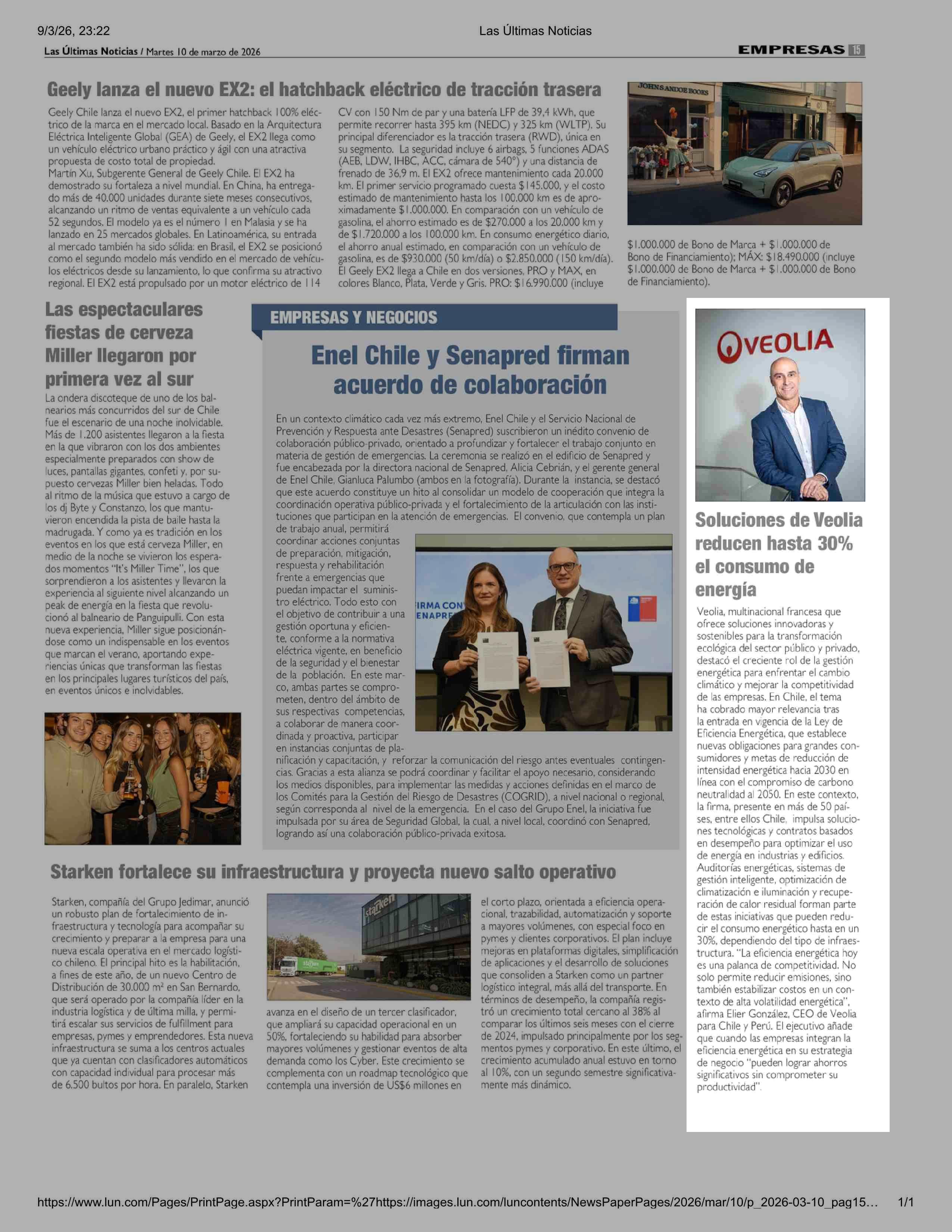 Soluciones de Veolia reducen hasta 30% el consumo de energía 10-03-2026 Las Últimas Noticias |