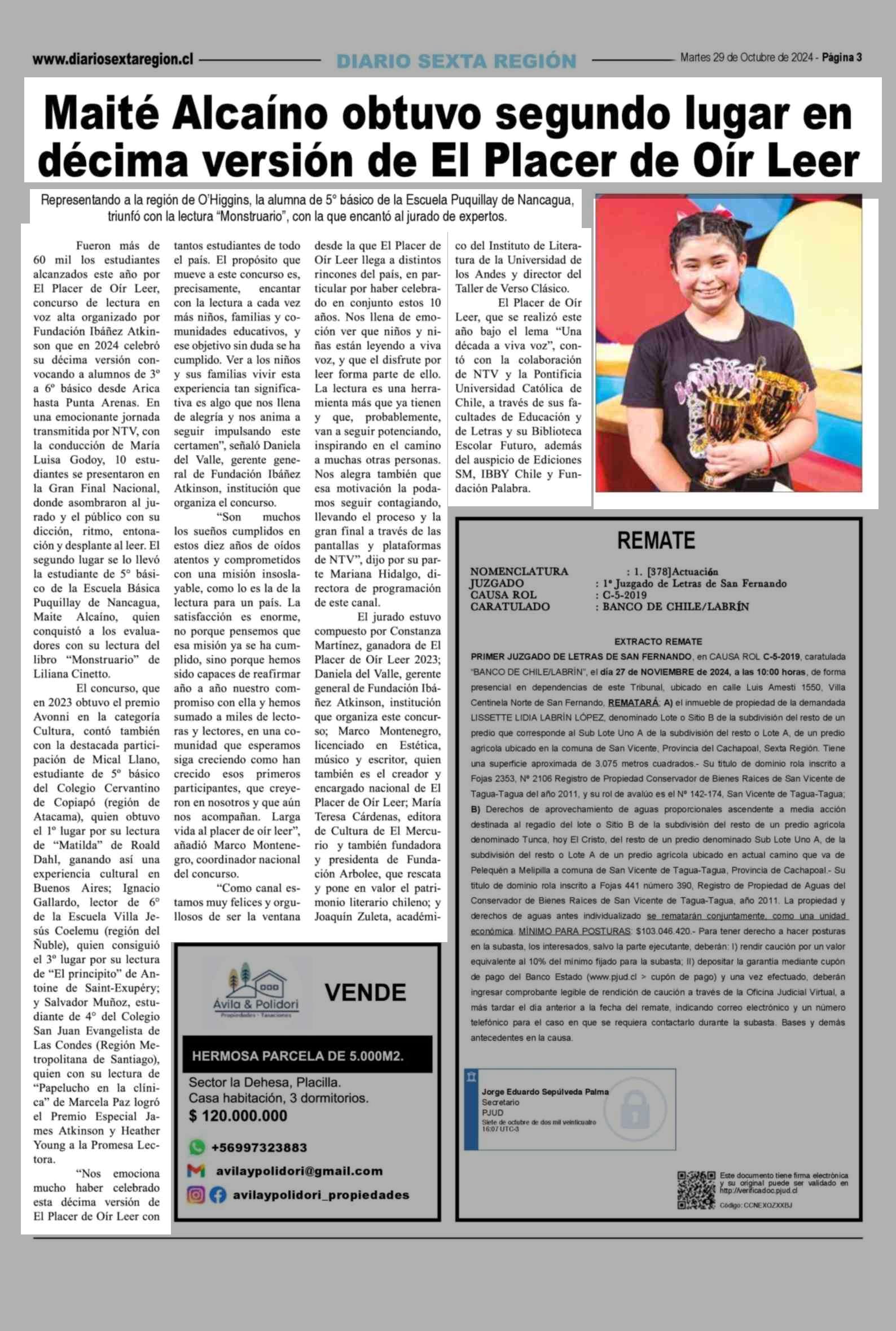 Maité Alcaíno obtuvo segundo lugar en décima versión de El Placer de Oír Leer 29-10-2024 Diario VI Región |