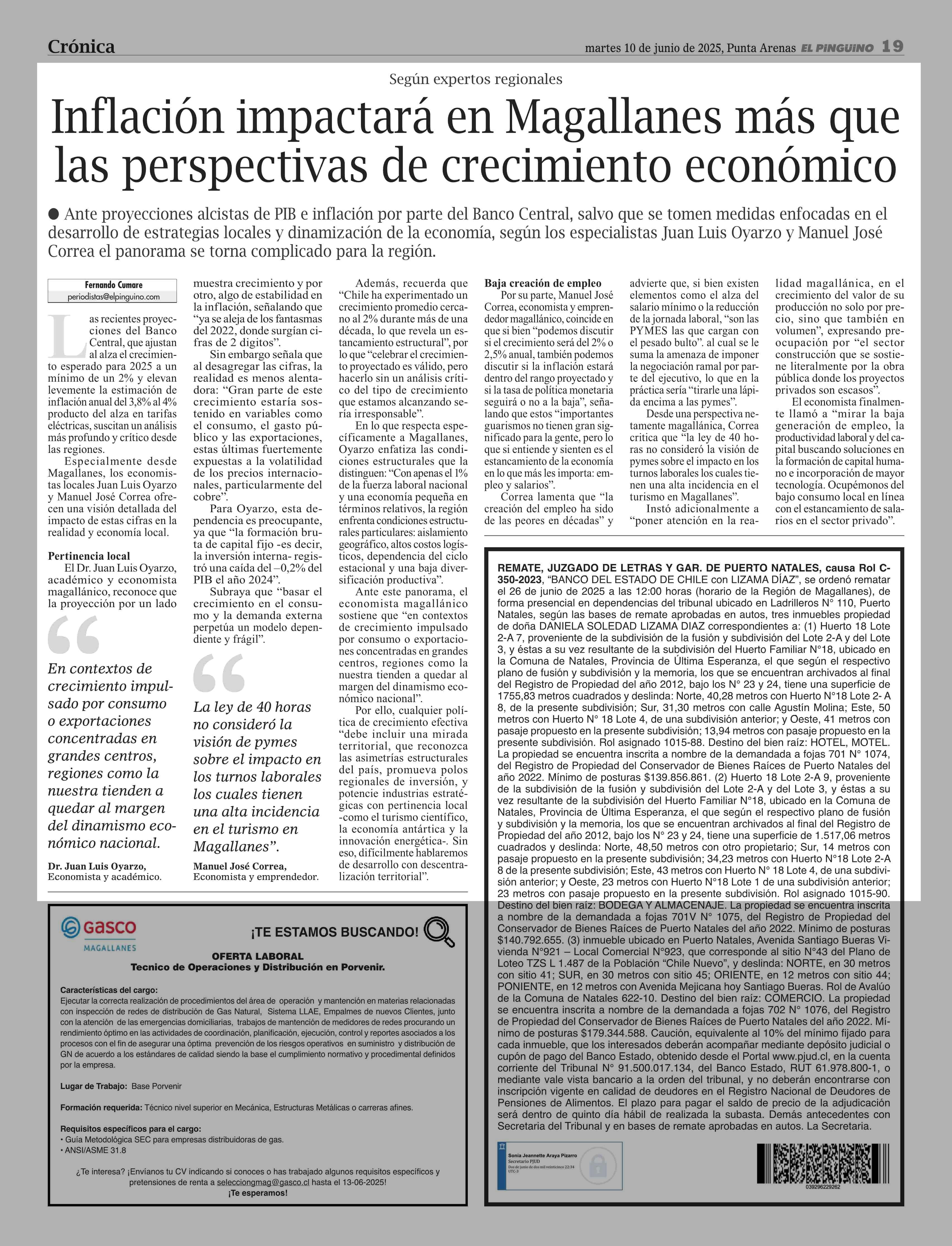 Inflación impactará en Magallanes más que las perspectivas de crecimiento económico 10-06-2025 El Pingüino |