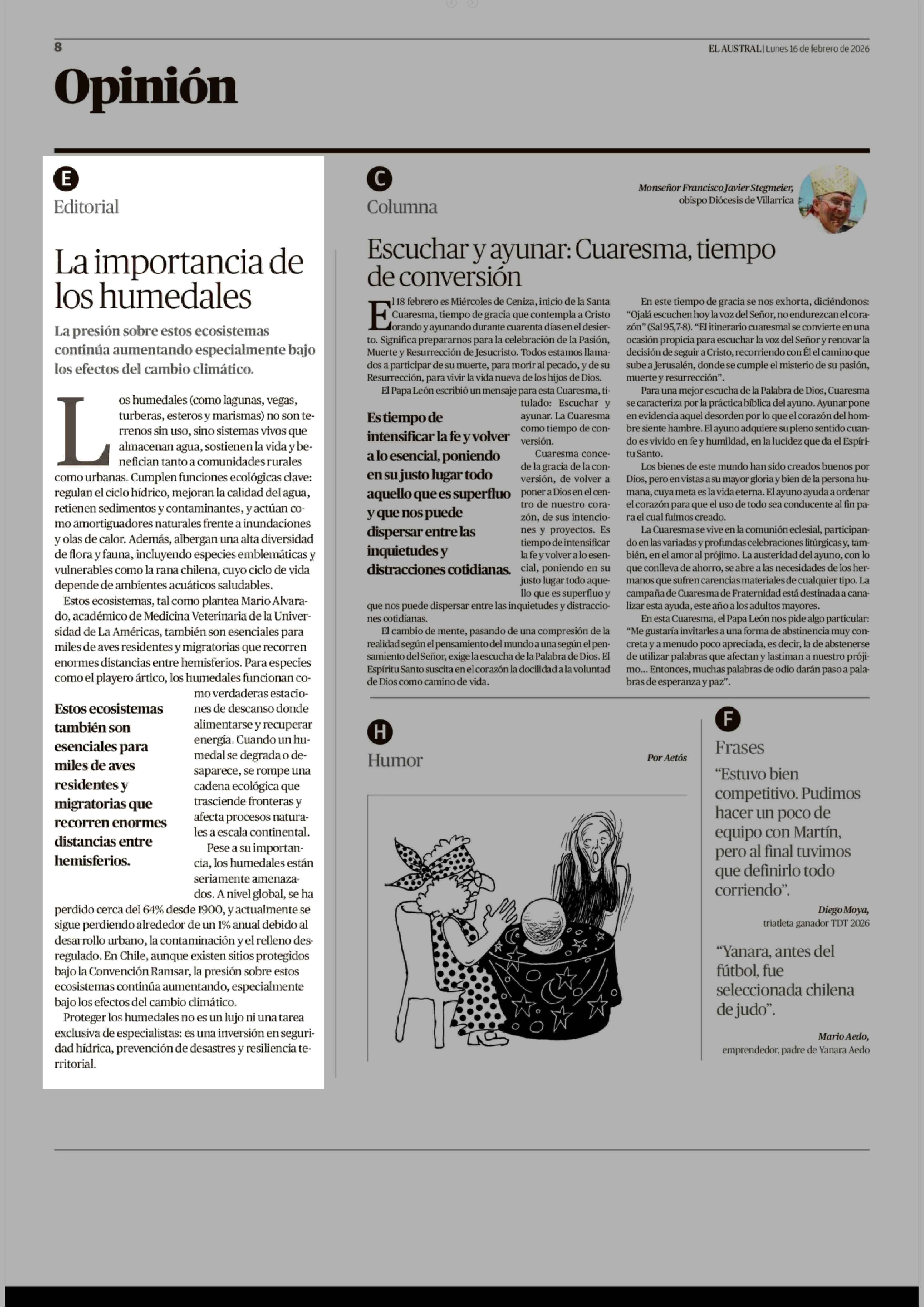 Editorial: La importancia de los humedales 16-02-2026 El Austral de la Araucanía |