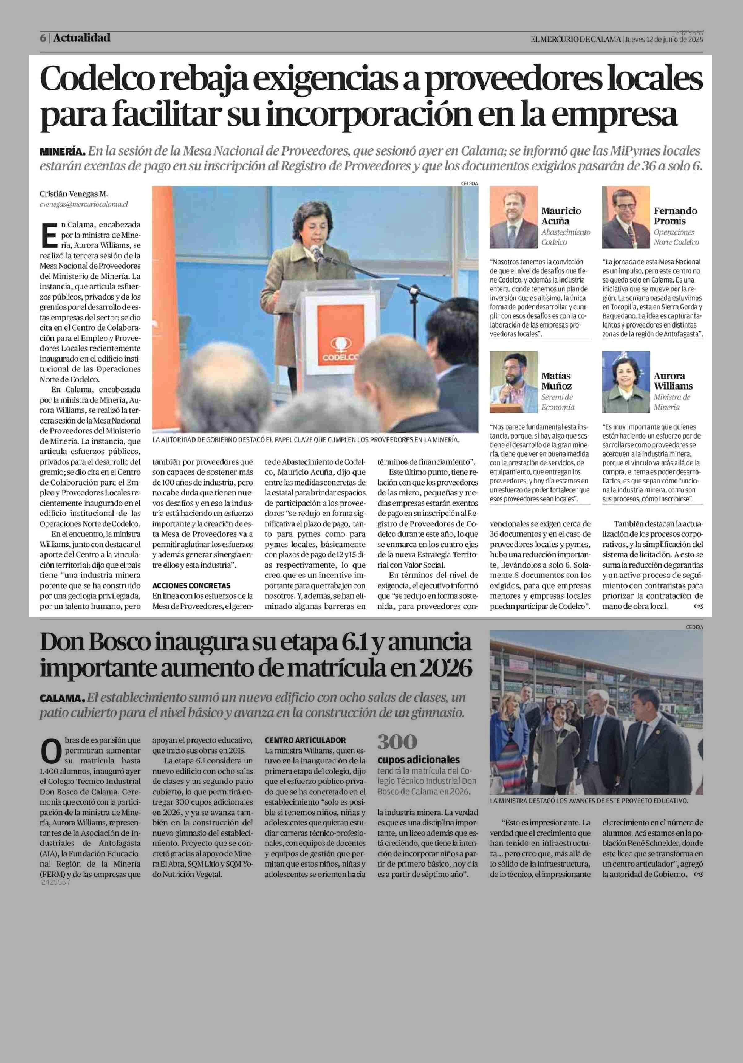Codelco rebaja exigencias a proveedores locales para facilitar su incorporación en la empresa 12-06-2025 El Mercurio de Calama |