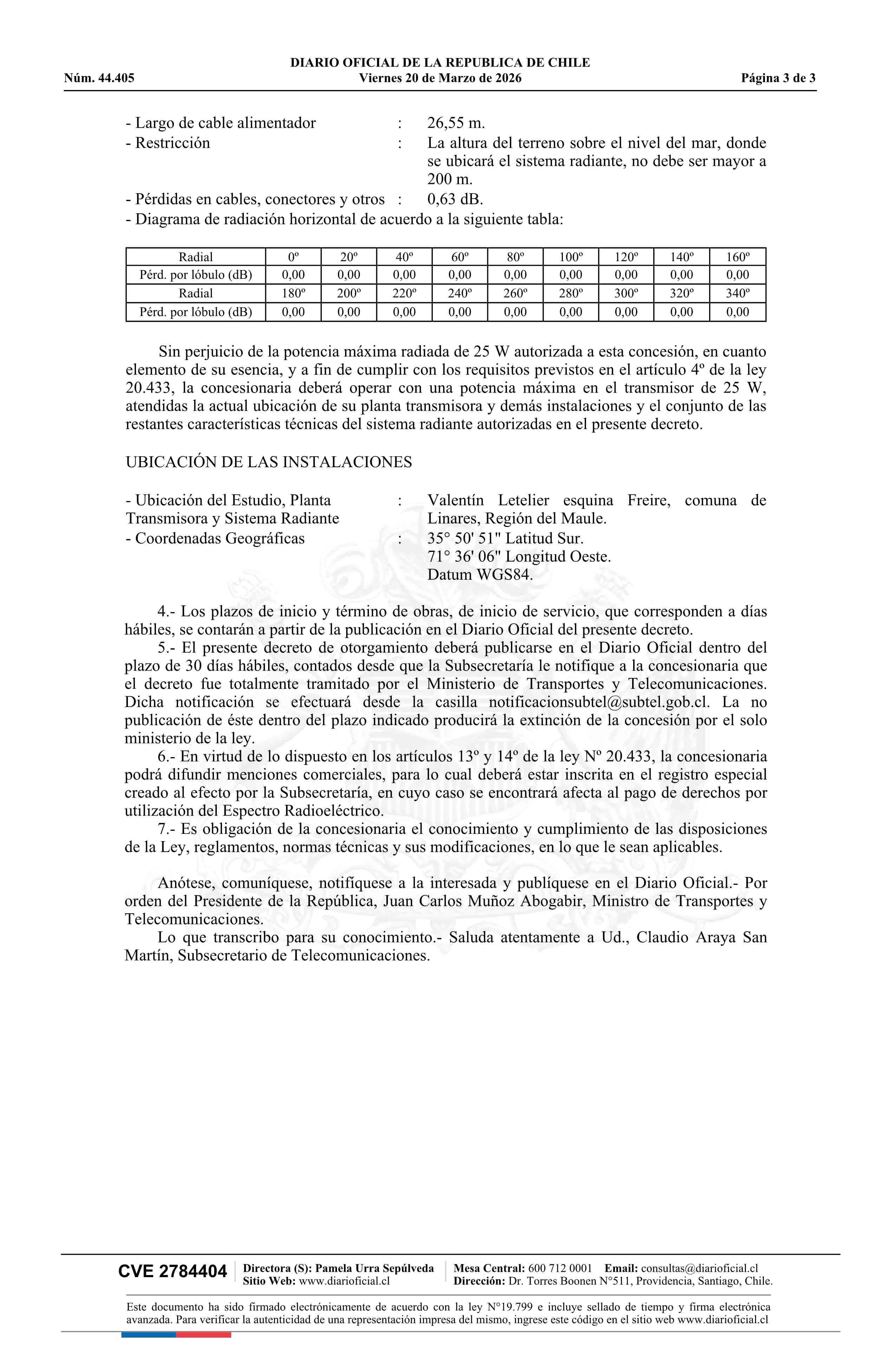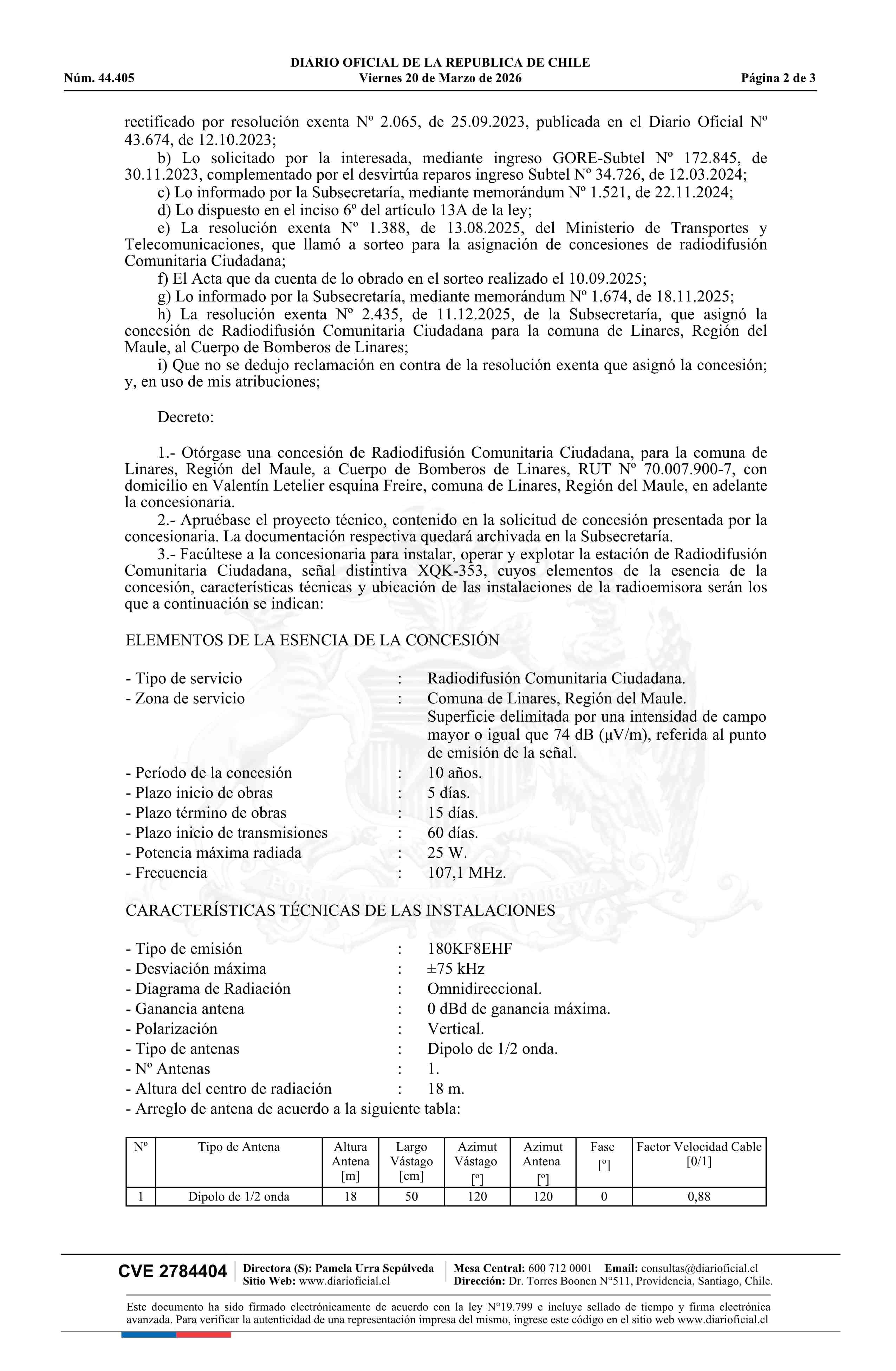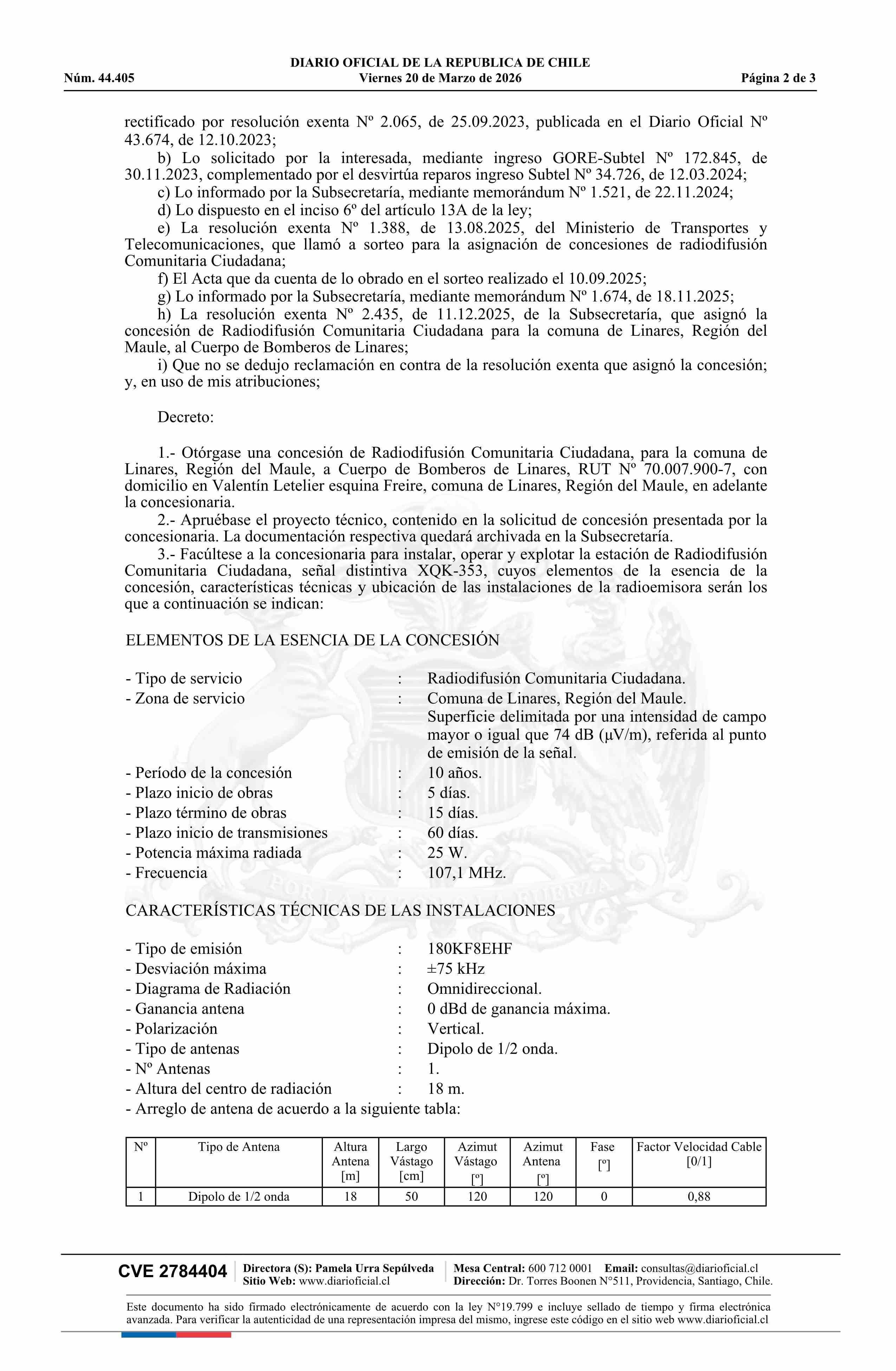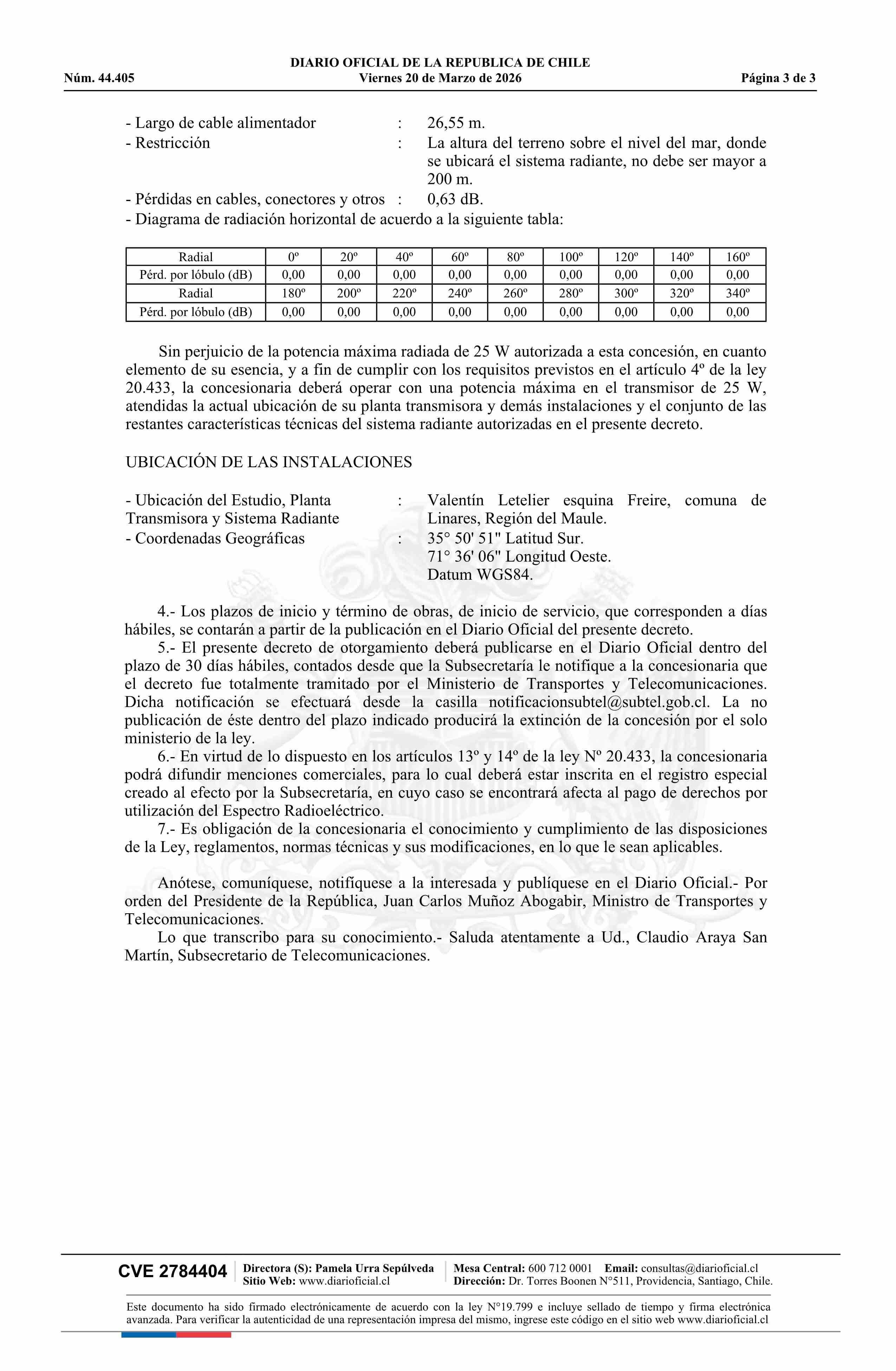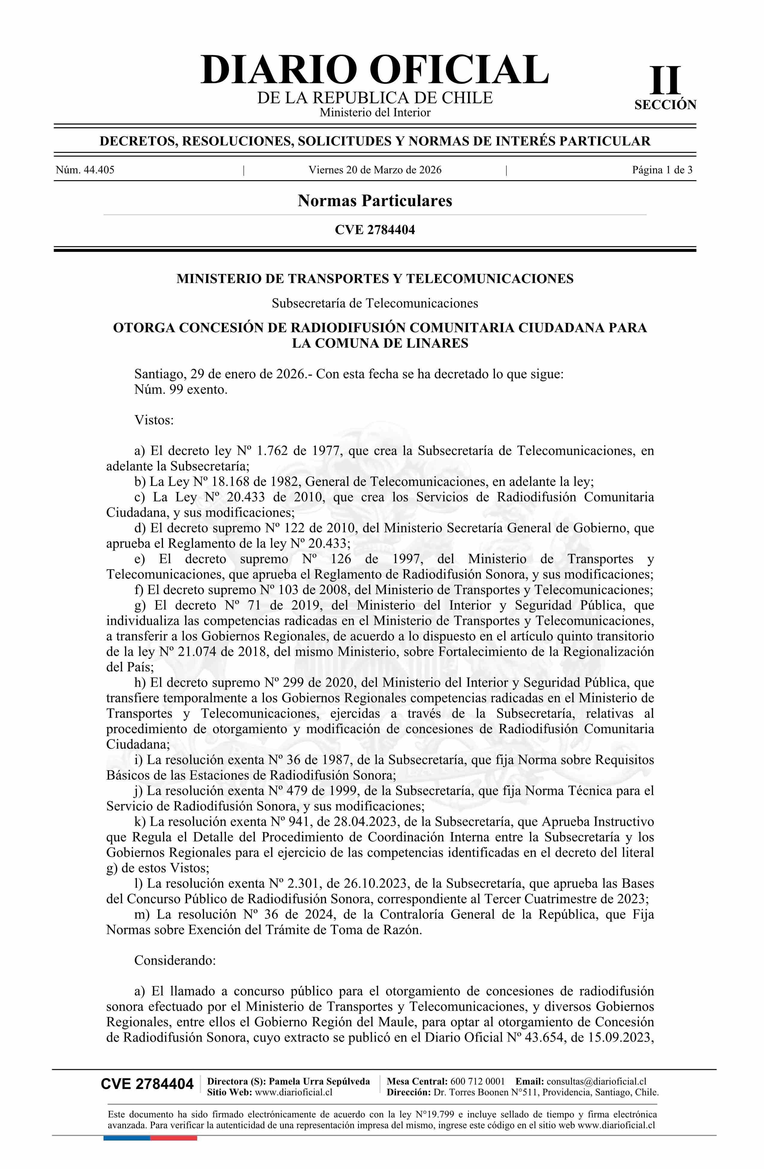 Decreto exento número 99, de 2026.- Otorga concesión de radiodifusión comunitaria ciudadana para la comuna de Linares 20-03-2026 Diario Oficial Edición Electrónica |