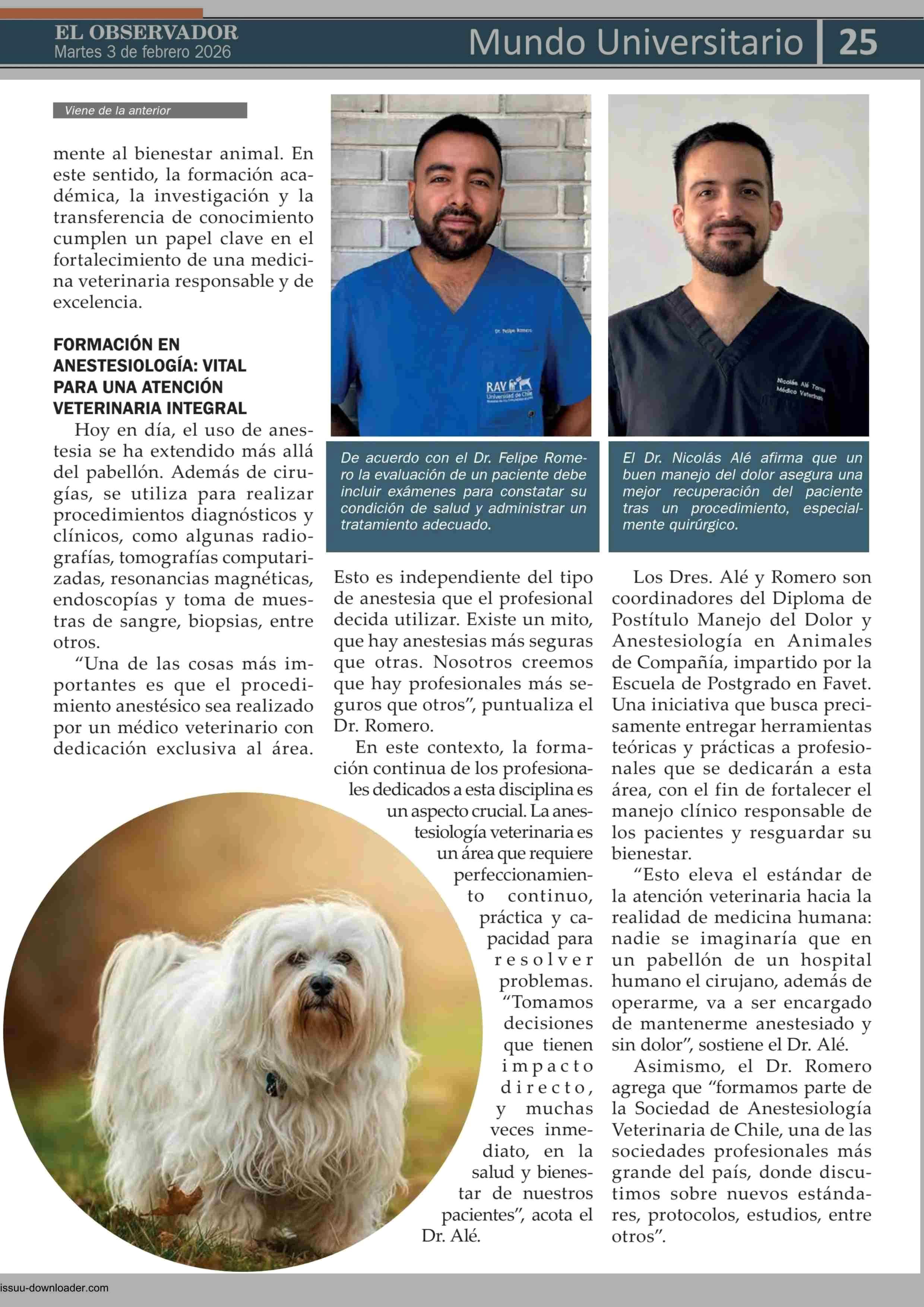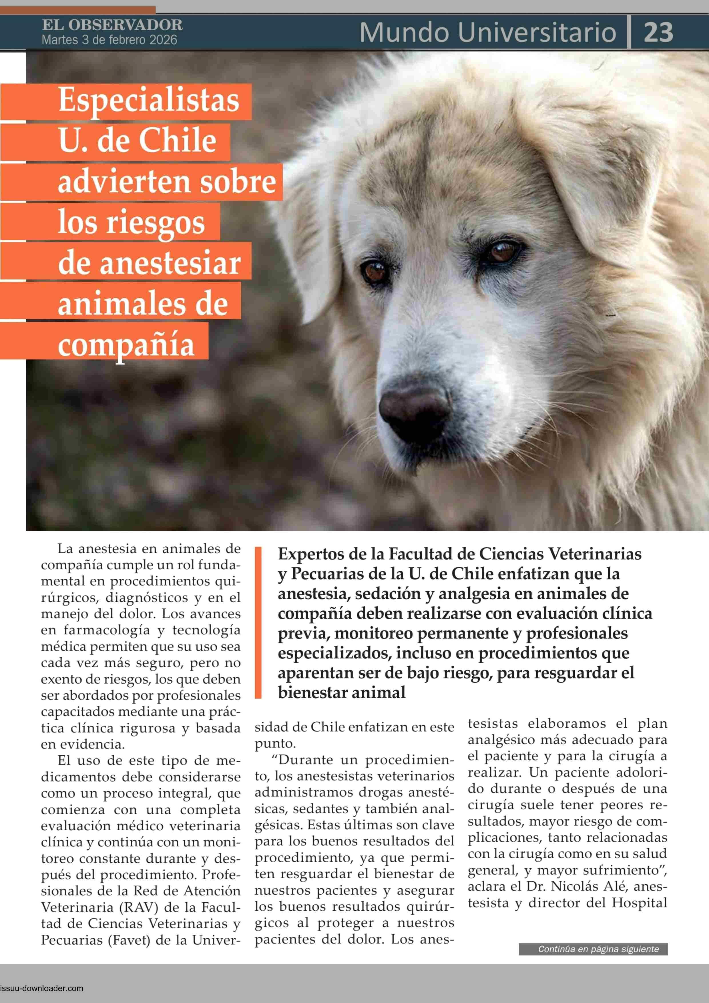 Especialit U. de Chile advierten sobre los riesgos de anestesiar animales de compañía 03-02-2026 El Observador Vespertino |