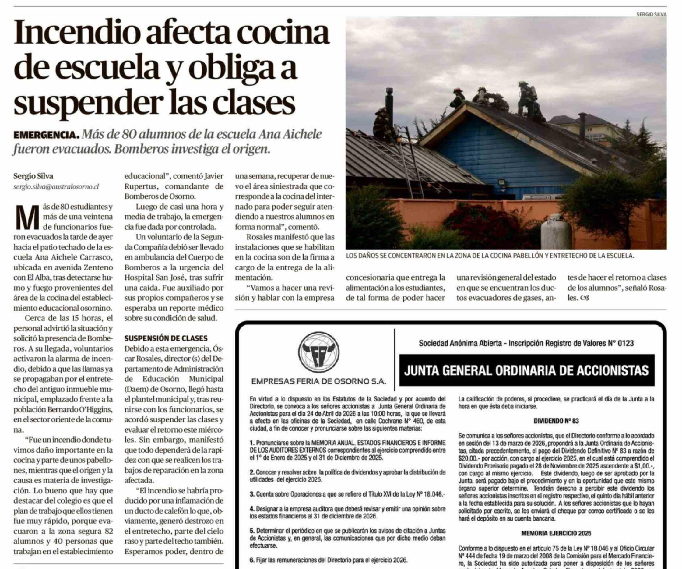 Incendio afecta cocina de escuela y obliga a suspender las clases 14-04-2026 El Austral de Osorno |
