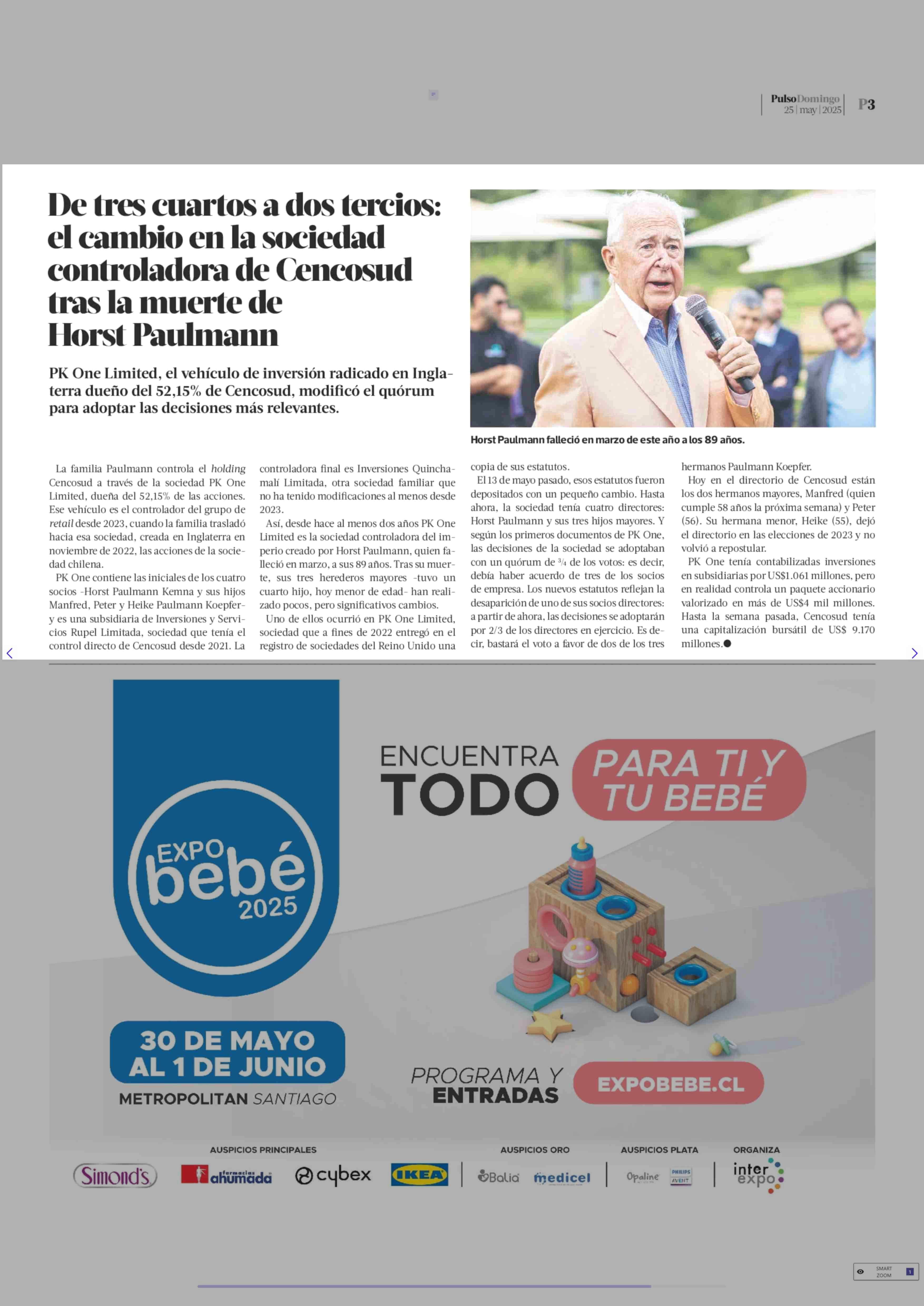 De tres cuartos a dos tercios: el cambio en la sociedad controladora de Cencosud tras la muerte de Horst Paulmann 25-05-2025 La Tercera |