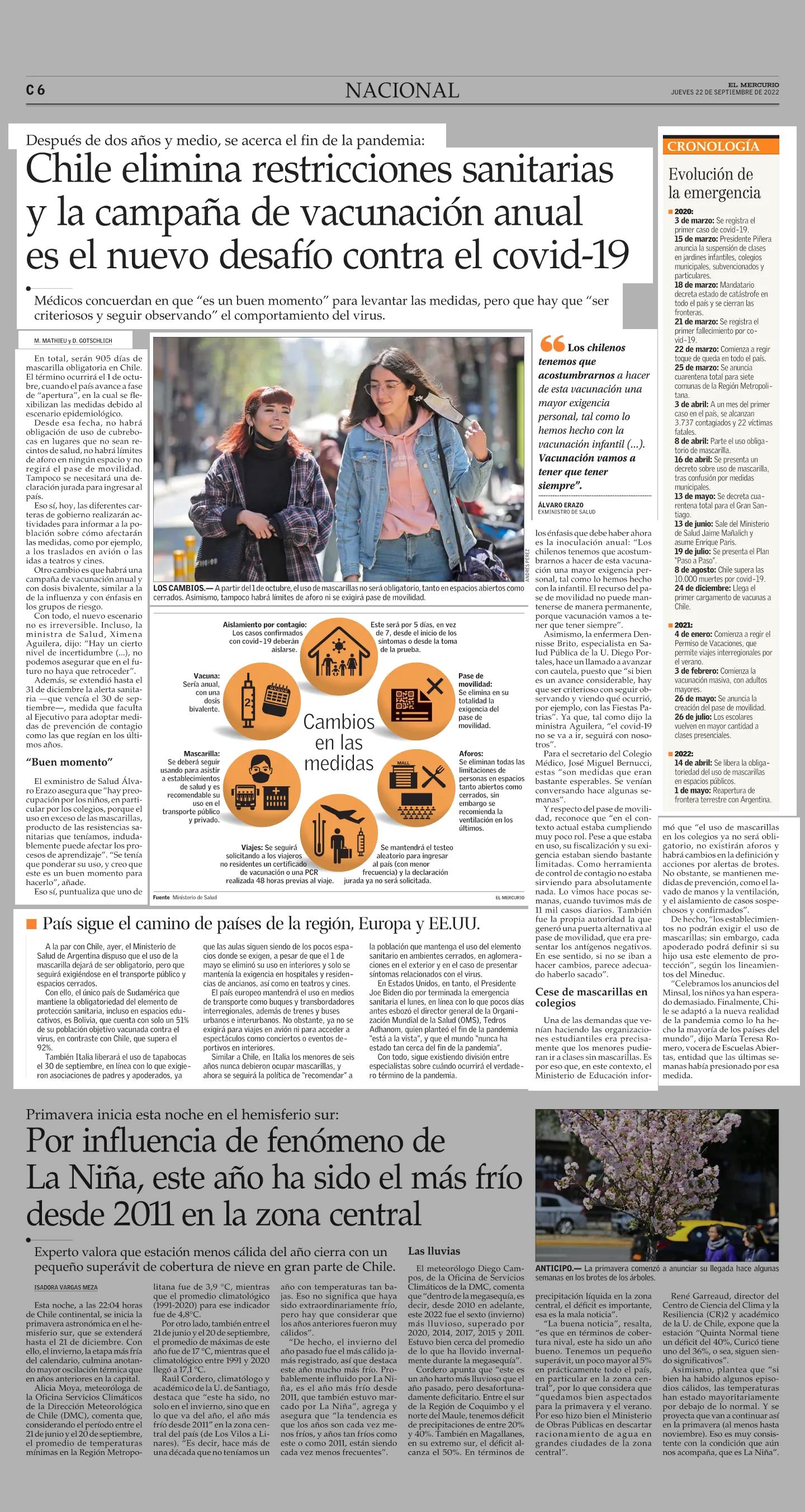 Chile elimina restricciones sanitarias y la campaña de vacunación anual es el nuevo desafío contra el covid-19 22-09-2022 El Mercurio |