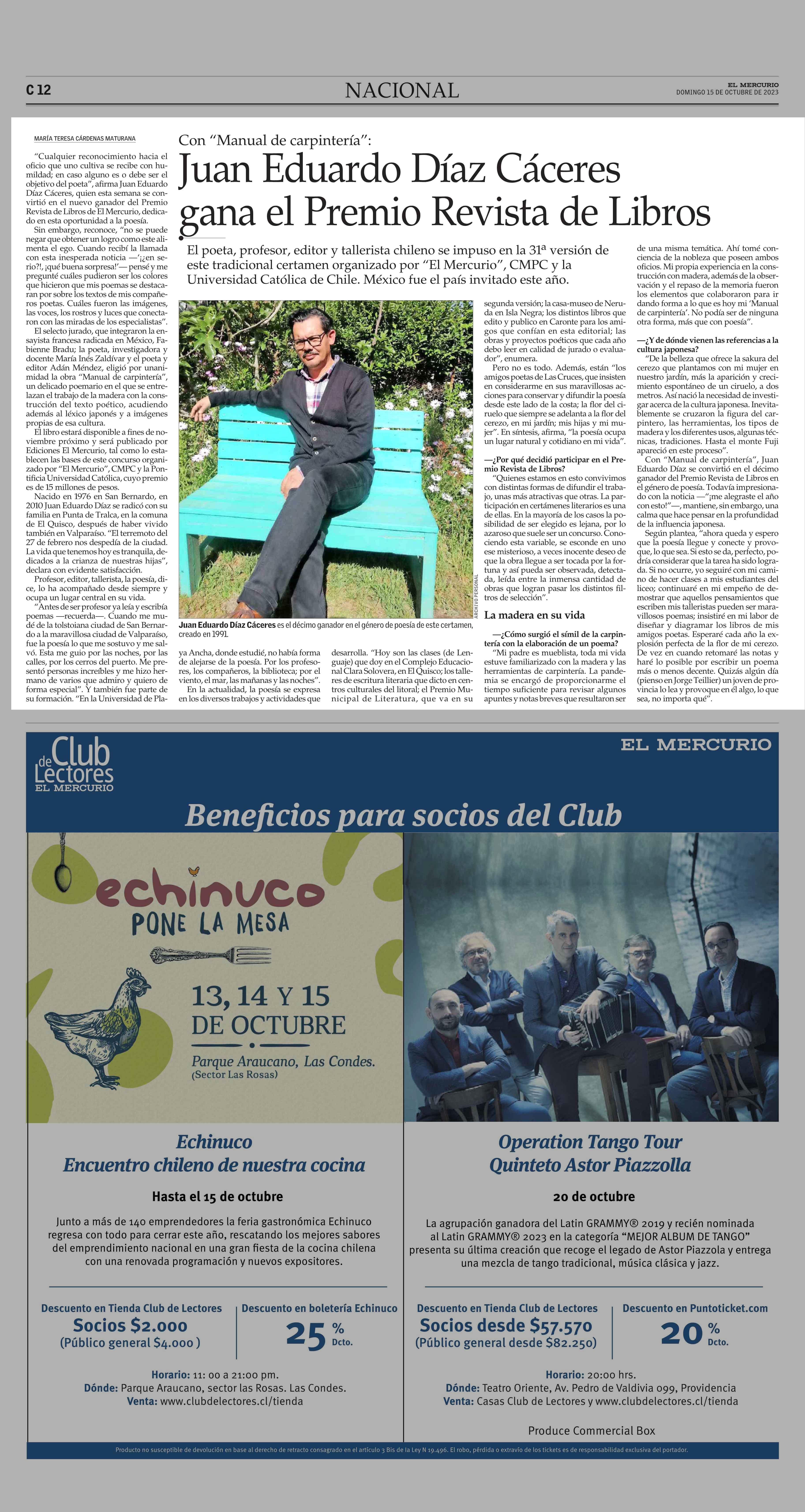 Juan Eduardo Díaz Cáceres gana el Premio Revista de Libros 15-10-2023 El Mercurio |