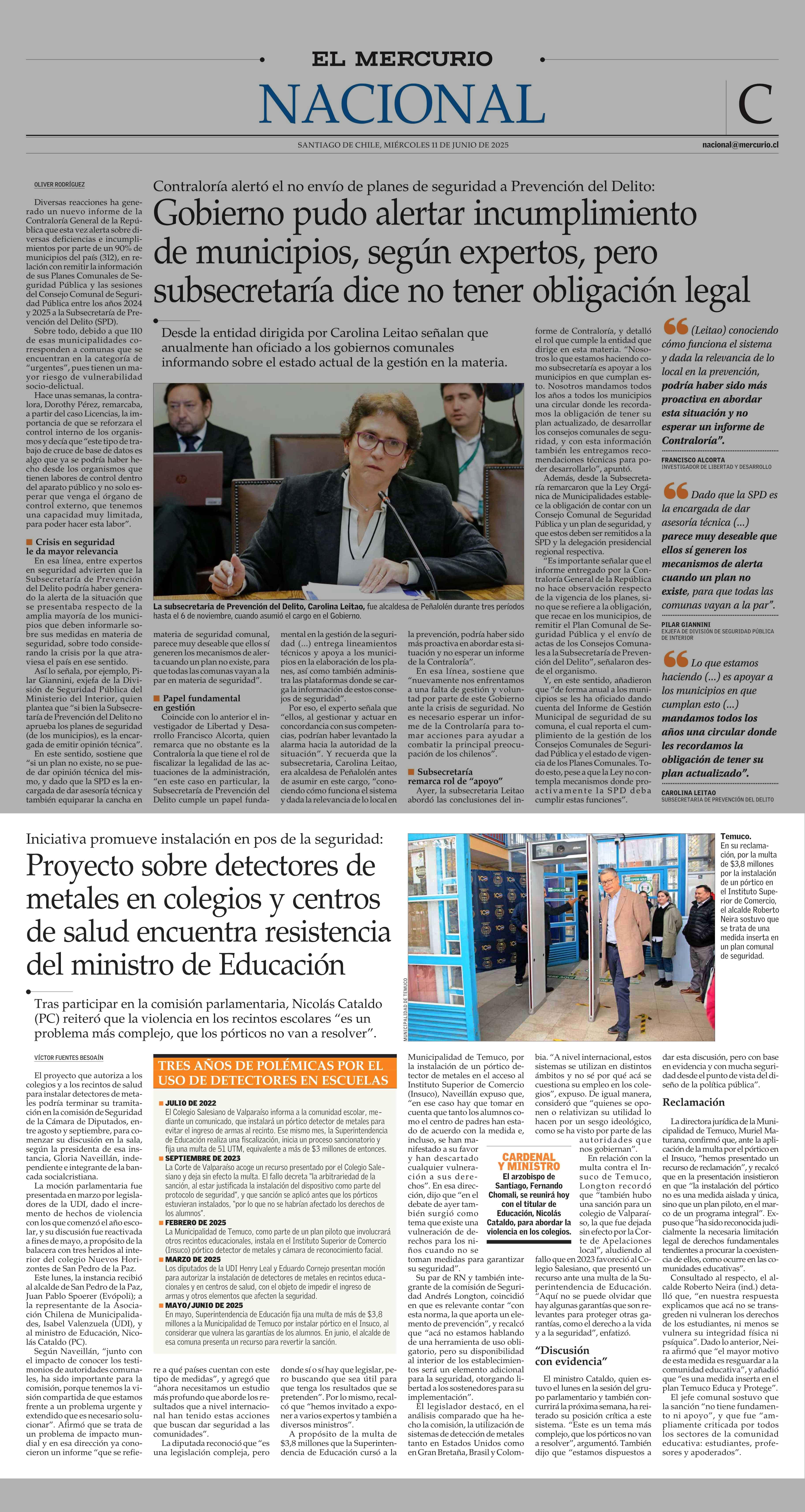 Proyecto sobre detectores de metales en colegios y centros de salud encuentra resistencia del ministro de Educación 11-06-2025 El Mercurio |