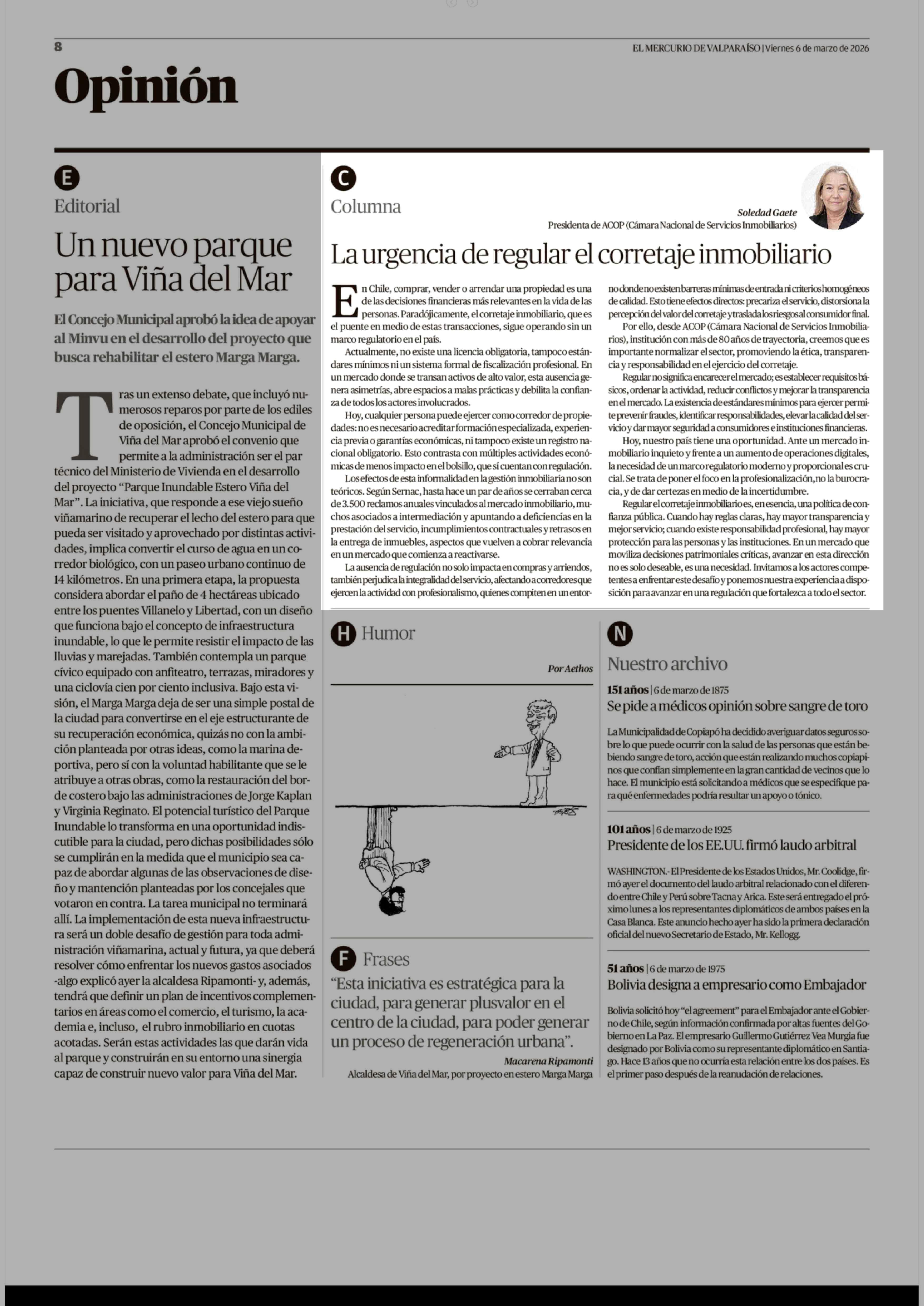 Columnas de Opinión: La urgencia de regular el corretaje inmobiliario 06-03-2026 El Mercurio de Valparaíso |