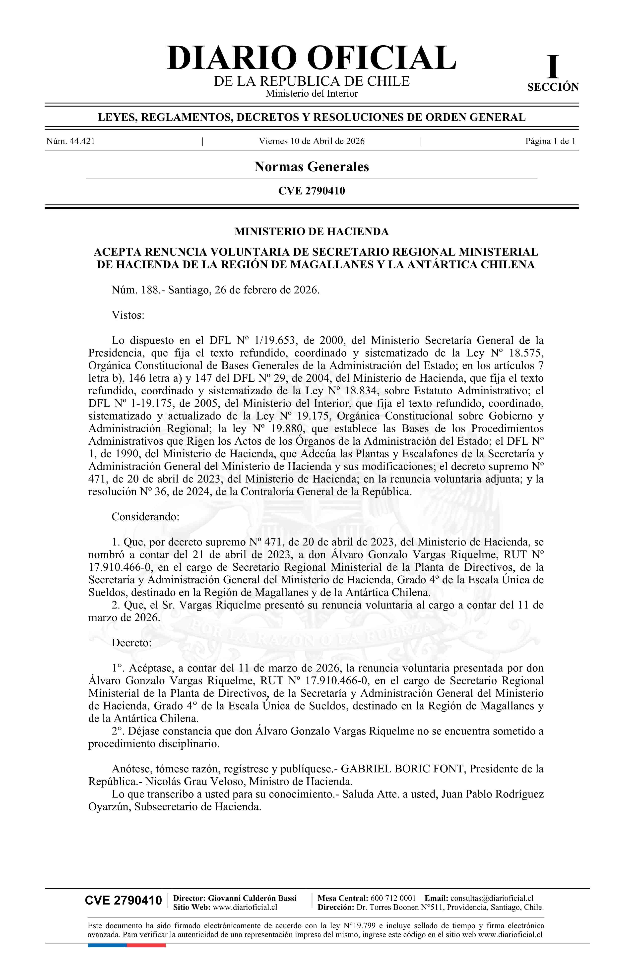 Título: Decreto número 188, de 2026.- Acepta renuncia voluntaria de don Álvaro Gonzalo Vargas Riquelme al cargo de Secretario Regional Ministerial de Hacienda de la Región de Magallanes y la Antártica Chilena