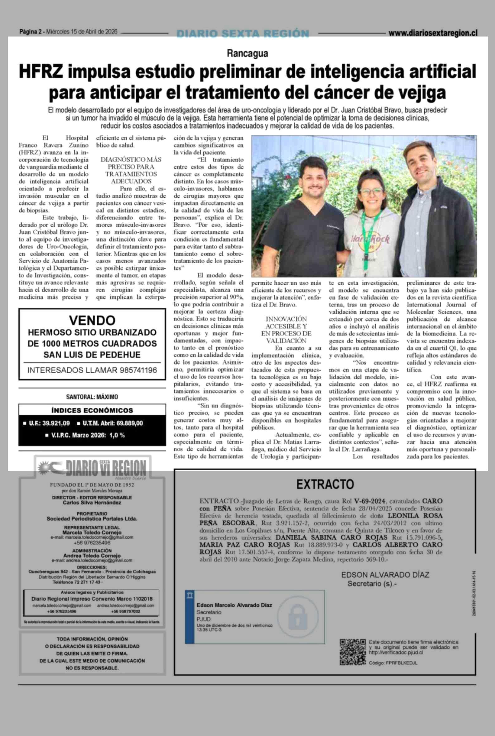 HFRZ impulsa estudio preliminar de inteligencia artificial para anticipar el tratamiento del cáncer de vejiga 15-04-2026 Diario VI Región |